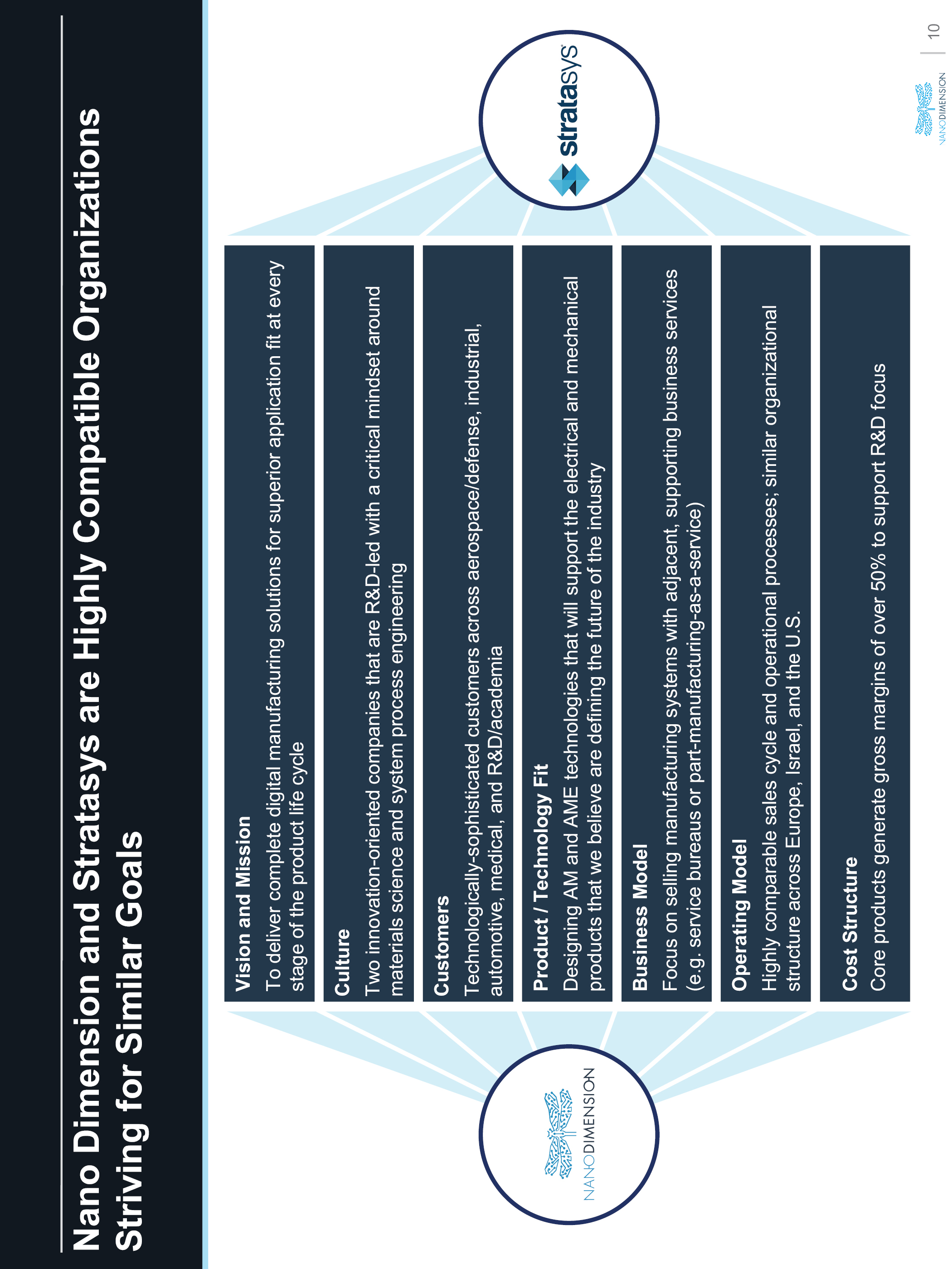 Nano Dimension and Stratasys are Highly Compatible Organizations Striving for Similar Goals Vision and Mission To deliver complete digital manufacturing solutions for superior application fit at every stage of the product life cycle Operating Model Highly comparable sales cycle and operational processes; similar organizational structure across Europe, Israel, and the U.S. Product / Technology Fit Designing AM and AMEtechnologies that will support the electrical and mechanical products that we believe are defining the future of the industry Culture Two innovation-oriented companies that are R&D-led with a critical mindset around materials science and system process engineering Business Model Focus on selling manufacturing systems with adjacent, supporting business services (e.g.service bureaus or part-manufacturing-as-a-service) Cost Structure Core products generate gross margins of over 50% to support R&D focus Customers Technologically-sophisticated customers across aerospace/defense, industrial, automotive, medical, and R&D/academia