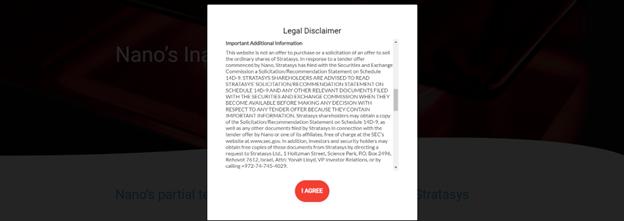 This communication is not an offer to purchase or a solicitation of an offer to sell the ordinary shares of Stratasys. In response to a tender offer commenced by Nano, Stratasys has filed with the Securities and Exchange Commission a Solicitation/Recommendation Statement on Schedule 14D-9. STRATASYS SHAREHOLDERS ARE ADVISED TO READ STRATASYS’ SOLICITATION/RECOMMENDATION STATEMENT ON SCHEDULE 14D-9 AND ANY OTHER RELEVANT DOCUMENTS FILED WITH THE SECURITIES AND EXCHANGE COMMISSION WHEN THEY BECOME AVAILABLE BEFORE MAKING ANY DECISION WITH RESPECT TO ANY TENDER OFFER BECAUSE THEY CONTAIN IMPORTANT INFORMATION. Stratasys shareholders may obtain a copy of the Solicitation/Recommendation Statement on Schedule 14D-9, as well as any other documents filed by Stratasys in connection with the tender offer by Nano or one of its affiliates, free of charge at the SEC’s website at www.sec.gov. In addition, investors and security holders may obtain free copies of these documents from Stratasys by directing a request to Stratasys Ltd., 1 Holtzman Street, Science Park, P.O. Box 2496, Rehovot 7612, Israel, Attn: Yonah Lloyd, VP Investor Relations, or by calling +972-74-745-4029.