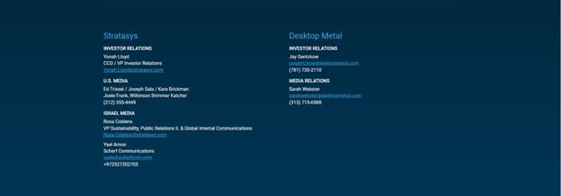 In connection with the proposed transaction with Desktop Metal, Stratasys also intends to file with the SEC a registration statement on Form F-4 that will include a joint proxy statement of Stratasys and Desktop Metal and that also constitutes a prospectus of Stratasys. Each of Stratasys and Desktop Metal may also file other relevant documents with the SEC regarding the proposed transaction. This document is not a substitute for the joint proxy statement/prospectus or registration statement or any other document that Stratasys or Desktop Metal may file with the SEC. The definitive joint proxy statement/prospectus (if and when available) will be mailed to shareholders of Stratasys and Desktop Metal. INVESTORS AND SECURITY HOLDERS ARE URGED TO READ THE REGISTRATION STATEMENT, THE JOINT PROXY STATEMENT/PROSPECTUS AND ANY OTHER RELEVANT DOCUMENTS THAT MAY BE FILED WITH THE SEC, AS WELL AS ANY AMENDMENTS OR SUPPLEMENTS TO THESE DOCUMENTS, CAREFULLY AND IN THEIR ENTIRETY IF AND WHEN THEY BECOME AVAILABLE BECAUSE THEY CONTAIN OR WILL CONTAIN IMPORTANT INFORMATION ABOUT THE PROPOSED TRANSACTION. Investors and security holders will be able to obtain free copies of the registration statement and joint proxy statement/prospectus (if and when available) and other documents containing important information about Stratasys, Desktop Metal and the proposed transaction, once such documents are filed with the SEC through the website maintained by the SEC at http://www.sec.gov. Copies of the documents filed with, or furnished, to the SEC by Stratasys will be available free of charge on Stratasys’ website at https://investors.stratasys.com/sec-filings. Copies of the documents filed with the SEC by Desktop Metal will be available free of charge on Desktop Metal’s website at https://ir.desktopmetal.com/sec-filings/all-sec-filings.