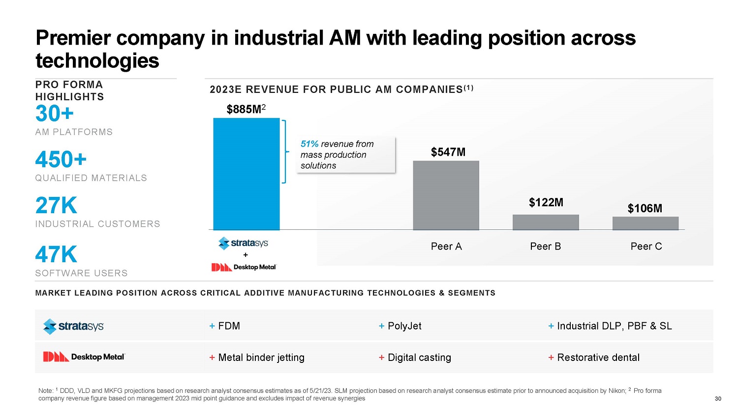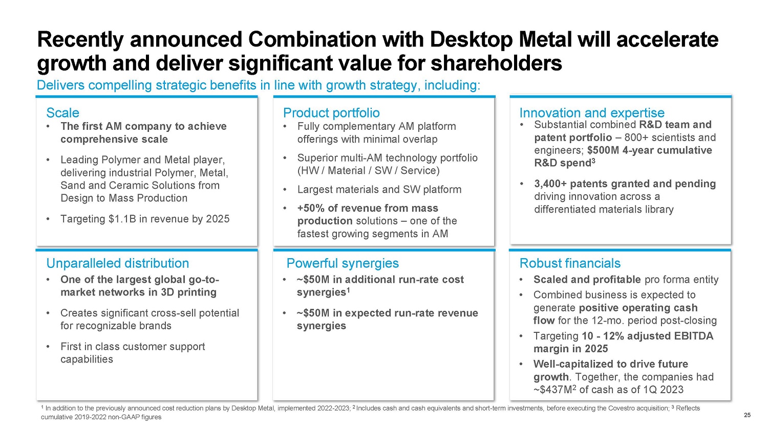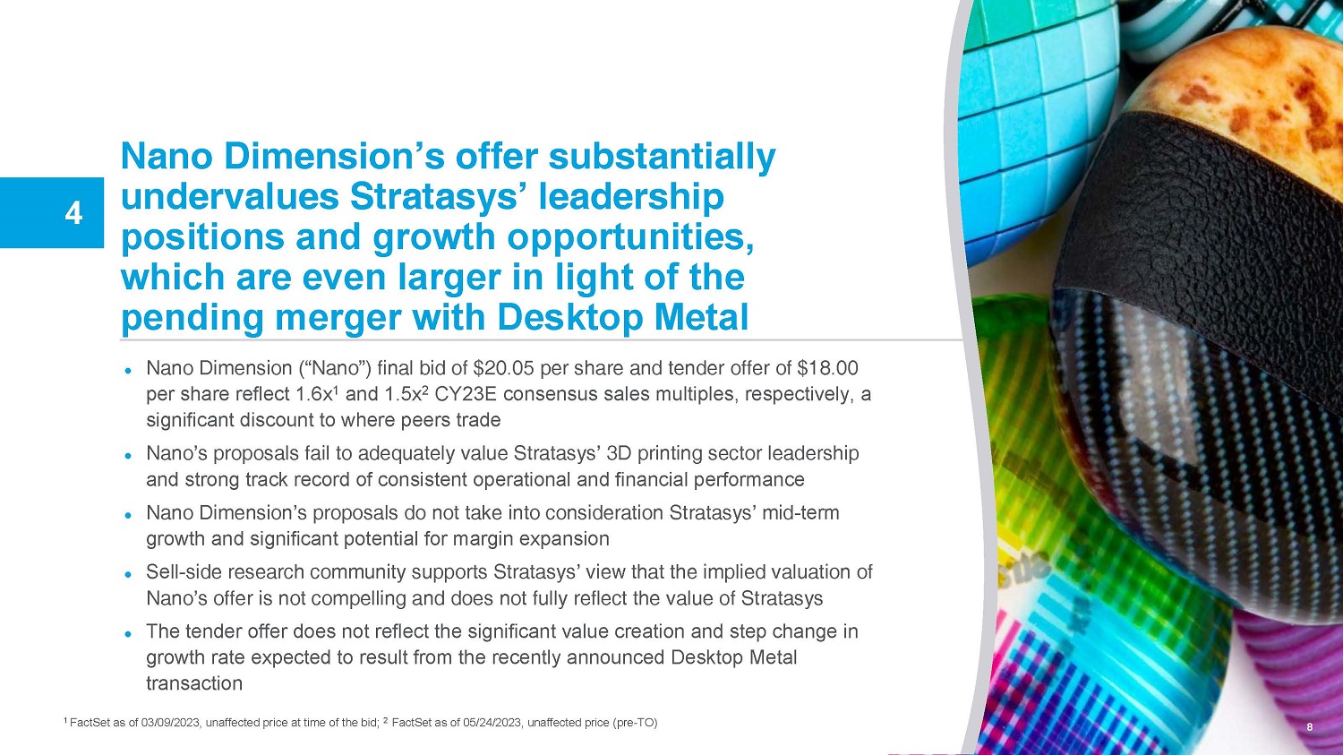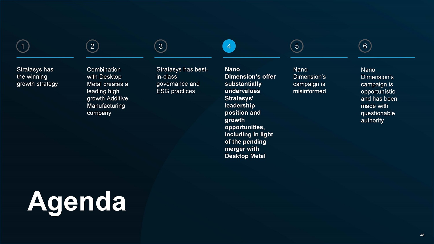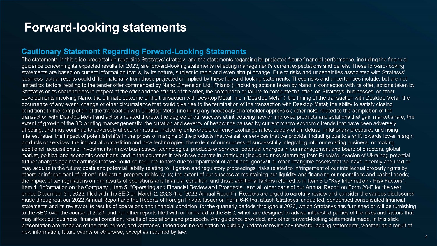 Such forward-looking statements include statements relating to the proposed transaction between Stratasys and Desktop Metal, Inc. (“Desktop Metal”), including statements regarding the benefits of the transaction and the anticipated timing of the transaction, and information regarding the businesses of Stratasys and Desktop Metal, including expectations regarding outlook and all underlying assumptions, Stratasys’ and Desktop Metal’s objectives, plans and strategies, information relating to operating trends in markets where Stratasys and Desktop Metal operate, statements that contain projections of results of operations or of financial condition and all other statements other than statements of historical fact that address activities, events or developments that Stratasys or Desktop Metal intends, expects, projects, believes or anticipates will or may occur in the future. Such statements are based on management’s beliefs and assumptions made based on information currently available to management. All statements in this communication, other than statements of historical fact, are forward-looking statements that may be identified by the use of the words “outlook,” “guidance,” “expects,” “believes,” “anticipates,” “should,” “estimates,” and similar expressions. These forward-looking statements involve known and unknown risks and uncertainties, which may cause Stratasys’ or Desktop Metal’s actual results and performance to be materially different from those expressed or implied in the forward-looking statements. Factors and risks that may impact future results and performance include, but are not limited to those factors and risks described in Item 3.D “Key Information - Risk Factors”, Item 4 “Information on the Company”, and Item 5 “Operating and Financial Review and Prospects” in Stratasys’ Annual Report on Form 20-F for the year ended December 31, 2022 and Part 1, Item 1A, “Risk Factors” in Desktop Metal’s Annual Report on Form 10-K for the year ended December 31, 2022, each filed with the Securities and Exchange Commission (the “SEC”), and in other filings by Stratasys and Desktop Metal with the SEC. These include, but are not limited to: factors relating to the partial tender offer commenced by Nano Dimension Ltd. (“Nano”), including actions taken by Nano in connection with the offer, actions taken by Stratasys or its shareholders in respect of the offer and the effects of the offer on Stratasys’ businesses, or other developments involving Nano, the ultimate outcome of the proposed transaction between Stratasys and Desktop Metal, including the possibility that Stratasys or Desktop Metal shareholders will reject the proposed transaction; the effect of the announcement of the proposed transaction on the ability of Stratasys and Desktop Metal to operate their respective businesses and retain and hire key personnel and to maintain favorable business relationships; the timing of the proposed transaction; the occurrence of any event, change or other circumstance that could give rise to the termination of the proposed transaction; the ability to satisfy closing conditions to the completion of the proposed transaction (including any necessary shareholder approvals); other risks related to the completion of the proposed transaction and actions related thereto; changes in demand for Stratasys’ or Desktop Metal’s products and services; global market, political and economic conditions, and in the countries in which Stratasys and Desktop Metal operate in particular; government regulations and approvals; the extent of growth of the 3D printing market generally; the global macro-economic environment, including headwinds caused by inflation, rising interest rates, unfavorable currency exchange rates and potential recessionary conditions; the impact of shifts in prices or margins of the products that Stratasys or Desktop Metal sells or services Stratasys or Desktop Metal provides, including due to a shift towards lower margin products or services; the potential adverse impact that recent global interruptions and delays involving freight carriers and other third parties may have on Stratasys’ or Desktop Metal’s supply chain and distribution network and consequently, Stratasys’ or Desktop Metal’s ability to successfully sell both existing and newly-launched 3D printing products; litigation and regulatory proceedings, including any proceedings that may be instituted against Stratasys or Desktop Metal related to the proposed transaction; impacts of rapid technological change in the additive manufacturing industry, which requires Stratasys and Desktop Metal to continue to develop new products and innovations to meet constantly evolving customer demands and which could adversely affect market adoption of Stratasys’ or Desktop Metal’s products; and disruptions of Stratasys’ or Desktop Metal’s information technology systems.