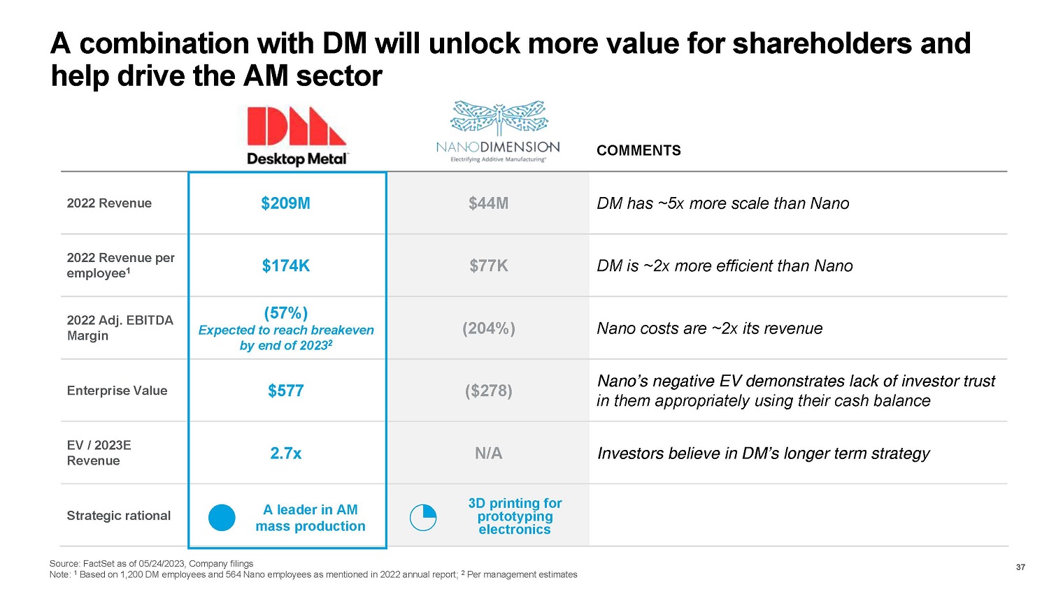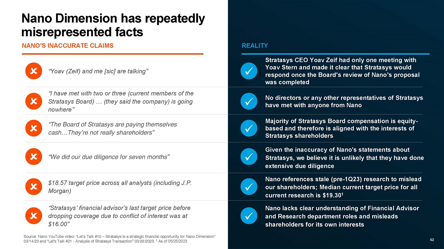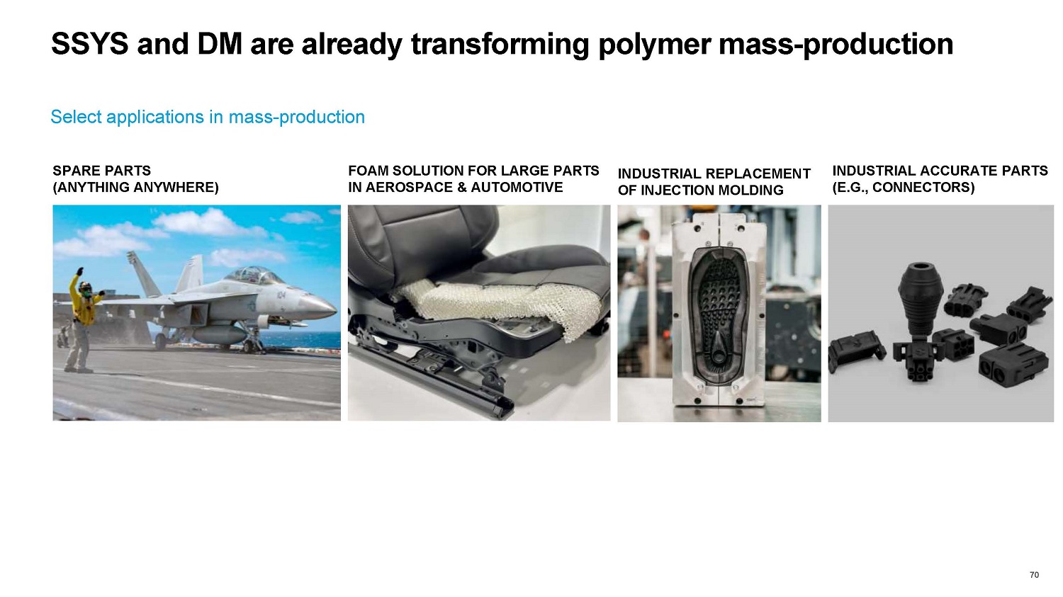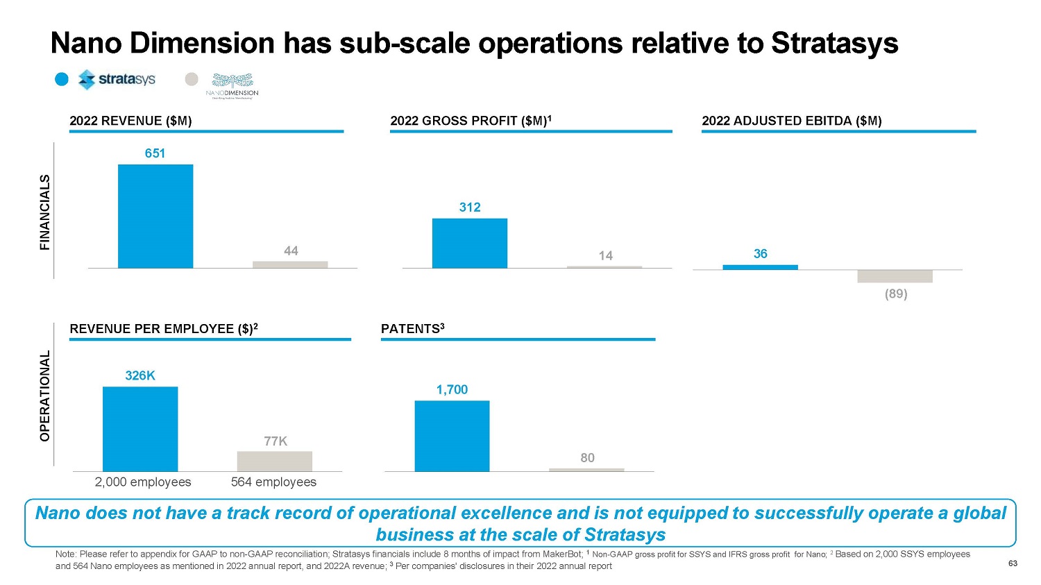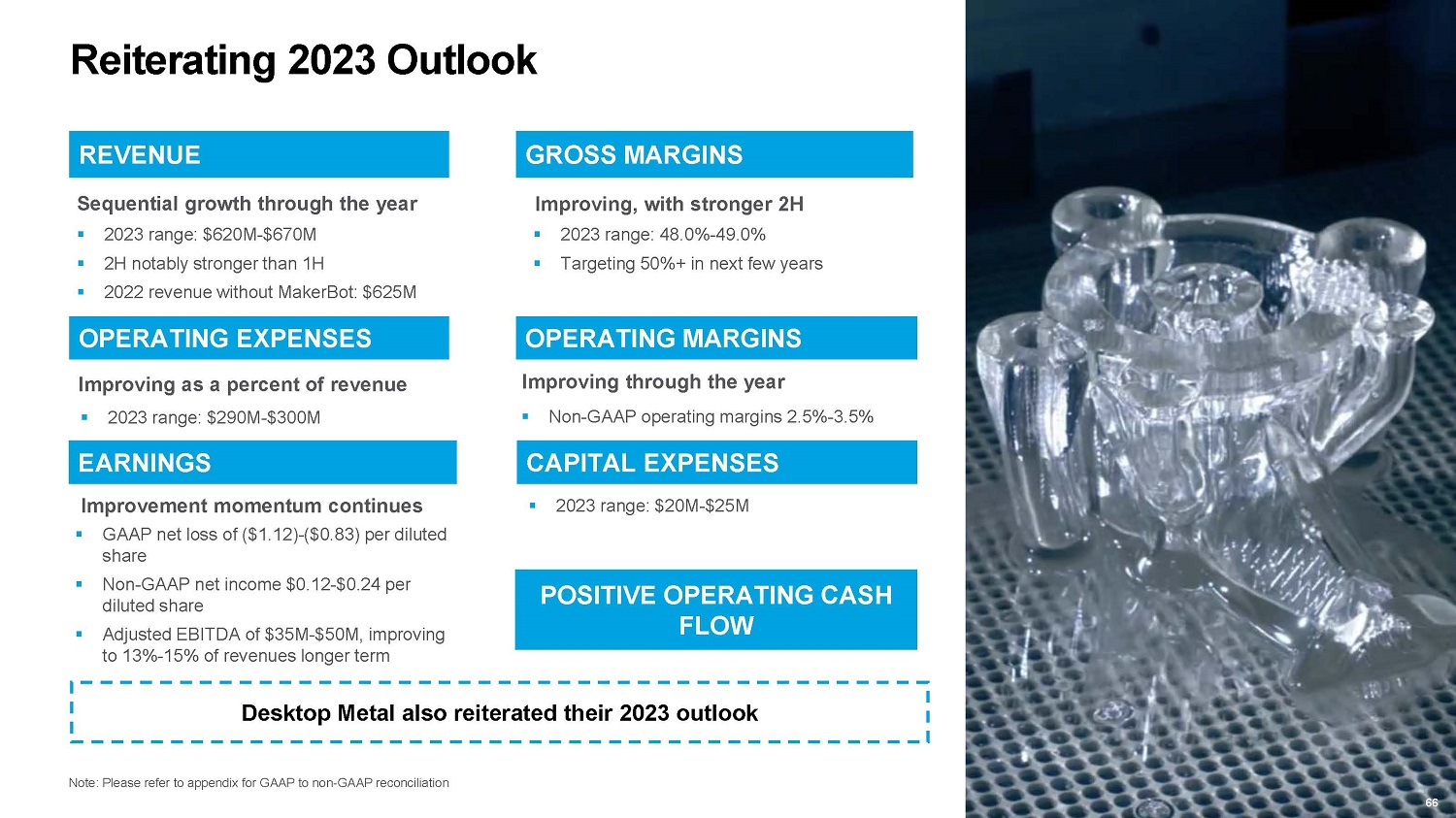 Such forward-looking statements include statements relating to the proposed transaction between Stratasys and Desktop Metal, Inc. (“Desktop Metal”), including statements regarding the benefits of the transaction and the anticipated timing of the transaction, and information regarding the businesses of Stratasys and Desktop Metal, including expectations regarding outlook and all underlying assumptions, Stratasys’ and Desktop Metal’s objectives, plans and strategies, information relating to operating trends in markets where Stratasys and Desktop Metal operate, statements that contain projections of results of operations or of financial condition and all other statements other than statements of historical fact that address activities, events or developments that Stratasys or Desktop Metal intends, expects, projects, believes or anticipates will or may occur in the future. Such statements are based on management’s beliefs and assumptions made based on information currently available to management. All statements in this communication, other than statements of historical fact, are forward-looking statements that may be identified by the use of the words “outlook,” “guidance,” “expects,” “believes,” “anticipates,” “should,” “estimates,” and similar expressions. These forward-looking statements involve known and unknown risks and uncertainties, which may cause Stratasys’ or Desktop Metal’s actual results and performance to be materially different from those expressed or implied in the forward-looking statements. Factors and risks that may impact future results and performance include, but are not limited to those factors and risks described in Item 3.D “Key Information - Risk Factors”, Item 4 “Information on the Company”, and Item 5 “Operating and Financial Review and Prospects” in Stratasys’ Annual Report on Form 20-F for the year ended December 31, 2022 and Part 1, Item 1A, “Risk Factors” in Desktop Metal’s Annual Report on Form 10-K for the year ended December 31, 2022, each filed with the Securities and Exchange Commission (the “SEC”), and in other filings by Stratasys and Desktop Metal with the SEC. These include, but are not limited to: factors relating to the partial tender offer commenced by Nano Dimension Ltd. (“Nano”), including actions taken by Nano in connection with the offer, actions taken by Stratasys or its shareholders in respect of the offer and the effects of the offer on Stratasys’ businesses, or other developments involving Nano, the ultimate outcome of the proposed transaction between Stratasys and Desktop Metal, including the possibility that Stratasys or Desktop Metal shareholders will reject the proposed transaction; the effect of the announcement of the proposed transaction on the ability of Stratasys and Desktop Metal to operate their respective businesses and retain and hire key personnel and to maintain favorable business relationships; the timing of the proposed transaction; the occurrence of any event, change or other circumstance that could give rise to the termination of the proposed transaction; the ability to satisfy closing conditions to the completion of the proposed transaction (including any necessary shareholder approvals); other risks related to the completion of the proposed transaction and actions related thereto; changes in demand for Stratasys’ or Desktop Metal’s products and services; global market, political and economic conditions, and in the countries in which Stratasys and Desktop Metal operate in particular; government regulations and approvals; the extent of growth of the 3D printing market generally; the global macro-economic environment, including headwinds caused by inflation, rising interest rates, unfavorable currency exchange rates and potential recessionary conditions; the impact of shifts in prices or margins of the products that Stratasys or Desktop Metal sells or services Stratasys or Desktop Metal provides, including due to a shift towards lower margin products or services; the potential adverse impact that recent global interruptions and delays involving freight carriers and other third parties may have on Stratasys’ or Desktop Metal’s supply chain and distribution network and consequently, Stratasys’ or Desktop Metal’s ability to successfully sell both existing and newly-launched 3D printing products; litigation and regulatory proceedings, including any proceedings that may be instituted against Stratasys or Desktop Metal related to the proposed transaction; impacts of rapid technological change in the additive manufacturing industry, which requires Stratasys and Desktop Metal to continue to develop new products and innovations to meet constantly evolving customer demands and which could adversely affect market adoption of Stratasys’ or Desktop Metal’s products; and disruptions of Stratasys’ or Desktop Metal’s information technology systems.