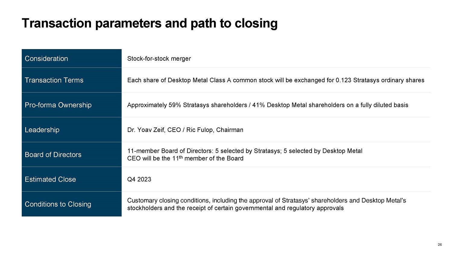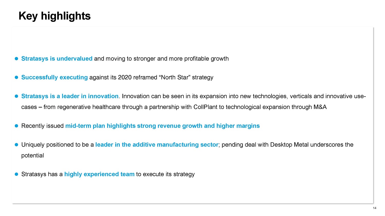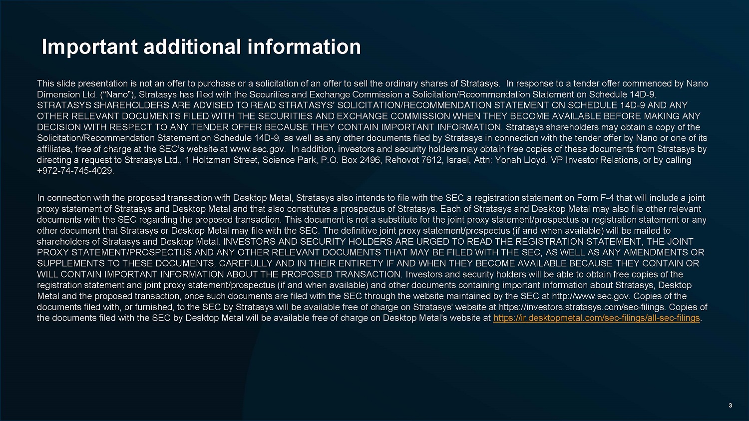 In connection with the proposed transaction, Stratasys intends to file with the SEC a registration statement on Form F-4 that will include a joint proxy statement of Stratasys and Desktop Metal and that also constitutes a prospectus of Stratasys. Each of Stratasys and Desktop Metal may also file other relevant documents with the SEC regarding the proposed transaction. This document is not a substitute for the joint proxy statement/prospectus or registration statement or any other document that Stratasys or Desktop Metal may file with the SEC. The definitive joint proxy statement/prospectus (if and when available) will be mailed to shareholders of Stratasys and Desktop Metal. INVESTORS AND SECURITY HOLDERS ARE URGED TO READ THE REGISTRATION STATEMENT, THE JOINT PROXY STATEMENT/PROSPECTUS AND ANY OTHER RELEVANT DOCUMENTS THAT MAY BE FILED WITH THE SEC, AS WELL AS ANY AMENDMENTS OR SUPPLEMENTS TO THESE DOCUMENTS, CAREFULLY AND IN THEIR ENTIRETY IF AND WHEN THEY BECOME AVAILABLE BECAUSE THEY CONTAIN OR WILL CONTAIN IMPORTANT INFORMATION ABOUT THE PROPOSED TRANSACTION. Investors and security holders will be able to obtain free copies of the registration statement and joint proxy statement/prospectus (if and when available) and other documents containing important information about Stratasys, Desktop Metal and the proposed transaction, once such documents are filed with the SEC through the website maintained by the SEC at http://www.sec.gov. Copies of the documents filed with, or furnished, to the SEC by Stratasys will be available free of charge on Stratasys’ website at https://investors.stratasys.com/sec-filings. Copies of the documents filed with the SEC by Desktop Metal will be available free of charge on Desktop Metal’s website at https://ir.desktopmetal.com/sec-filings/all-sec-filings.