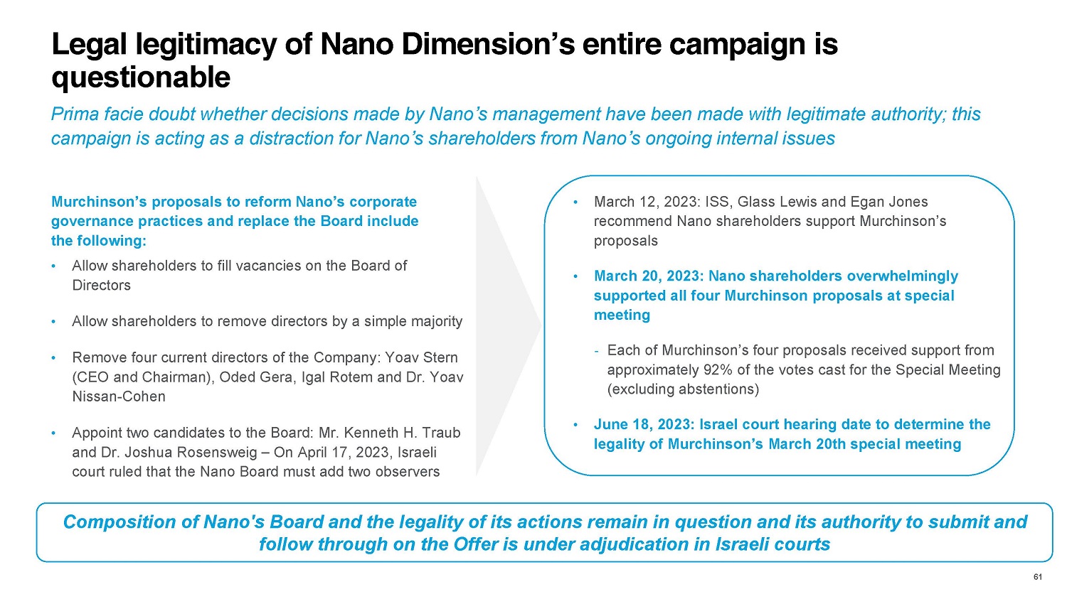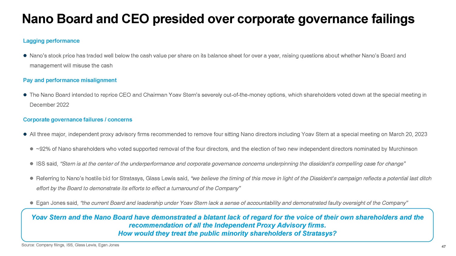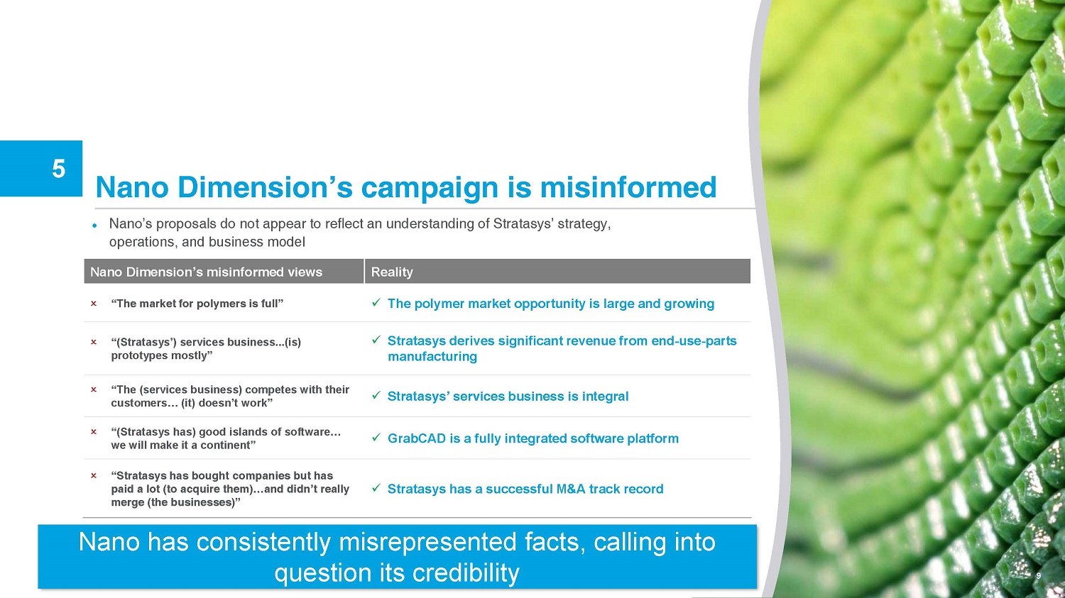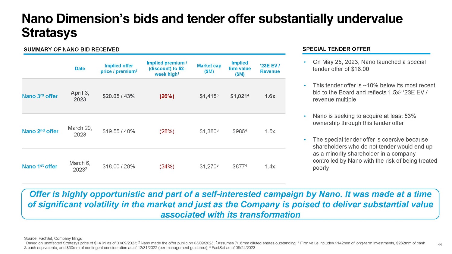 This communication is not an offer to purchase or a solicitation of an offer to sell the ordinary shares of Stratasys. In response to a tender offer commenced by Nano, Stratasys has filed with the Securities and Exchange Commission a Solicitation/Recommendation Statement on Schedule 14D-9. STRATASYS SHAREHOLDERS ARE ADVISED TO READ STRATASYS’ SOLICITATION/RECOMMENDATION STATEMENT ON SCHEDULE 14D-9 AND ANY OTHER RELEVANT DOCUMENTS FILED WITH THE SECURITIES AND EXCHANGE COMMISSION WHEN THEY BECOME AVAILABLE BEFORE MAKING ANY DECISION WITH RESPECT TO ANY TENDER OFFER BECAUSE THEY CONTAIN IMPORTANT INFORMATION. Stratasys shareholders may obtain a copy of the Solicitation/Recommendation Statement on Schedule 14D-9, as well as any other documents filed by Stratasys in connection with the tender offer by Nano or one of its affiliates, free of charge at the SEC’s website at www.sec.gov. In addition, investors and security holders may obtain free copies of these documents from Stratasys by directing a request to Stratasys Ltd., 1 Holtzman Street, Science Park, P.O. Box 2496, Rehovot 7612, Israel, Attn: Yonah Lloyd, VP Investor Relations, or by calling +972-74-745-4029.