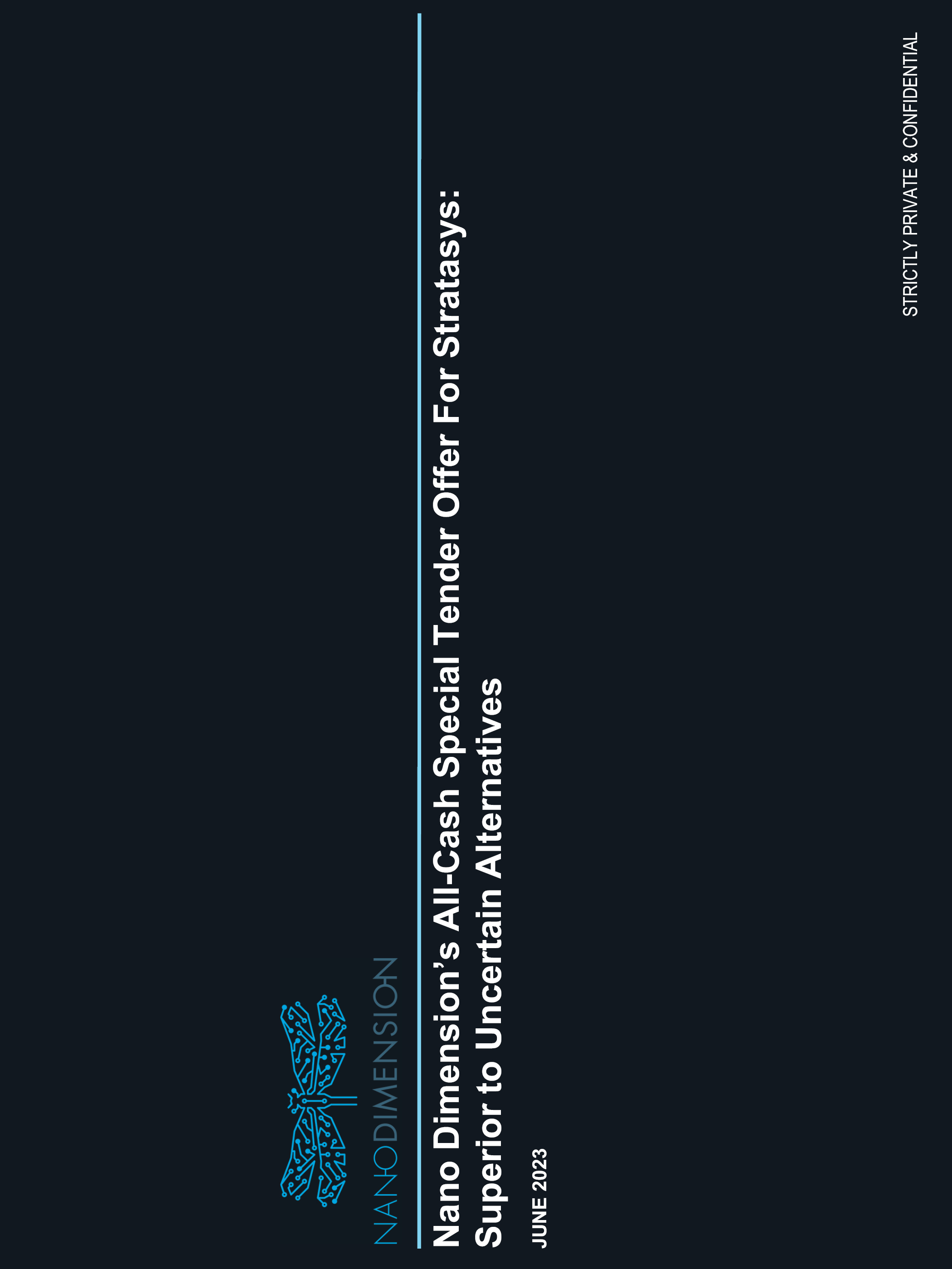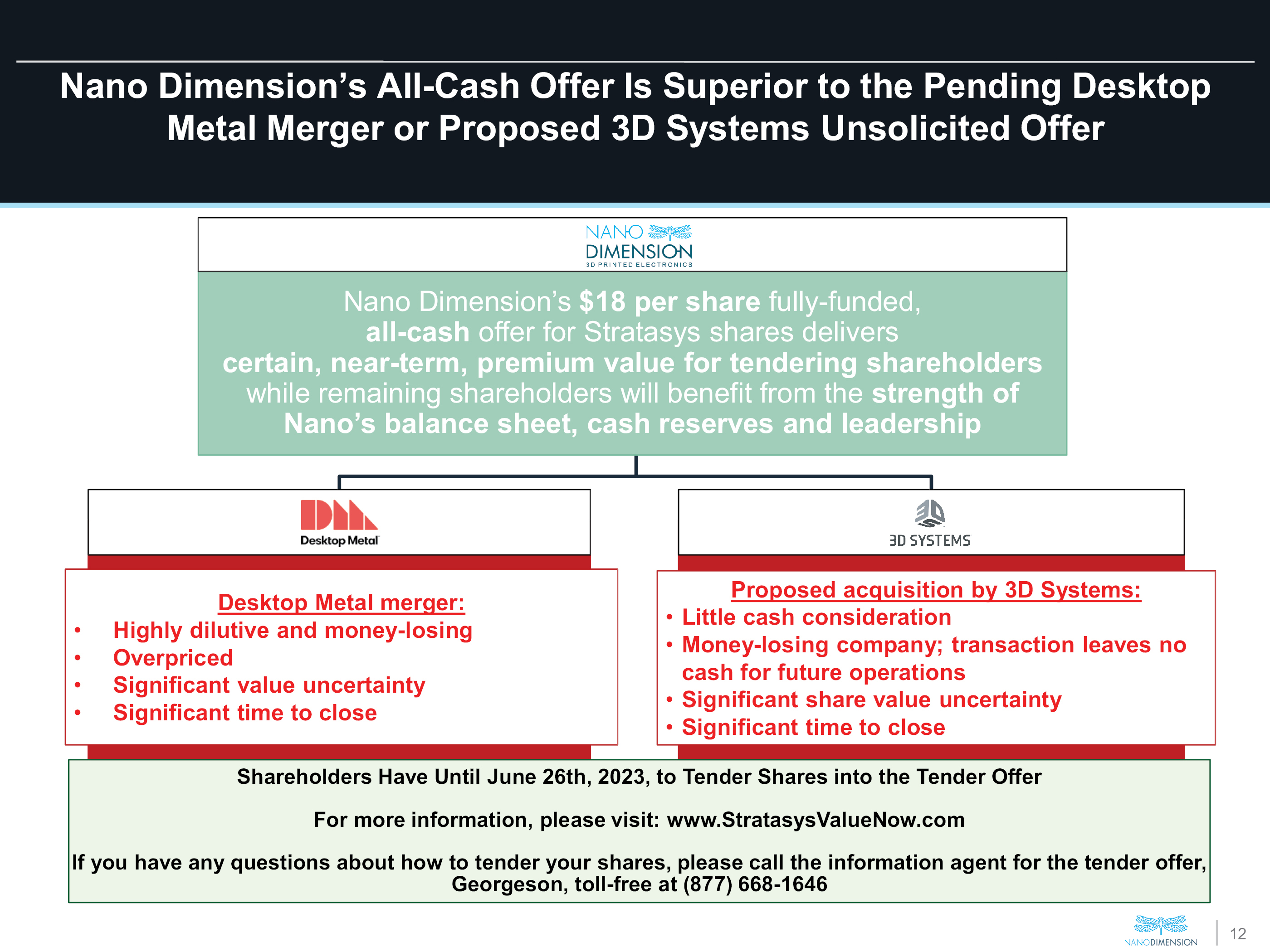 Nano Dimension’s All-Cash Offer Is Superior to the Pending Desktop Metal Merger or Proposed 3D Systems Unsolicited Offer Nano Dimension’s $18 per share fully-funded, all-cash offer for Stratasys shares delivers certain, near-term, premium value for tendering shareholders while remaining shareholders will benefit from the strength of Nano’s balance sheet, cash reserves and leadership Desktop Metal merger: Highly dilutive and money-losing Overpriced Significant value uncertainty Significant time to close Proposed acquisition by 3D Systems: Little cash consideration Money-losing company; transaction leaves no cash for future operations Significant share value uncertainty Significant time to close Shareholders Have Until June 26th, 2023, to Tender Shares into the Tender Offer For more information, please visit: www.StratasysValueNow.com If you have any questions about how to tender your shares, please call the information agent for the tender offer, Georgeson, toll-free at (877) 668-1646
