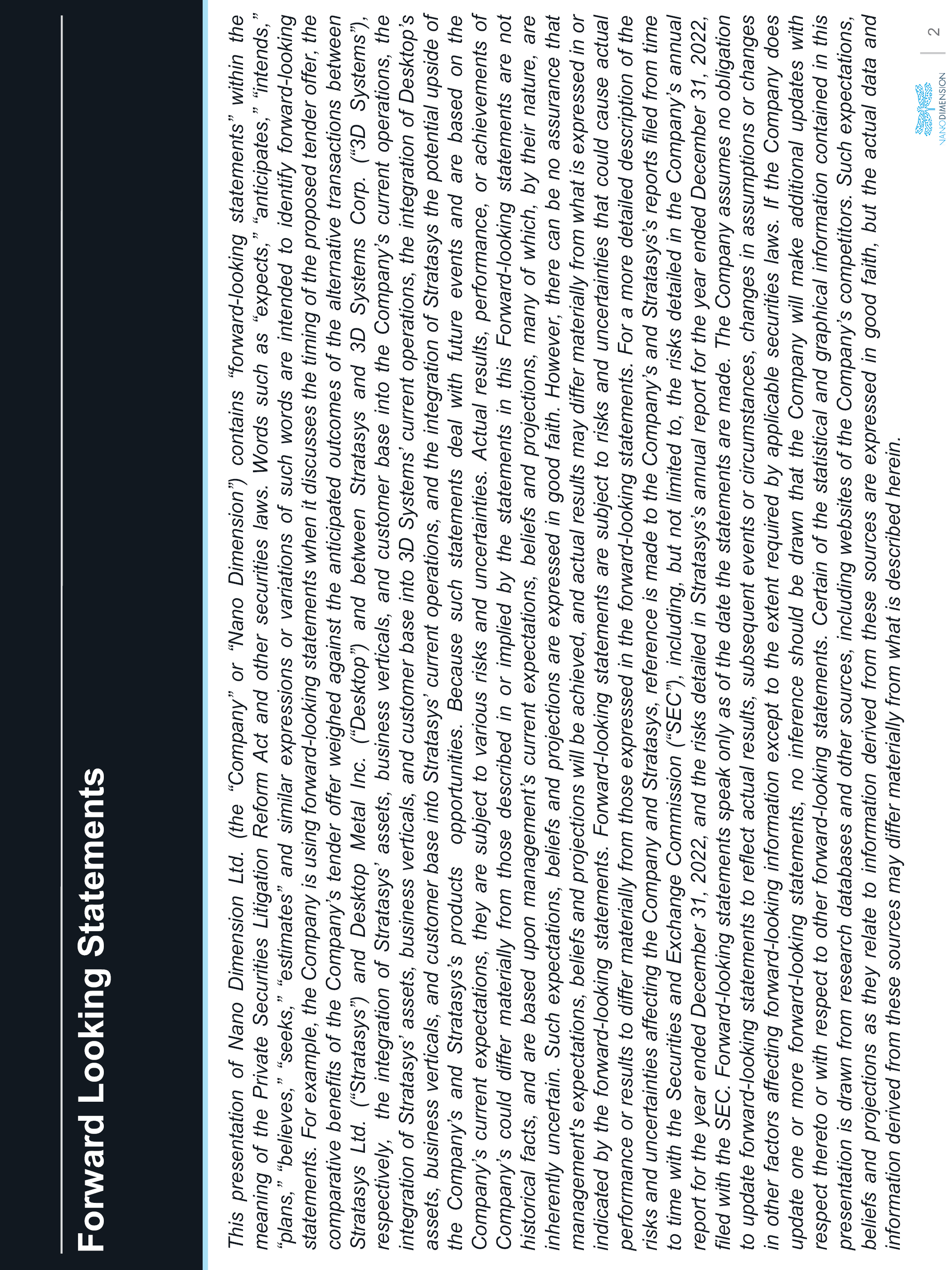 Forward Looking Statements This presentation of Nano Dimension Ltd. (the “Company” or “Nano Dimension”) contains “forward-looking statements” within the meaning of the Private Securities Litigation Reform Act and other securities laws. Words such as “expects,” “anticipates,” “intends,” “plans,” “believes,” “seeks,” “estimates” and similar expressions or variations of such words are intended to identify forward-looking statements. For example, the Company is using forward-looking statements when it discusses the timing of the proposed tender offer, the comparative benefits of the Company’s tender offer weighed against the anticipated outcomes of the alternative transactions between Stratasys Ltd. (“Stratasys”) and Desktop Metal Inc. (“Desktop”) and between Stratasys and 3D Systems Corp. (“3D Systems”), respectively, the integration of Stratasys’ assets, business verticals, and customer base into the Company’s current operations, the integration of Stratasys’ assets, business verticals, and customer base into 3D Systems’ current operations, the integration of Desktop’s assets, business verticals, and customer base into Stratasys’ current operations, and the integration of Stratasys the potential upside of the Company’s and Stratasys’s products opportunities. Because such statements deal with future events and are based on the Company’s current expectations, they are subject to various risks and uncertainties. Actual results, performance, or achievements of Company’s could differ materially from those described in or implied by the statements in this Forward-looking statements are not historical facts, and are based upon management’s current expectations, beliefs and projections, many of which, by their nature, are inherently uncertain. Such expectations, beliefs and projections are expressed in good faith. However, there can be no assurance that management’s expectations, beliefs and projections will be achieved, and actual results may differ materially from what is expressed in or indicated by the forward-looking statements. Forward-looking statements are subject to risks and uncertainties that could cause actual performance or results to differ materially from those expressed in the forward-looking statements. For a more detailed description of the risks and uncertainties affecting the Company and Stratasys, reference is made to the Company’s and Stratasys’s reports filed from time to time with the Securities and Exchange Commission (“SEC”), including, but not limited to, the risks detailed in the Company’s annual report for the year ended December 31, 2022, and the risks detailed in Stratasys’s annual report for the year ended December 31, 2022, filed with the SEC. Forward-looking statements speak only as of the date the statements are made. The Company assumes no obligation to update forward-looking statements to reflect actual results, subsequent events or circumstances, changes in assumptions or changes in other factors affecting forward-looking information except to the extent required by applicable securities laws. If the Company does update one or more forward-looking statements, no inference should be drawn that the Company will make additional updates with respect thereto or with respect to other forward-looking statements. Certain of the statistical and graphical information contained in this presentation is drawn from research databases and other sources, including websites of the Company’s competitors. Such expectations, beliefs and projections as they relate to information derived from these sources are expressed in good faith, but the actual data and information derived from these sources may differ materially from what is described herein.