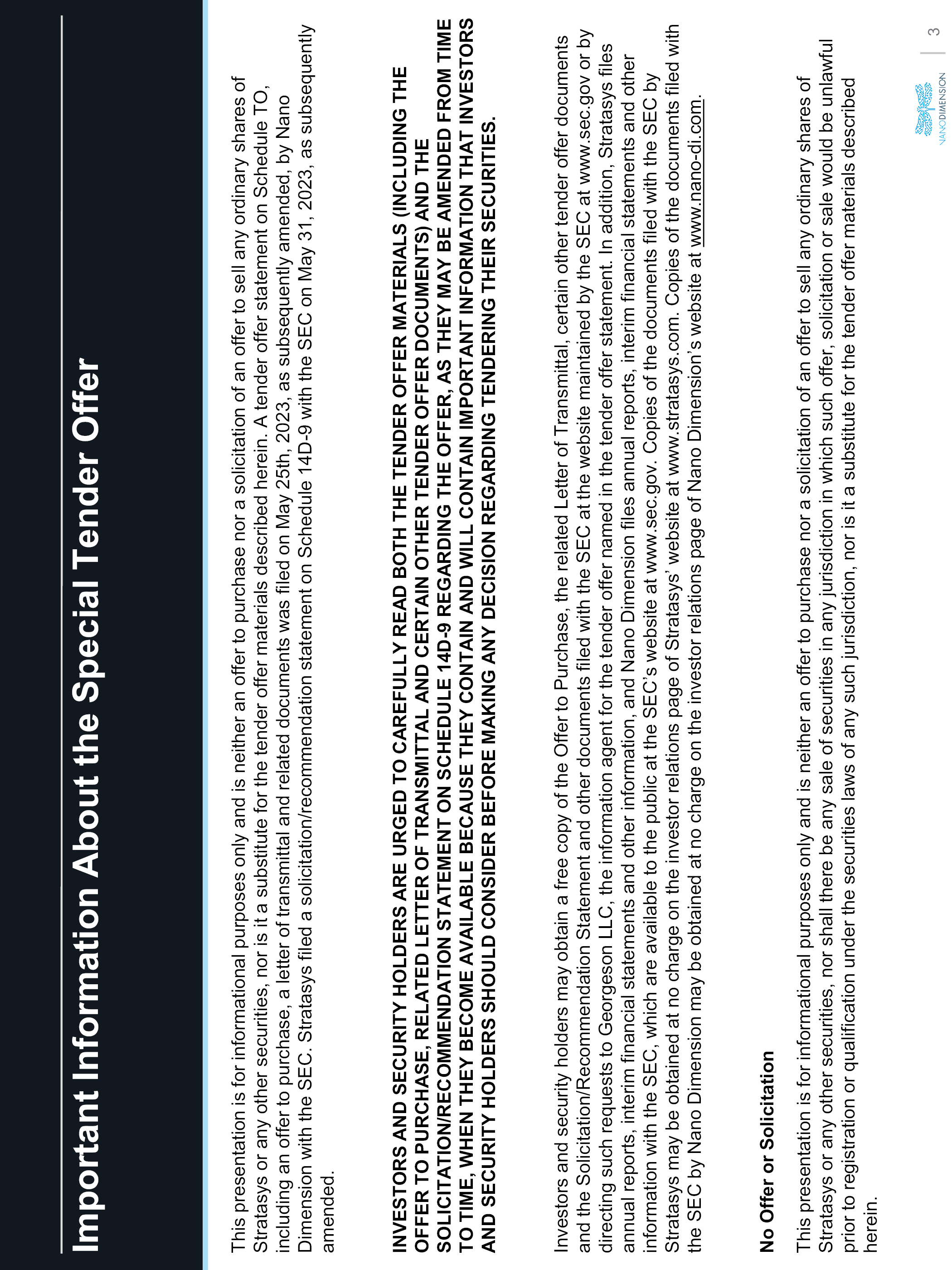 Important Information About the Special Tender Offer This presentation is for informational purposes only and is neither an offer to purchase nor a solicitation of an offer to sell any ordinary shares of Stratasys or any other securities, nor is it a substitute for the tender offer materials described herein. A tenderoffer statement on Schedule TO, including an offer to purchase, a letter of transmittal and related documents was filed on May 25th, 2023by Nano Dimension with the SEC and we expect that Stratasys will file a solicitation/recommendation statement on Schedule 14D-9 with theSEC as required by the tender offer rules. INVESTORS AND SECURITY HOLDERS ARE URGED TO CAREFULLY READ BOTH THE TENDER OFFER MATERIALS (INCLUDING THE OFFER TO PURCHASE, RELATED LETTER OF TRANSMITTAL AND CERTAIN OTHER TENDER OFFER DOCUMENTS) AND THE SOLICITATION/RECOMMENDATION STATEMENT ON SCHEDULE 14D-9 REGARDING THE OFFER, AS THEY MAY BE AMENDED FROM TIME TO TIME, WHEN THEY BECOME AVAILABLE BECAUSE THEY CONTAIN AND WILL CONTAIN IMPORTANT INFORMATION THAT INVESTORS AND SECURITY HOLDERS SHOULD CONSIDER BEFORE MAKING ANY DECISION REGARDING TENDERING THEIR SECURITIES. Investors and security holders may obtain a free copy of the Offer to Purchase, the related Letter of Transmittal, certain othertender offer documents and the Solicitation/Recommendation Statement (when available) and other documents filed with the SEC at the website maintained by the Important Information About the Special Tender Offer This presentation is for informational purposes only and is neither an offer to purchase nor a solicitation of an offer to sell any ordinary shares of Stratasys or any other securities, nor is it a substitute for the tender offer materials described herein. A tender offer statement on Schedule TO, including an offer to purchase, a letter of transmittal and related documents was filed on May 25th, 2023, as subsequently amended, by Nano Dimension with the SEC. Stratasys filed a solicitation/recommendation statement on Schedule 14D-9 with the SEC on May 31, 2023, as subsequently amended. INVESTORS AND SECURITY HOLDERS ARE URGED TO CAREFULLY READ BOTH THE TENDER OFFER MATERIALS (INCLUDING THE OFFER TO PURCHASE, RELATED LETTER OF TRANSMITTAL AND CERTAIN OTHER TENDER OFFER DOCUMENTS) AND THE SOLICITATION/RECOMMENDATION STATEMENT ON SCHEDULE 14D-9 REGARDING THE OFFER, AS THEY MAY BE AMENDED FROM TIME TO TIME, WHEN THEY BECOME AVAILABLE BECAUSE THEY CONTAIN AND WILL CONTAIN IMPORTANT INFORMATION THAT INVESTORS AND SECURITY HOLDERS SHOULD CONSIDER BEFORE MAKING ANY DECISION REGARDING TENDERING THEIR SECURITIES. Investors and security holders may obtain a free copy of the Offer to Purchase, the related Letter of Transmittal, certain other tender offer documents and the Solicitation/Recommendation Statement and other documents filed with the SEC at the website maintained by the SEC at www.sec.gov or by directing such requests to Georgeson LLC, the information agent for the tender offer named in the tender offer statement. In addition, Stratasys files annual reports, interim financial statements and other information, and Nano Dimension files annual reports, interim financial statements and other information with the SEC, which are available to the public at the SEC’s website at www.sec.gov. Copies of the documents filed with the SEC by Stratasys may be obtained at no charge on the investor relations page of Stratasys’ website at www.stratasys.com. Copies of the documents filed with the SEC by Nano Dimension may be obtained at no charge on the investor relations page of Nano Dimension’s website at www.nano-di.com. No Offer or Solicitation This presentation is for informational purposes only and is neither an offer to purchase nor a solicitation of an offer to sell any ordinary shares of Stratasys or any other securities, nor shall there be any sale of securities in any jurisdiction in which such offer, solicitation or sale would be unlawful prior to registration or qualification under the securities laws of any such jurisdiction, nor is it a substitute for the tender offer materials described herein.