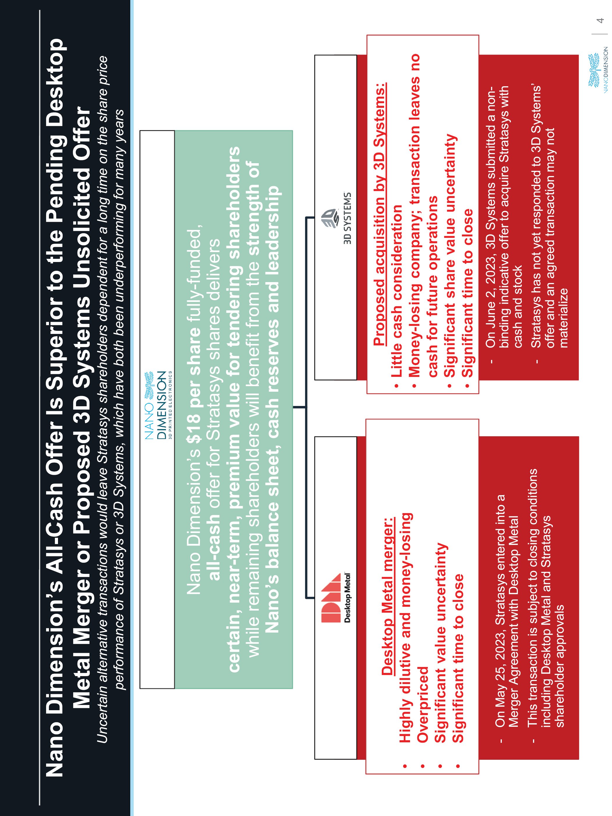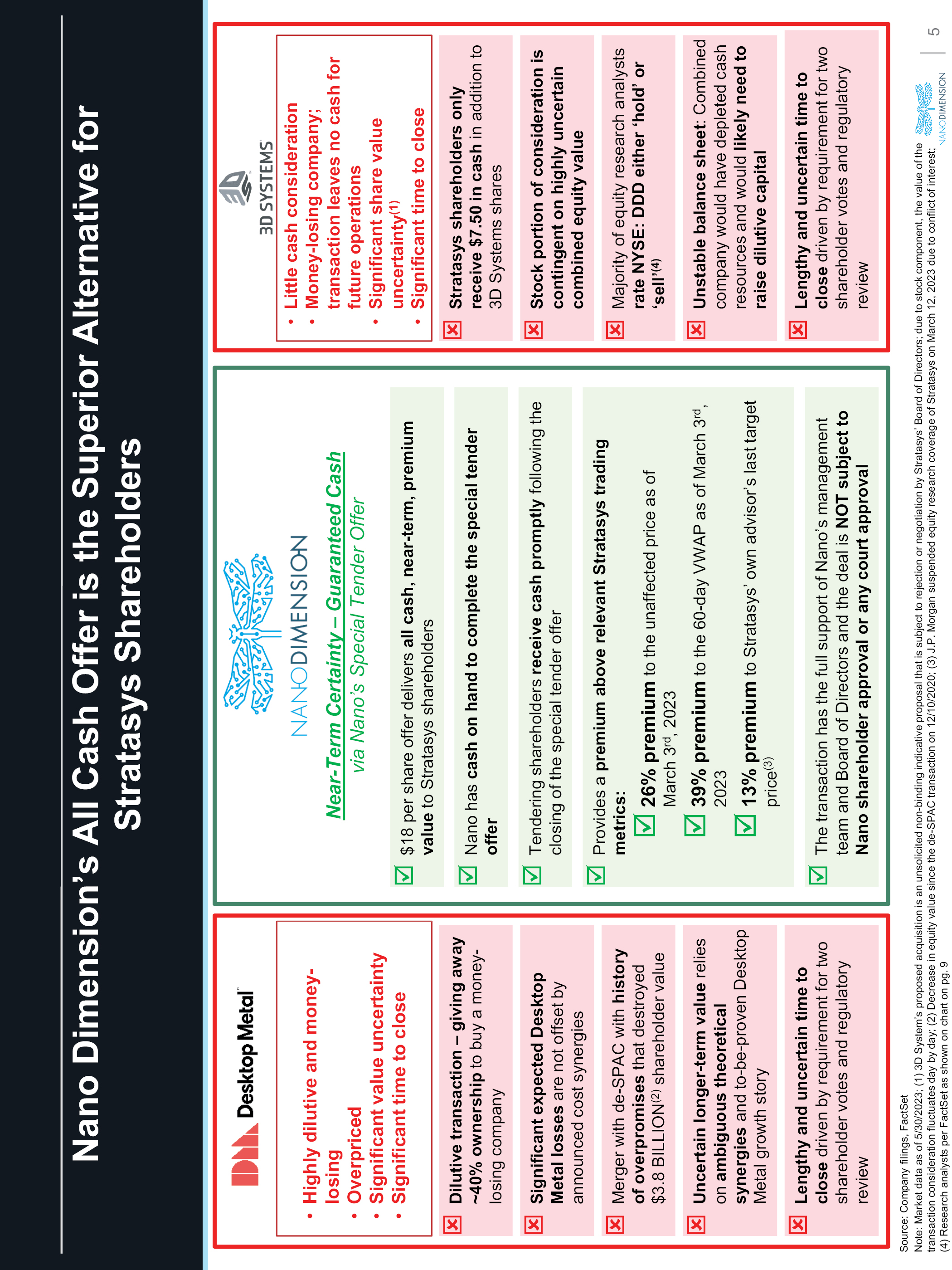 Nano Dimension’s All-Cash Offer Is Superior to the Pending Desktop Metal Merger or Proposed 3D Systems Unsolicited Offer Uncertain alternative transactions would leave Stratasys shareholders dependent for a long time on the share price performance of Stratasys or 3D Systems, which have both been underperforming for many years Nano Dimension’s $18 per share fully-funded, all-cash offer for Stratasys shares delivers certain, near-term, premium value for tendering shareholders while remaining shareholders will benefit from the strength of Nano’s balance sheet, cash reserves and leadership Desktop Metal merger: Highly dilutive and money-losing Overpriced Significant value uncertainty Significant time to close Proposed acquisition by 3D Systems: Little cash consideration Money-losing company; transaction leaves no cash for future operations Significant share value uncertainty Significant time to close On May 25, 2023, Stratasys entered into a Merger Agreement with Desktop Metal This transaction is subject to closing conditions including Desktop Metal and Stratasys shareholder approvalsOn June 2, 2023, 3D Systems submitted a non-binding indicative offer to acquire Stratasys with cash and stock Stratasys has not yet responded to 3D Systems’ offer and an agreed transaction may not materialize