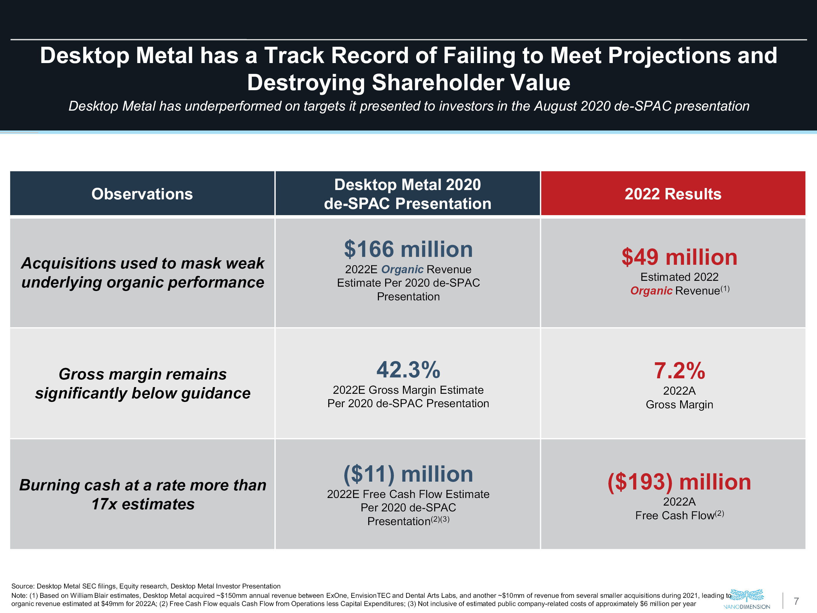 Desktop Metal has a Track Record of Failing to Meet Projections and Destroying Shareholder Value Desktop Metal has underperformed on targets it presented to investors in the August 2020 de-SPAC presentation Observations Desktop Metal 2020 de-SPAC Presentation 2022 Results Acquisitions used to mask weak underlying organic performance Gross margin remains significantly below guidance Burning cash at a rate more than 17x estimates $166 million 2022E Organic Revenue Estimate Per 2020 de-SPAC Presentation 42.3% 2022E Gross Margin Estimate Per 2020 de-SPAC Presentation ($11) million 2022E Free Cash Flow Estimate Per 2020 de-SPAC Presentation(2)(3) $49 million Estimated 2022 Organic Revenue(1) 7.2% 2022A Gross Margin ($193) million 2022A Free Cash Flow(2) Source: Desktop Metal SEC filings, Equity research, Desktop Metal Investor Presentation Note: (1) Based on William Blair estimates, Desktop Metal acquired ~$150mm annual revenue between ExOne, EnvisionTECand Dental Arts Labs, and another ~$10mm of revenue from several smaller acquisitions during 2021, leading to organic revenue estimated at $49mm for 2022A; (2) Free Cash Flow equals Cash Flow from Operations less Capital Expenditures; (3)Not inclusive of estimated public company-related costs of approximately $6 million per year