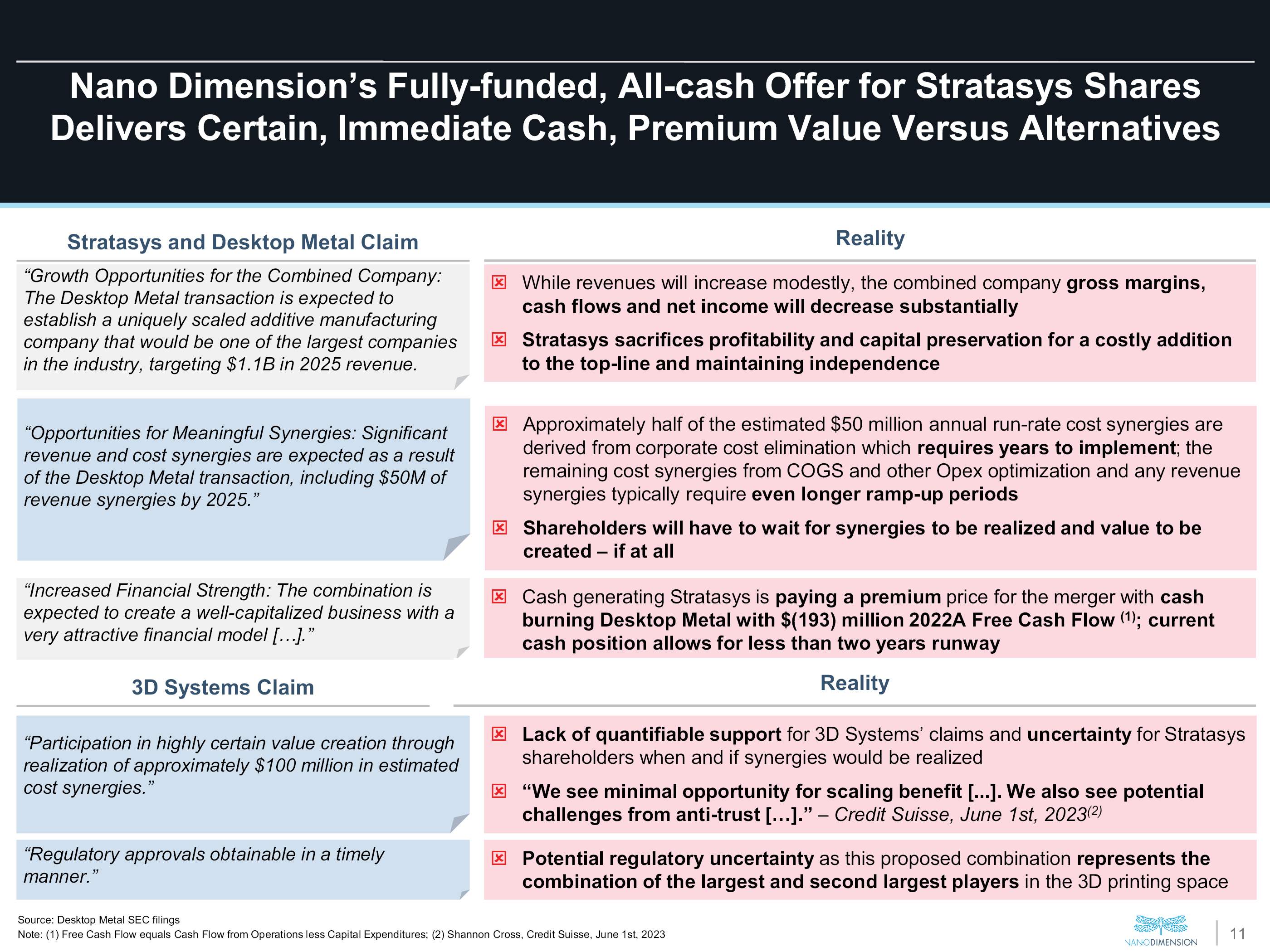 Nano Dimension’s Fully-funded, All-cash Offer for Stratasys Shares Delivers Certain, Immediate Cash, Premium Value Versus Alternatives Stratasys and Desktop Metal Claim “Growth Opportunities for the Combined Company: The Desktop Metal transaction is expected to establish a uniquely scaled additive manufacturing company that would be one of the largest companies in the industry, targeting $1.1B in 2025 revenue. “Opportunities for Meaningful Synergies: Significant revenue and cost synergies are expected as a result of the Desktop Metal transaction, including $50M of revenue synergies by 2025.” “Increased Financial Strength: The combination is expected to create a well-capitalized business with a very attractive financial model […].” 3D Systems Claim “Participation in highly certain value creation through realization of approximately $100 million in estimated cost synergies.” “Regulatory approvals obtainable in a timely manner.” Reality While revenues will increase modestly, the combined company gross margins, cash flows and net income will decrease substantially Stratasys sacrifices profitability and capital preservation for a costly addition to the top-line and maintaining independence Approximately half of the estimated $50 million annual run-rate cost synergies are derived from corporate cost elimination which requires years to implement; the remaining cost synergies from COGS and other Opex optimization and any revenue synergies typically require even longer ramp-up periods Shareholders will have to wait for synergies to be realized and value to be created – if at all Cash generating Stratasys is paying a premium price for the merger with cash burning Desktop Metal with $(193) million 2022A Free Cash Flow (1); current cash position allows for less than two years runway Lack of quantifiable support for 3D Systems’ claims and uncertainty for Stratasys shareholders when and if synergies would be realized “We see minimal opportunity for scaling benefit [...]. We also see potential challenges from anti-trust […].” – Credit Suisse, June 1st, 2023(2) Potential regulatory uncertainty as this proposed combination represents the combination of the largest and second largest players in the 3D printing space Source: Desktop Metal SEC filings Note: (1) Free Cash Flow equals Cash Flow from Operations less Capital Expenditures; (2) Shannon Cross, Credit Suisse, June 1st, 2023