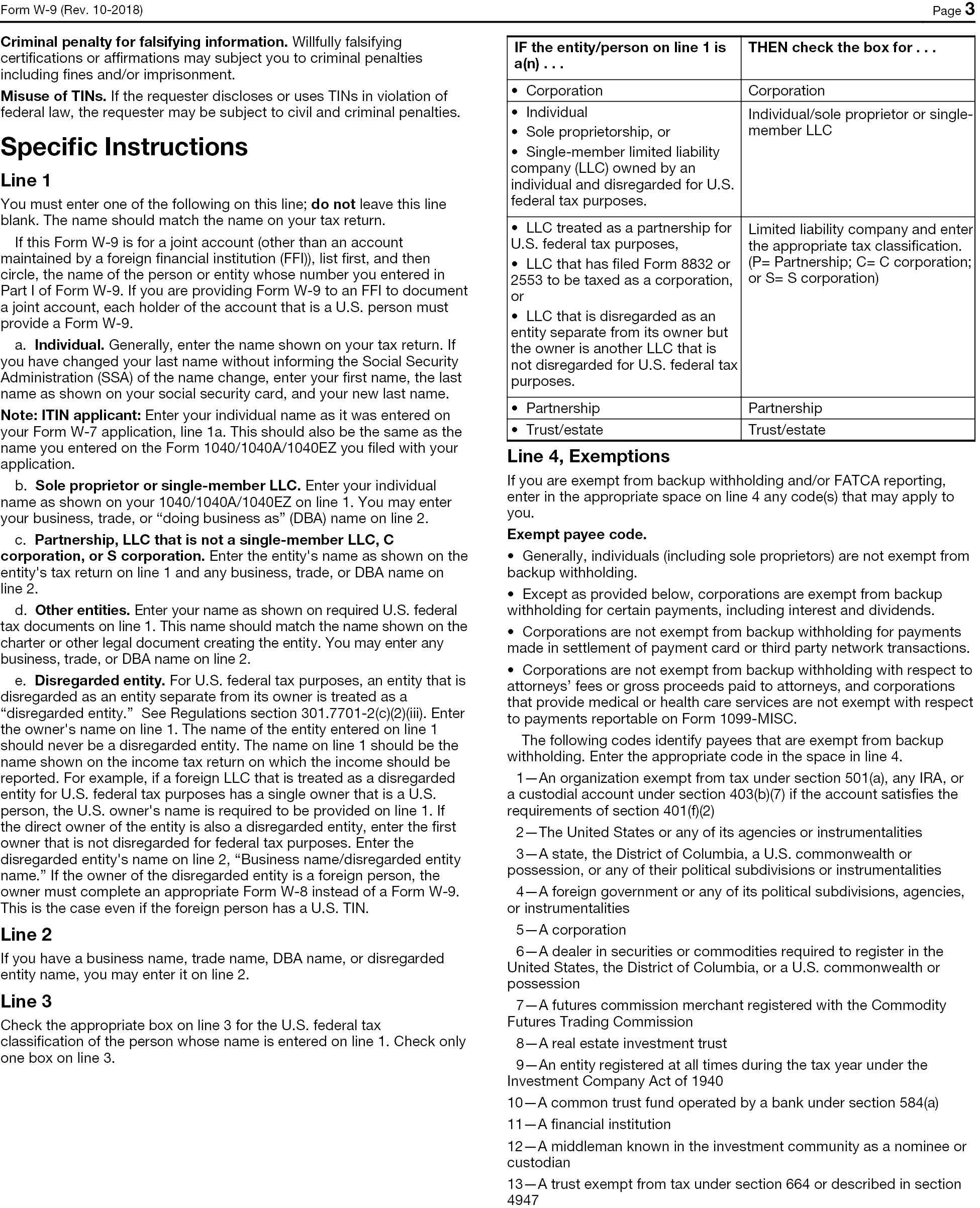 Form W-9 (Rev. 10-2018) Page 3 Criminal penalty for falsifying information. Willfully falsifying certifications or affirmations may subject you to criminal penalties including fines and/or imprisonment. Misuse of TINs. If the requester discloses or uses TINs in violation of federal law, the requester may be subject to civil and criminal penalties. Specific Instructions Line 1 You must enter one of the following on this line; do not leave this line blank. The name should match the name on your tax return. If this Form W-9 is for a joint account (other than an account maintained by a foreign financial institution (FFI)), list first, and then circle, the name of the person or entity whose number you entered in Part I of Form W-9. If you are providing Form W-9 to an FFI to document a joint account, each holder of the account that is a U.S. person must provide a Form W-9. a. Individual. Generally, enter the name shown on your tax return. If you have changed your last name without informing the Social Security Administration (SSA) of the name change, enter your first name, the last name as shown on your social security card, and your new last name. Note: ITIN applicant: Enter your individual name as it was entered on your Form W-7 application, line 1a. This should also be the same as the name you entered on the Form 1040/1040A/1040EZ you filed with your application. b. Sole proprietor or single-member LLC. Enter your individual name as shown on your 1040/1040A/1040EZ on line 1. You may enter your business, trade, or “doing business as” (DBA) name on line 2. c. Partnership, LLC that is not a single-member LLC, C corporation, or S corporation. Enter the entity’s name as shown on the entity’s tax return on line 1 and any business, trade, or DBA name on line 2. d. Other entities. Enter your name as shown on required U.S. federal tax documents on line 1. This name should match the name shown on the charter or other legal document creating the entity. You may enter any business, trade, or DBA name on line 2. e. Disregarded entity. For U.S. federal tax purposes, an entity that is disregarded as an entity separate from its owner is treated as a “disregarded entity.” See Regulations section 301.7701-2(c)(2)(iii). Enter the owner’s name on line 1. The name of the entity entered on line 1 should never be a disregarded entity. The name on line 1 should be the name shown on the income tax return on which the income should be reported. For example, if a foreign LLC that is treated as a disregarded entity for U.S. federal tax purposes has a single owner that is a U.S. person, the U.S. owner’s name is required to be provided on line 1. If the direct owner of the entity is also a disregarded entity, enter the first owner that is not disregarded for federal tax purposes. Enter the disregarded entity’s name on line 2, “Business name/disregarded entity name.” If the owner of the disregarded entity is a foreign person, the owner must complete an appropriate Form W-8 instead of a Form W-9. This is the case even if the foreign person has a U.S. TIN. Line 2 If you have a business name, trade name, DBA name, or disregarded entity name, you may enter it on line 2. Line 3 Check the appropriate box on line 3 for the U.S. federal tax classification of the person whose name is entered on line 1. Check only one box on line 3. the entity/person on line 1 is a(n) . . . THEN check the box for . . . Corporation Corporation Individual Sole proprietorship, or Single-member limited liability company (LLC) owned by an individual and disregarded for U.S. federal tax purposes. Individual/sole proprietor or singlemember LLC LLC treated as a partnership for U.S. federal tax purposes, LLC that has filed Form 8832 or 2553 to be taxed as a corporation, or LLC that is disregarded as an entity separate from its owner but the owner is another LLC that is not disregarded for U.S. federal tax purposes. Limited liability company and enter the appropriate tax classification. (P= Partnership; C= C corporation; or S= S corporation) Partnership Partnership Trust/estate Trust/estate Line 4, Exemptions If you are exempt from backup withholding and/or FATCA reporting, enter in the appropriate space on line 4 any code(s) that may apply to you. Exempt payee code. Generally, individuals (including sole proprietors) are not exempt from backup withholding. Except as provided below, corporations are exempt from backup withholding for certain payments, including interest and dividends. Corporations are not exempt from backup withholding for payments made in settlement of payment card or third party network transactions. Corporations are not exempt from backup withholding with respect to attorneys’ fees or gross proceeds paid to attorneys, and corporations that provide medical or health care services are not exempt with respect to payments reportable on Form 1099-MISC. The following codes identify payees that are exempt from backup withholding. Enter the appropriate code in the space in line 4. 1—An organization exempt from tax under section 501(a), any IRA, or a custodial account under section 403(b)(7) if the account satisfies the requirements of section 401(f)(2) 2—The United States or any of its agencies or instrumentalities 3—A state, the District of Columbia, a U.S. commonwealth or possession, or any of their political subdivisions or instrumentalities 4—A foreign government or any of its political subdivisions, agencies, or instrumentalities 5—A corporation 6—A dealer in securities or commodities required to register in the United States, the District of Columbia, or a U.S. commonwealth or possession 7—A futures commission merchant registered with the Commodity Futures Trading Commission 8—A real estate investment trust 9—An entity registered at all times during the tax year under the Investment Company Act of 1940 10—A common trust fund operated by a bank under section 584(a) 11—A financial institution 12