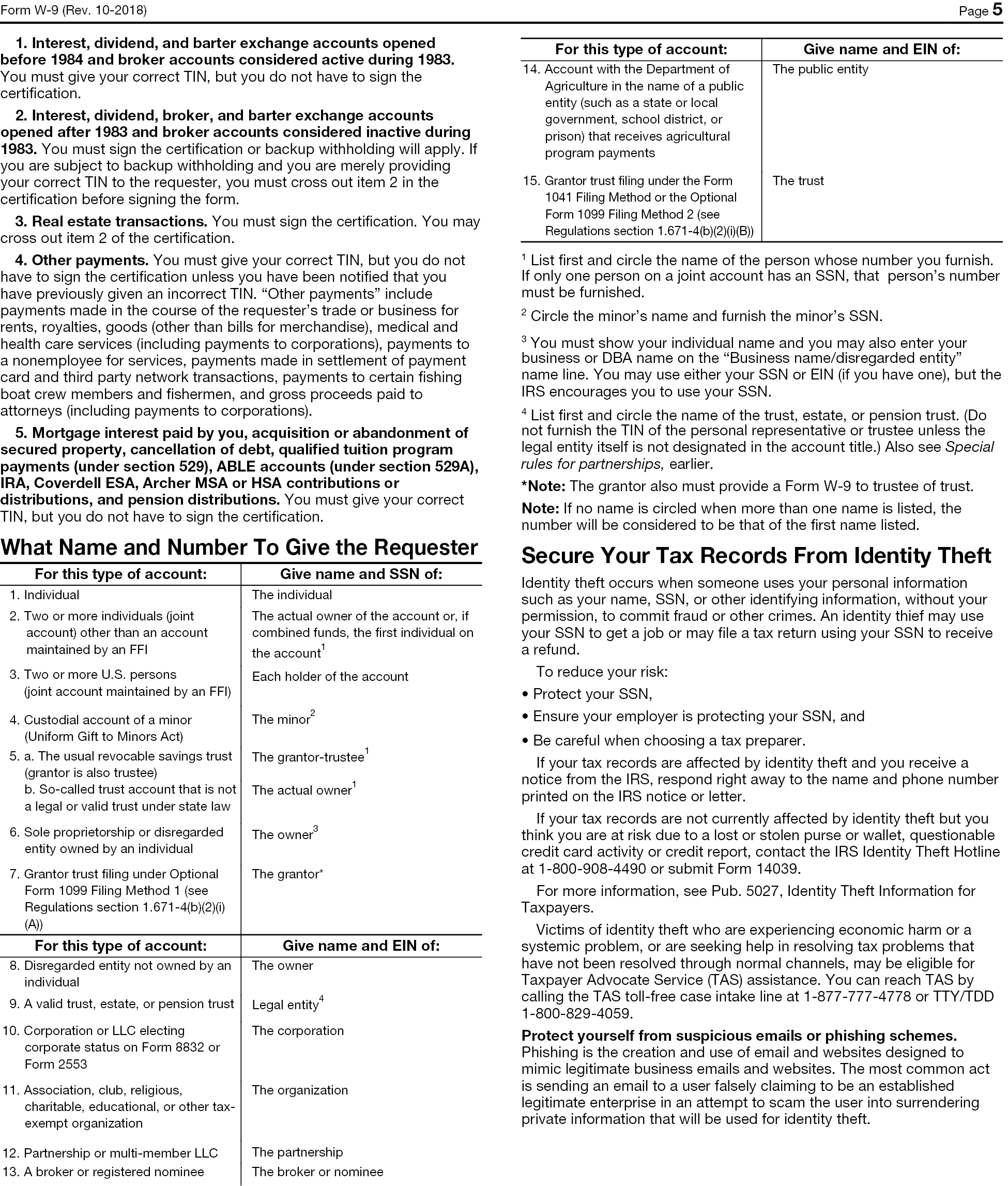 Form W-9 (Rev. 10-2018) Page 5 1. Interest, dividend, and barter exchange accounts opened before 1984 and broker accounts considered active during 1983. You must give your correct TIN, but you do not have to sign the certification. 2. Interest, dividend, broker, and barter exchange accounts opened after 1983 and broker accounts considered inactive during 1983. You must sign the certification or backup withholding will apply. If you are subject to backup withholding and you are merely providing your correct TIN to the requester, you must cross out item 2 in the certification before signing the form. 3. Real estate transactions. You must sign the certification. You may cross out item 2 of the certification. 4. Other payments. You must give your correct TIN, but you do not have to sign the certification unless you have been notified that you have previously given an incorrect TIN. “Other payments” include payments made in the course of the requester’s trade or business for rents, royalties, goods (other than bills for merchandise), medical and health care services (including payments to corporations), payments to a nonemployee for services, payments made in settlement of payment card and third party network transactions, payments to certain fishing boat crew members and fishermen, and gross proceeds paid to attorneys (including payments to corporations). 5. Mortgage interest paid by you, acquisition or abandonment of secured property, cancellation of debt, qualified tuition program payments (under section 529), ABLE accounts (under section 529A), IRA, Coverdell ESA, Archer MSA or HSA contributions or distributions, and pension distributions. You must give your correct TIN, but you do not have to sign the certification. What Name and Number To Give the Requester For this type of account: Give name and SSN of: 1. Individual The individual 2. Two or more individuals (joint account) other than an account maintained by an FFI The actual owner of the account or, if combined funds, the first individual on the account1 3. Two or more U.S. persons (joint account maintained by an FFI) Each holder of the account 4. Custodial account of a minor (Uniform Gift to Minors Act) The minor2 5. a. The usual revocable savings trust (grantor is also trustee) b. So-called trust account that is not a legal or valid trust under state law The grantor-trustee1 The actual owner1 6. Sole proprietorship or disregarded entity owned by an individual The owner3 7. Grantor trust filing under Optional Form 1099 Filing Method 1 (see Regulations section 1.671-4(b)(2)(i) (A)) The grantor* For this type of account: Give name and EIN of: 8. Disregarded entity not owned by an individual The owner 9. A valid trust, estate, or pension trust Legal entity4 10. Corporation or LLC electing corporate status on Form 8832 or Form 2553 The corporation 11. Association, club, religious, charitable, educational, or other taxexempt organization The organization 12. Partnership or multi-member LLC The partnership 13. A broker or registered nominee The broker or nominee For this type of account: Give name and EIN of: 14. Account with the Department of Agriculture in the name of a public entity (such as a state or local government, school district, or prison) that receives agricultural program payments The public entity 15. Grantor trust filing under the Form 1041 Filing Method or the Optional Form 1099 Filing Method 2 (see Regulations section 1.671-4(b)(2)(i)(B)) The trust 1 List first and circle the name of the person whose number you furnish. If only one person on a joint account has an SSN, that person’s number must be furnished. 2 Circle the minor’s name and furnish the minor’s SSN. 3 You must show your individual name and you may also enter your business or DBA name on the “Business name/disregarded entity” name line. You may use either your SSN or EIN (if you have one), but the IRS encourages you to use your SSN. 4 List first and circle the name of the trust, estate, or pension trust. (Do not furnish the TIN of the personal representative or trustee unless the legal entity itself is not designated in the account title.) Also see Special rules for partnerships, earlier. *Note: The grantor also must provide a Form W-9 to trustee of trust. Note: If no name is circled when more than one name is listed, the number will be considered to be that of the first name listed. Secure Your Tax Records From Identity Theft Identity theft occurs when someone uses your personal information such as your name, SSN, or other identifying information, without your permission, to commit fraud or other crimes. An identity thief may use your SSN to get a job or may file a tax return using your SSN to receive a refund. To reduce your risk: Protect your SSN, Ensure your employer is protecting your SSN, and Be careful when choosing a tax preparer. If your tax records are affected by identity theft and you receive a notice from the IRS, respond right away to the name and phone number printed on the IRS notice or letter. If your tax records are not currently affected by identity theft but you think you are at risk due to a lost or stolen purse or wallet, questionable credit card activity or credit report, contact the IRS Identity Theft Hotline at 1-800-908-4490 or submit Form 14039. For more information, see Pub. 5027, Identity Theft Information for Taxpayers. Victims of identity theft who are experiencing economic harm or a systemic problem, or are seeking help in resolving tax problems that have not been resolved through normal channels, may be eligible for Taxpayer Advocate Service (TAS) assistance. You can reach TAS by calling the TAS toll-free case intake line at 1-877-777-4778 or TTY/TDD 1-800-829-4059. Protect yourself from sus