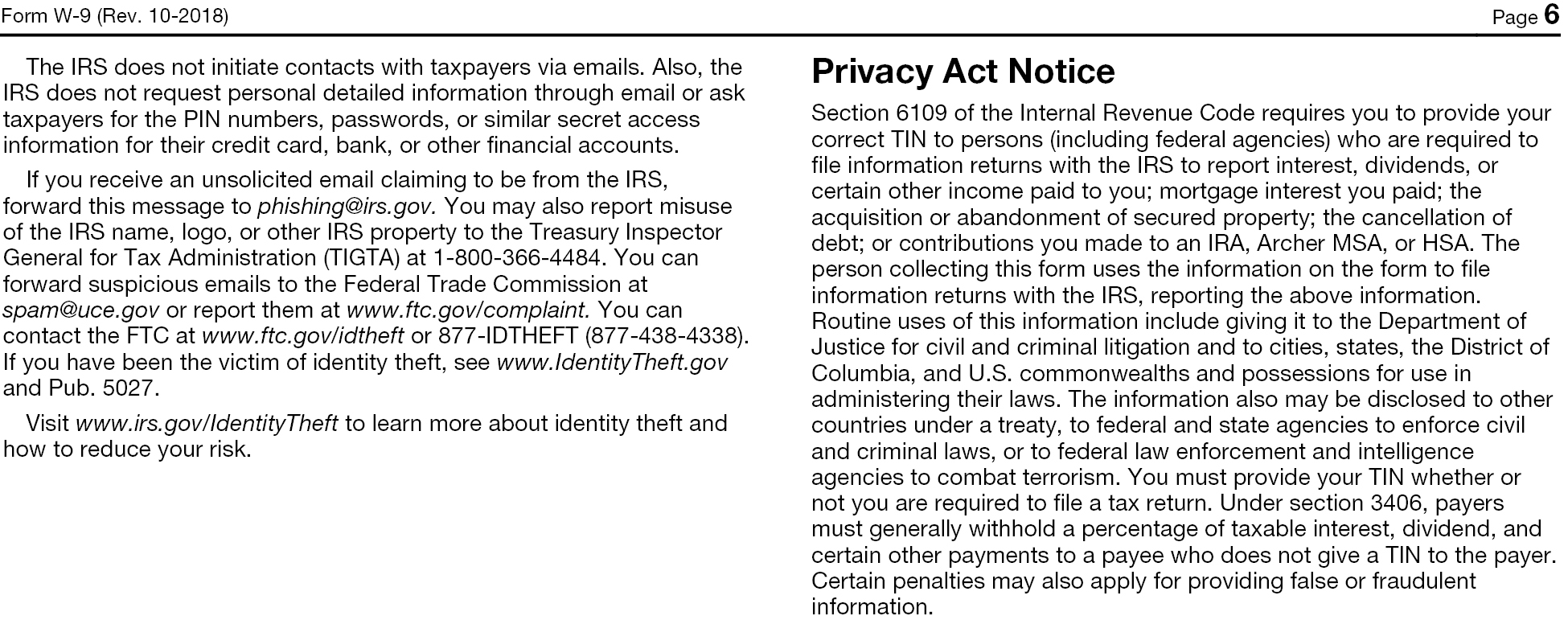 Form W-9 (Rev. 10-2018) Page 6 The IRS does not initiate contacts with taxpayers via emails. Also, the IRS does not request personal detailed information through email or ask taxpayers for the PIN numbers, passwords, or similar secret access information for their credit card, bank, or other financial accounts. If you receive an unsolicited email claiming to be from the IRS, forward this message to phishing@irs.gov. You may also report misuse of the IRS name, logo, or other IRS property to the Treasury Inspector General for Tax Administration (TIGTA) at 1-800-366-4484. You can forward suspicious emails to the Federal Trade Commission at spam@uce.gov or report them at www.ftc.gov/complaint. You can contact the FTC at www.ftc.gov/idtheft or 877-IDTHEFT (877-438-4338). If you have been the victim of identity theft, see www.IdentityTheft.gov and Pub. 5027. Visit www.irs.gov/IdentityTheft to learn more about identity theft and how to reduce your risk. Privacy Act Notice Section 6109 of the Internal Revenue Code requires you to provide your correct TIN to persons (including federal agencies) who are required to file information returns with the IRS to report interest, dividends, or certain other income paid to you; mortgage interest you paid; the acquisition or abandonment of secured property; the cancellation of debt; or contributions you made to an IRA, Archer MSA, or HSA. The person collecting this form uses the information on the form to file information returns with the IRS, reporting the above information. Routine uses of this information include giving it to the Department of Justice for civil and criminal litigation and to cities, states, the District of Columbia, and U.S. commonwealths and possessions for use in administering their laws. The information also may be disclosed to other countries under a treaty, to federal and state agencies to enforce civil and criminal laws, or to federal law enforcement and intelligence agencies to combat terrorism. You must provide your TIN whether or not you are required to file a tax return. Under section 3406, payers must generally withhold a percentage of taxable interest, dividend, and certain other payments to a payee who does not give a TIN to the payer. Certain penalties may also apply for providing false or fraudulent information.