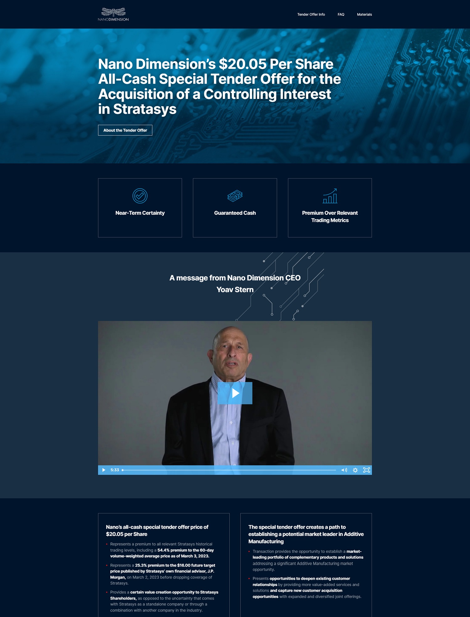 Y o u can rece i v e a free copy of t he Offe r to P ur c h ase , t h e r e l a t ed Le tt e r of T r a n s m i tt a l , c e r ta i n o t he r tender o f f er docu m en t s and other d oc u m e nt s f i l ed with the SEC at sec.gov o r by con tac t in g Geo r g eso n at (877) 668 - 1 6 4 6 . Tender Offer Statement > Tender Offer S t ate m e n t filed by Nan o Dime n sio n , Ma y 25 , 2023 > Offer to Purchase fil ed by Nano D im e n s i o n , May 25, 2023 > A m en d m e n t N o . 1 to Tend e r Offe r S t ate m ent f il e d by Nano D i m e n sio n , May 3 1 , 2023 > Ame nd m e n t No. 2 to T e n d e r Offer Sta t e m e nt f i l ed by N a n o Dime n s i o n, June 8 , 2023 > Ame nd m e n t N o . 3 to Tender Offe r Statement f i l e d by N a no D i m ens io n , June 1 4 , 2023 > A m e nd me nt N o . 4 to T e n d e r O ffe r S t ate m e n t f il e d by N a no D im ens i on , June 1 4 , 2023 > A m en d m e n t No. 5 to T e nd er O ff er Sta t e m e nt f i l ed by N a n o Dim e n s i o n, June16 , 2023 > A m e n d m e n t No. 6 to Ten d er O f f e r S ta t eme n t filed by N ano D i mens i o n , June 2 1 , 2023 > Form of Amended L e tt er o f T r a n s m i ttal , June 27 , 2023 > Supplement to O ff e r to Purchase f i le d by Nano D i m e n s i o n, June 27 , 2023 > A me nd m e n t No. 7 to Te n de r Of f er S t atement fi l e d by N a n o D i m e n s i o n, June 27 , 2023 Press Releases > Nano Di m e n sion H i ghli g h t s Lea d e r sh i p Strength and Record o f D r i v i n g V a l ue C r ea t i o n for Shareho l d e r s , June 21 , 2023 > Na n o Di me n sio n Reaffirms $18 . 0 0 P er Share A ll - Cas h Tender O f f e r f o r Stratasys Shareho l d e r s to Receive N e a r - Te r m Va l u e by Te n d e r i n g Their Sha r es , Ju n e13 , 2023 > Na n o Di m e n sion H i gh l ights A d va n t ages of Its $ 1 8 . 0 0 Cas h Pe r S h a r e Spec i a l T ende r O ff e r for S t r a ta sys vs. Other Alternatives, June 8 , 2023 > Na n o Di m ens io n L au n c h es $ 1 8. 0 0 Per Sh a r e A ll - C a s h S p e ci a l Te nd e r O ff er to I n c r e a se O w ners h i p i n S t r a ta sys to betwee n 53 % and 55 % o f I ts O u t s t a nd i n g Sh a r es , May 2 5 , 2023 > Na n o Di me n sio n R ev i ses P r oposa l t o Ac q u i re St r a t asys for $20 . 05 i n Cash a n d A c ce l e r at es A S t r a teg y, April 3 , 2023 > Na n o Di m e n si o n I ncreases Offe r to Acqui r e S t r a tasys t o $19 . 55 Pe r Sh a r e i n C a s h, Ma r ch 29 , 2023 > Na n o Di m e n sio n Announces F o r m a l Offer to Ac qu i re S tr a t a sys f o r $18.00 Per Sh a r e to C r ea t e Additive Ma n u f acturing I ndus t ry L ea d e r , March 9 , 2023 Presentations > Process for Ten d eri n g St ra tasys Shares > S tr atasys Special T en d er Offer I nves t o r Call > Na n o Dime n sio n' s Special T e n d e r O f f er for the Acqu i s i t i o n o f a Co n t r o lli n g I n t e r es t i n S tr atasys > N a n o Di m e n si o n ' s A ll Cash Special T ender O ffe r F or Str at as y s : S u pe ri o r t o U nce r t a i n A l te rn at ives Nano Dimension Information Agent I nvestor Relat i ons George s on