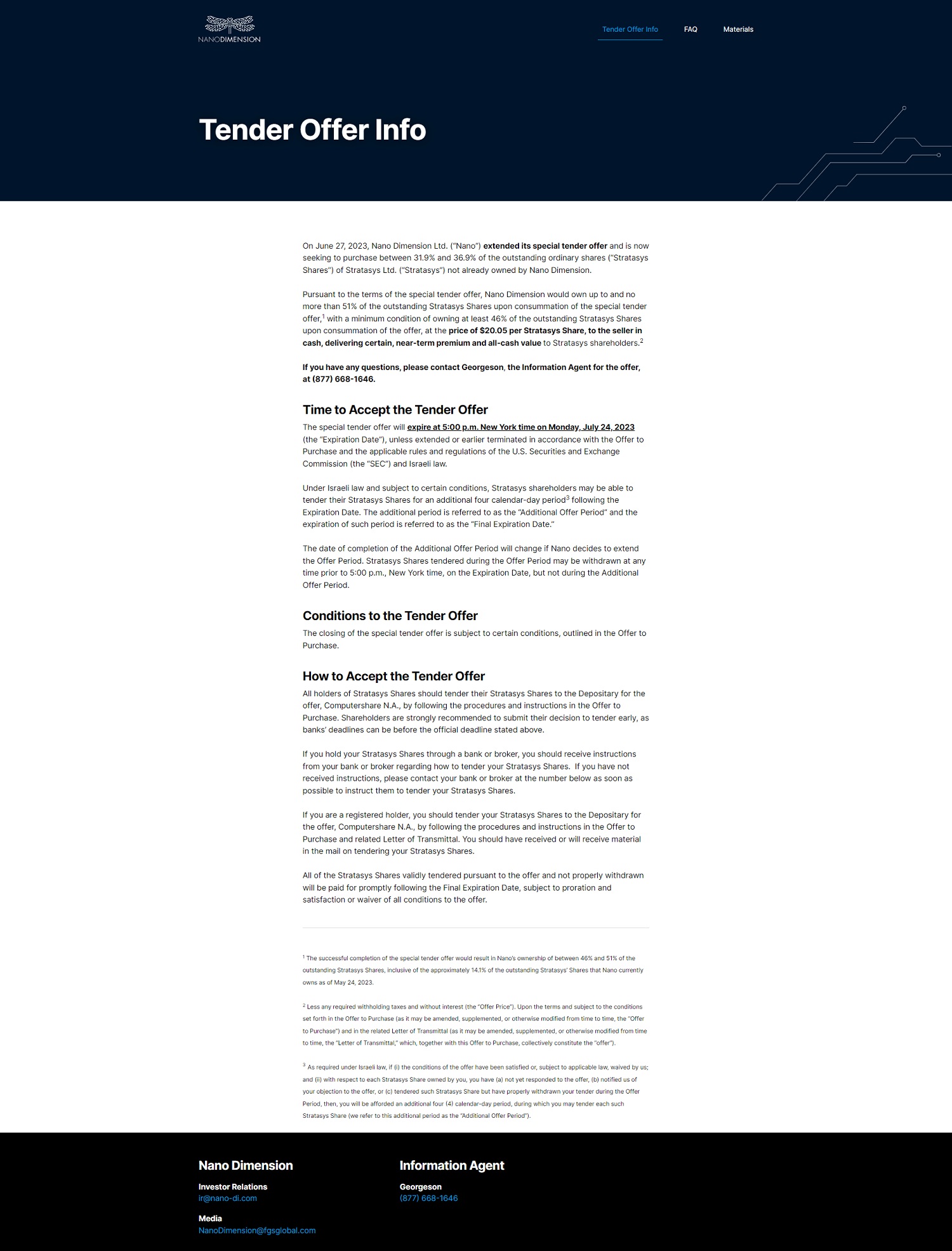 reasons, f aci l i t ate the ongoing r e v i ew by CF I US, w h i c h has b een d e l ayed i n p ar t d u e to Stratasys' lack of r espo n s i veness in p r ov i d i n g requ i site i nform a tion. F ollow i n g t h e end of such i n i t i al assessment , CFIUS w i ll e i ther ( i ) clear t h e t r ansact i on o r ( i i) i n i tiate a n add i tion a l i n ves t i g at i o n of the trans a ction. I t i s un l i ke l y that CFI U S w i ll comp l ete i ts review p r ior to t h e t arget c l os i n g date for t he t r ansaction, howeve r we h ave discret i o n t o close the t r ansactio n w i thout CF I U S cleara n ce . We understand that S t r atasys p roduces ce r t a i n c r i t i cal t ec h no l ogies an d h as seve r a l cont a c t s w i t h t h e U n i t ed S t ates go v ernmen t. Bo t h suc h po i n ts w ill li k e l y b r i n g t h e t r ansac t io n u n der closer C F I US sc r u t iny . As s u c h , we expect t h a t CFIUS m a y not cl ea r the transac t i on afte r t h e i n i t i a l assess m e n t , and t h at CF1 U S may i mpose ce r t a i n cond i t i ons on t h e transaction, e i t h e r p r e - or post - cl os i ng , f o ll owi n g t h e comp l et ion of the i r review. U nt i l the success f u l co m p l etion o f t he tende r of f e r , N a n o D i m e n s i o n a n d St r a t asys w i ll opera t e i nd e pe n dent ly . Deadlines and Extensions Why did you extend the Expirat i on Dateand raise the offer price of the special tender offer? A Nano D im e n sion h a s extend e d t h e Expiration Date o f the spec i a l t ende r of f e r to fac i l i ta t e the ongo i ng r ev i ew b y C F 1US a n d to allow f o r t he comp l et i on of the regu l ato r y r ev i ew process u n de r the Hart - Scott - Ro d i no Ac t . T h e o f fer per i od has been exten d ed u n t i l 5 : 00 p . m. , New York t i m e , on Monda y , Ju l y 2 4 , 2023 . Add i t i onally, Nano Di m ens i on h as raised t he o f fe r p ri ce t o $20 . 05 pe r s h are to fu r t h e r d e mons t r ate its com m i t ment t o the consum m at i on o f t h e spec i a l tende r o ff e r and provid i ng Stratasys s h a r eho l ders w i th certa in , nea r - te r m cas h a t a supe r i o r p r em i u m . D i d Nano Dimension extend the Expiration Date and raise A the offer price because not enough shares were tendered ? No . We have ex t ended t h e o ff e r pe r i od o f t h e special tender o f f e r t o f ac i l ita t e t h e o n go i ng review by CF I US and to allow for the comp l etio n of the r egu l a t o r y review p r ocess u n de r the Hart - Scott - Rod i no Ac t . The i ncrease i n offe r price fu r th e r demons t r ates N a no ' s co m mitment t o the consum m at i on of the t e n de r o f fe r a n d prov i d i ng Stratasys shareho l de r s w i th cer t a i n , nea r - t erm cash at a super i or prem i um. Can the offer be extended and the offer price be raised A again and under what circumstances? 1 N ano Dimension has the r i g ht , i n its sole d i scret i on, to extend t h e Exp i rat i on Date and adjust the offe r p r ice aga i n, sub j ect t o applicab l e l aw. l n add it i o n , in certa i n ci r cumsta n ce s , we may be requ i r ed b y app l i cab l e l aw t o extend t he E xp i r at i on Da t e aga i n. How will I be notified if the offer is extended again? 1 A I f N ano D i m ens i on decides t o extend t h e Expira t ion Date beyo n d 5:00 p . m . on Ju l y 24, 2023 or change t he ter m s o f t h e t e n de r offer, t h e Compan y will publ i c l y a nn ounce the new Exp i r a t i o n Date i n a press r e l ease i n acco r d ance w i t h app l i cab l e l aw a n d i n f or m t h e D epos i tary an d I nfo rm ation Agent. If enoughStratasys shareholders tender thei r shares in A the offer before the deadline , would you make an announcement before the Expiration Date? N o, the tender offer wi ll remai n open until the E x p i rat i on Da t e. Tendering Stratasys Shares and Receiving Cash Payment How can I tender my shares? A I f you are the r ecord owner of your Stratasys S h a r es , you sho u l d tende r you r St r atasys Shares to Co m pu te r share Trust Com p any , N .A. by fo llo w in g th e procedu r es a n d ins truc t i o ns in t he Offer to Purchase and r e l ated Lette r of Tra n s m i tta l. P l ease co n tac t Geo r geso n , the In f o r mation Age n t fo r t h e offe r , at (877) 668 - 1 6 4 6 i f you n eed add i tio n a l copies o f ma t e r ials or have quest io n s abou t how t o te n d e r . I f you ho l d your St r atasys Shares th r ough a ban k o r broke r , you sho u l d r ece iv e instruc t i o n s fro m you r bank o r broke r rega r d i ng how to tende r your s h a r es. I f yo u have n ot r e ce i ved instruc t i o n s , p l ease co nt act y o u r ban k or b r oke r as soon as possib l e t o instruc t them to t e n de r yo u r sha r es.