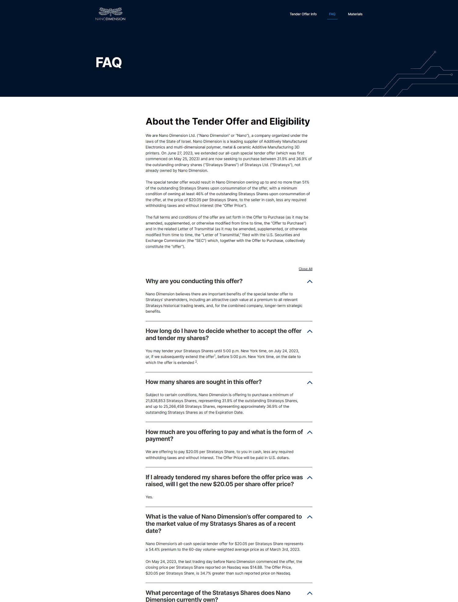About the Tender Offer and Eligibility We a r e Na no Dime n sion Lt d . (" N ano D i m ens i on" o r "N a n o ). a co m pany orga n i z e d u nder the l aws o f t he State o f Is r ael. Na no Dime nsio n i s a l ead i ng s u pp li e r o f Add i t i vel y Man u factu r ed E l ec t r o n ics a n d mu l ti - d i m e n siona l p ol ym e r, m eta l & ce r a mic A dd i ti v e Ma n uf ac tu rin g 30 printers . On Ju ne 2 7 , 2 0 23 , w e ex t e n de d ou r a ll - cash specia l t e n d e r offe r ( w h i c h w as fi rst com m enced on May 25 , 2023 ) and are now see ki n g t o pu r ch ase be tw ee n 3 1. 9 % an d 36.9% o f the outstanding o r d i n a r y sh a r es r stra t asys S h a r es " ) o f Stra t asys lt d. ( "Str a t as ys M), no t al re ady owned b y Na no D i mens i o n . The specia l te n de r o ffe r wou l d res u l t i n N ano D i m ens i o n own i n g up to an d no m o r e t h a n 51 % o f th e o u ts t a n din g S tr a t asys Sha r es upo n consu m ma t i on of t h e of f e r , w i t h a m inim u m cond i t i on o f owni n g a t least 46 % of the ou t st andi n g Stra t as y s S h a r es upon consummation o f the offe r, at the pr i ce of $20.05 pe r Stra t asys Sha r e , t o t he se ll er i n cash, l ess any r e quir e d wi t h h o l di n g tax e s and witho u t i nteres t ( the " O ff e r P r ice" ) . The f u ll t e rm s and co n d i tions of t h e offer are se t fo r t h i n th e O ff er to Pu r c h a se ( a s it m a y be ame n ded, su ppl e m ent e d, o r o th e rwise mo d i f ied fr om t i m e to t i me , t h e " O ff er to Pu r c h ase" ) and i n the r e l ated L ette r o f Trans m itta l ( a s i t may be ame nd ed , supp l emente d , or ot h e rw i se m odi fi ed fr o m time t o time , the " le tt er o f T ran s m i tta l ," fi l ed w ith t h e U. S . Secu r i t i es a nd E xchange Comm i ss i o n ( t he " SEC " ) w h ic h , t oget h e r wi t h the Offe r t o P u r chase , co ll ec t i ve l y cons t i t u te the "otten. Why are you conducting this offer? N ano Dimensio n bel i eves t h ere a r e i mpor tan t b e n efi t s o f th e specia l tende r off e r to Stratasys' s h a reh o l ders, i nclud i n g a n a ttractive c as h va l ue at a premiu m t o all r e l eva nt Stratasys historica l tr ading leve l s, and , f or the combi ne d co m pany , lo n g er - te r m st r ateg i c benefi t s . How long doI have to decide whether to accept the offer A and tender my shares? Y o u m ay t e n der you r S t r atasys S h a r es unti l 5 : 00 p . m. Ne w Yo rk time , o n July 2 4 , 2023, or , i f we subseque nt ly extend t h e o ff er 1, b e for e 5 :00 p . m. N ew York time , on t h e date to w h i ch the offer is extended 2 . How many shares are sought in this offer? Subjec t to ce r tain cond i t i ons , Na no Dime n sion is o f f e r i n g t o p urc h ase a m i n i m u m of 2 1 , 838 , 853 Stra t asys S h ares , repr ese nt i ng 3 1. 9 % o f the o u t st a ndi n g Stratasys S h a r es , and up t o 25,266,458 Stra t asys Sha r es , rep r ese n t i ng ap p r ox i m a t e l y 36 . 9% o f th e outstand i ng Stratasys Sh a res as of the Ex pir a tion D a te. How much are you offering to pay and what is the form of A payment? We a r e offering to pay $20 . 05 pe r Stratasys Sh ar e , to yo u in cash , l ess any re qu i r ed wi t h h o l di n g taxes and with ou t i nt e res t . T h e O ff er P r ice wil l be pa i d i n U . S. dolla r s. If I already tendered my shares before the offe r price was A raised, will I get the new $20 . 05 per share offer price? Y es . What is the value of Nano Dimension ' s offer compared to A the market value of my Stratasys Shares as of a recent date? Nano Dime n sion ' s a ll - c as h spec i a l t e nd er offer for S2 0.05 per St r atasys S h a r e r e p r ese nt s a 54.4% p re m i um to th e 60 - da y volume - w e i gh t ed a v e r age price a s of M a rch 3 r d , 20 23 . O n May 2 4 , 2 02 3, t he l as t tradin g day b e f ore N an o Dimens i on co m menced t h e offe r , t he clos i ng pr i c e pe r S tr a t asys Share r eported o n N a s d aq was $ 1 4 . 88 . Th e Of f er P r i ce , $20.05 pe r Stratasys Sha r e , i s 3 4 .7 % greater than suc h rep o r ted p ri c e o n Nas da q . What percentage of the Stratasys Shares does Nano Dimension currentlv own? A