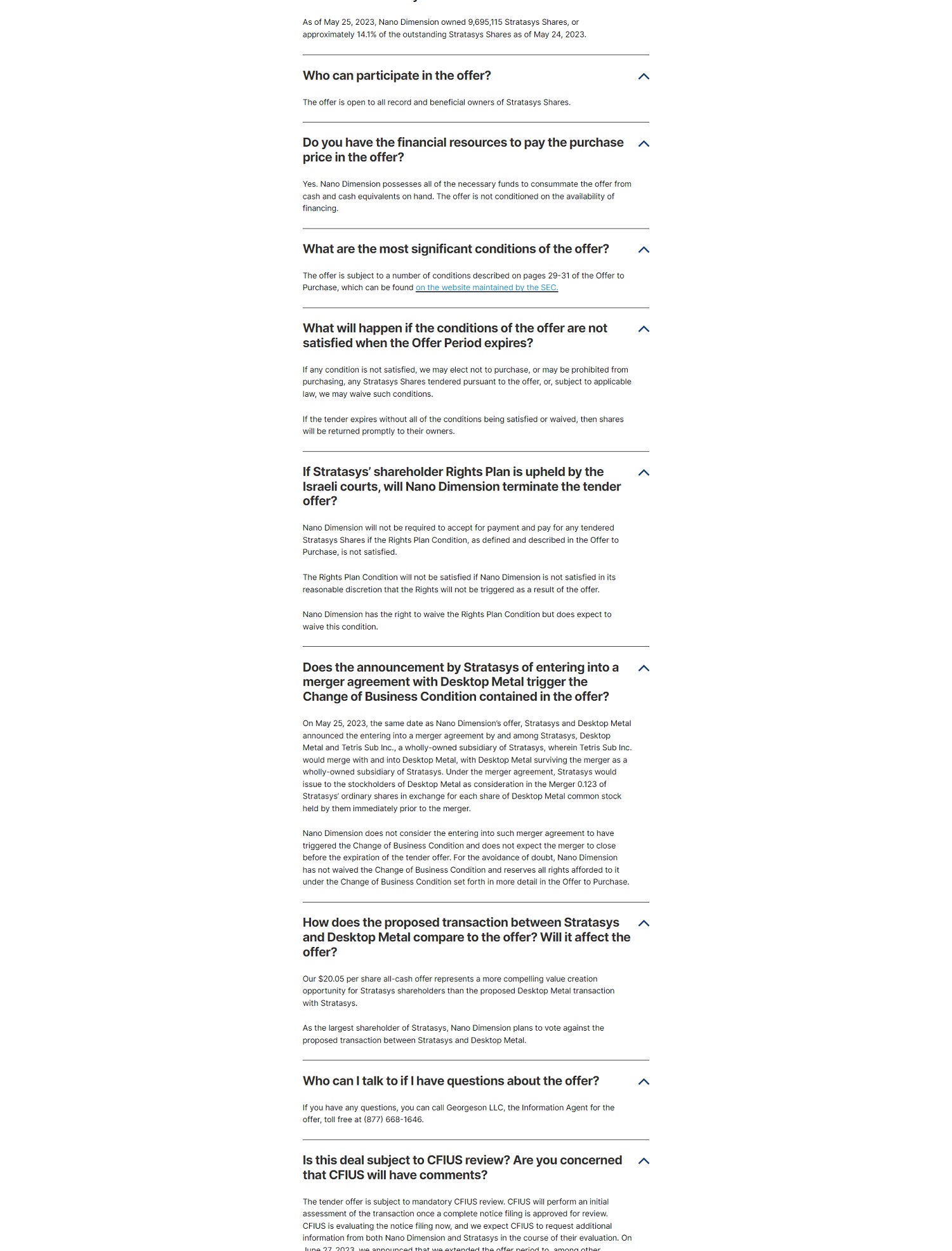 As of May 25, 2023 , Nano D i m ens i on owned 9 , 695,1 1 5 St r atasys Shares , o r ap p r o x i m a t e l y 14.1% o f t h e ou t s t a ndi ng St r a t asy s Shares aso f May 2 4 , 2023. Who can participate in the offer? T h e o ff er i s o p e n to a ll r eco r d a nd bene f i cia l owners o f St r a t asys Sha r es . Do you have the financial resources to pay the purchase A pricein the offer? Y es . N ano D i mens i on possesses a ll o f t he necessa r y f u n ds to co n su mm a t e t h e o ff e r fro m c a s h and cas h eq u iva l e nt s o n hand. Th e o f fer is not cond i t i o ne d on t he a v a i l a b ili t y of f i n anc i ng . What are the most significant conditions of the offer ? A T h e offe r i s sub j e ct to a nu mbe r of co n d i t i ons d esc r i bed o n pages 29 - 31of the O ff e r to P u r c h ase, whi c h c a n be fou n d on t he website ma i nta i ned b y the SEC . What will happen if the conditions of the offer are not A satisfied when the Offer Per i od expires? I f a n y con d i tion is no t s a t i s f i ed , we m ay e l ec t n ot to purchase , or m a y be pro h i b i ted from pu r chas i ng , any Stratasys S h a r e s t e n d e r ed p u rsua n t to t h e off e r , o r , sub j ect to app l i c a b l e l aw , w e may wa i ve suc h co nd i ti ons . I f the te n d e r ex p i r es w i t h ou t all of t h e condit i ons bei n g sat i s f i ed or waived , t h e n shar e s wi ll be r e t u rn e d pro m p tl y to th e i r ow n e r s . If Stratasys' shareholder Rights Plan is upheld by the A Israeli courts , will Nano Dimension terminate the t e nder offer? N ano D im e n s ion wi ll no t be r e q u i r ed to accep t f o r p a yme n t and pa y f o r a n y t e n d e r e d Stratasys Sh a r es i f t h e R i g h ts P l an Cond i t i on , as defi n ed and desc r i be d i n t h e O f fe r to P u r c h ase , i s not satis f i ed. The R i g h ts Plan Con d i t i on w ill no t be satisf i ed if N a n o D i mens i on i s not sa t i s f i ed i n i ts r easonable d i sc r e t i on t ha t the R i ghts will not be t r i gge r e d as a r esu l t o f t h e o ff e r . N ano Dimension h as the ri g ht to wa i ve the R i g h ts P l a n Con d i t i on but does expec t t o wa i ve t h i s con d i t i o n . Does the announcement by Stratasys of entering intoa A merger agreement with Desktop Metal trigger the Change of Bus i ness Condition conta i ned in the offer? On May 25 , 2023, th e sa m e date as N a n o D i me n s i on's offe r , Stratasys and Desk t o p Meta l a n n o un ced th e e n te r ing into a merge r a g r e eme n t by and amo n g Str a t asys , Des k top M e t a l and Te tr i s Sub Inc., a wholly - own e d s u bs i dia r y of St r atasys , where i n T e tr i s Sub In c . would merge w i th and i nt o De s k t op M etal , w i t h Des kt op Meta l s ur viv i ng t h e m e r ge r as a who ll y - o w ned subs i d i a ry o f St r a t asys . Unde r the m e r ge r ag r eeme nt , S t r atasys wou l d i ssue to t he s t oc k h o l de r s o f Des k t op M e t a l as cons i de r atio n I n the M e r ge r 0 . 1 23 o f S t r atasys· o r d i nary shar e s in exchang e for e ac h s h a r e of Desktop Me t a l com m o n s t ock h e l d by th e m i m medi a t e l y prio r to t he m e rg e r. N an o D im e nsion does no t c o n s i de r t he e n t e r i n g i nto s uch me r ger a g r e e me n t to h a v e t r i gger e d t h e Ch a nge o f Bus i n e ss Co n d i tion and do e s no t expect the merge r t o c l o se b efo r e the e xp i r atio n of the t ender o ff er . For the avoi d a n ce o f doubt , N a n o D i m e n s i o n h a s n o t wa i v ed t h e Change of B u s i n e s s Con d it i o n and r ese r v es a ll r i g ht s afforded t o it u n de r th e C h ange o f Bus i n e s s Co n d it io n set for t h in mo r e de t a i l i n th e O f fe r t o Pu r chase. How does the proposed transaction between Stratasys A and Desktop Metal compare to the of f er? Willit affect the offer? O u r $20 . 05 per s h a r e all - c a sh offer r ep r ese n ts a m ore compe ll i ng va l ue c r eat i o n oppor t un i ty for Stratasys sha r e h ol d e r s than t h e proposed D es kt op Met a l tra n sact i o n wi t h Str a t asys. As t h e l a r gest s h a r e h o l der of St r ata s ys, N ano D i m e n s i o n pl an s to v o t e aga i n s t t h e proposed transaction be tw ee n S t r atasys and Desk t op Metal. Who can I talk to if I have questions about the offer? A I f you ha v e any qu es t i ons , you can ca ll G eo r geso n L L C, the I n fo r m atio n Age nt fo r t h e o ff e r , toll fr ee at ( 877) 668 - 1646. Is this deal subject to CFIUS review? A r e you c oncerned A that CFIUS will have comments? The te n de r offer i s sub j ec t t o ma n da t ory CFIUS re v i ew . C FIU S w i ll perfo r m an i n i t i a l a ss e ss m e n t o f t h e t r a n sac ti on once a co m p l e t e n ot i ce fi l i ng i s app r o v ed for r ev i ew . CFIUS is eva l u a t ing t h e n o t i ce f i li n g n ow , and we ex pe ct CF 1 U S t o r e q u est addit i o n a l in fo r m a t ion from b o t h N a n o D i me n s i o n and S t r a ta sy s i n t he cou r se of t h e ir eva l u a t i on . O n