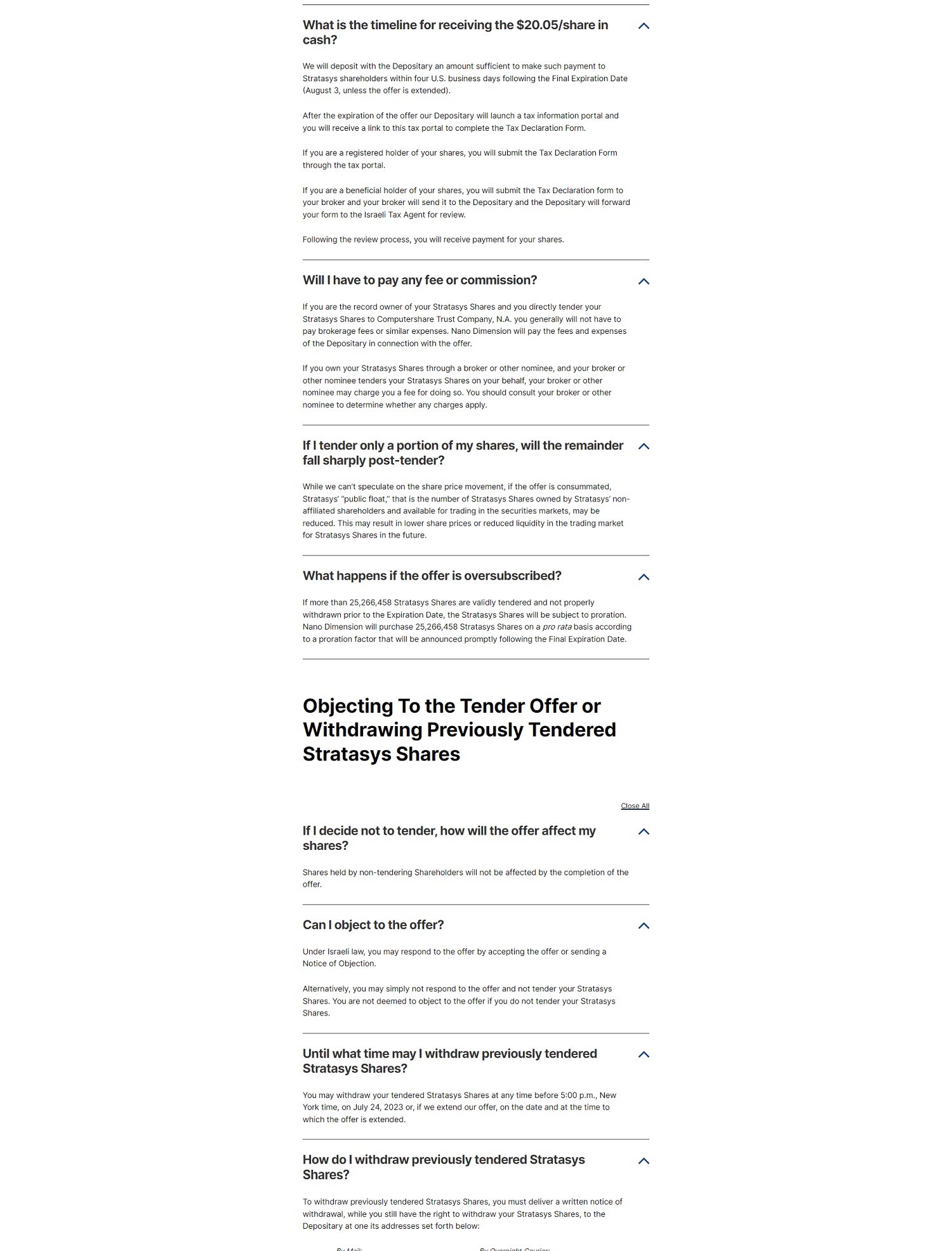 What is the timelin e for rece i v i ng the $20.05/ s hare in cash? A We w i ll depo s i t wi t h t h e D epos i t a r y a n a m ou n t s uff i cient to ma k e suc h p ay m ent t o Stratasys s h a r eholde r s wi t h in fo u r U . S . busi n ess days f o ll ow in g t h e F i n a l E xpira t i o n D a t e ( August 3, un l ess the o ff er is ex tended) . A f te r t h e exp i ration o f t h e offe r o u r D ep o s i tary w i ll l aun ch a t ax i n f o rm a t i o n po rt a l and you will rece i ve a l i n k t o thi s tax port a l to co m p l ete t h e T ax Dec l arat i o n Fo r m. I f you a r e a reg i ste r ed holde r of you r shares , y ou will sub m i t t h e Tax D e c l a r at i on Fo rm th r ough t he t ax porta l. I f you a r e a b e n eficia l h o l der of your sha r e s, yo u w i ll subm i t t he T ax Decla r ation f o r m t o you r broke r and you r b r oker w ill se n d i t to t h e D epos i t a r y and t h e D e pos i t ar y w i ll for wa r d you r for m to t he I srae l i Tax Agent for rev i ew . F ollow i ng the r ev i e w proc e ss, you will r ec e ive payment fo r you r shares . Will I have to pay any fee or commission? A I f you a re the r eco r d owner of your S t r atasys S h a r es and y ou d i r ec tly t ender you r S tratasys Sha r es t o Comp u t ersha r e Tr u st C om pa ny, N .A. y o u ge n e r a ll y w ill no t h a v e t o pay b r o k e r age fees o r sim i la r expenses. Na n o Dimension w ill pay the f ees a n d expe n ses o f t he Depos i tary i n con n ec t io n wi t h th e o ff er. I f you ow n yo u r Stratasys S h ares t h r ough a b roke r or othe r n om i n ee , a n d yo u r b r o k er or o t h er nom i nee tenders you r Stra t asys Shares o n you r behal f , yo ur b r o k er o r other nom i nee m ay charge y o u a fee for do i ng so. You s h ou l d co n s u l t your broker or o t h er n om i nee to de te r mine whe t her any c h arges app l y. If I tender onlya portion of my shares, will the remainder A fall sharply post - tender? While we can't specu l ate on t he s h ar e p ric e mov e m e n t , i f t he o f fe r i s consum m a t e d , S tratasys· 0 public f l oa t , H t h at i s the n u m b er o f S tr atas y s S h a r es owned b y Str a tas y s · non a ffi li a t e d s h are hold e r s a n d avai l a b l e fo r tr ad i ng in th e sec u r i ti es m arkets , m a y b e reduc ed . Th i s m ay r esult in lowe r s h a r e p r ic e s o r reduc e d l i q u i d i t y in t h e tr ad i n g m a r ke t for Stra t asys Sha r es i n t he fu t u r e. What happens if the offer is oversubsc r ibed? A I f m o r e t h an 25 , 266 , 458 Stra t asys Sha r es a re v a l id l y te n de r ed and not p r operly wi t hd r awn p r i o r to t h e Exp ir at i on Da t e , t he Stratasys Sha r es w ill be sub j ect to pro r ation . N ano Dimension wi ll p u r chase 25 , 266 , 458 S t rat a sy s Sha r es on a p r o rata b asis acco r d i ng to a p r o r ation fac t or t h at wil l be annou n ce d p r o m pt l y fo ll o w i n g th e F i n a l Expirat i on Da te . Objecting To the Tender Offer or Withdrawing Previously Tendered Stratasys Shares If I decide not to tender, how will the offer affect my shares? "' Shares held by non - t endering Sha r ehO l de r s w i ll not be affected by t h e co m p l et i o n of the o ff e r . Can I object to the offer? A U n der I s r ae l i l aw , you may r espo n d t o the o f fe r b y accept in g t h e o f f e r or send i n g a N otice o f O bjection. Al t e rn a tive l y, yo u may s i mp l y no t respond to th e offer a n d no t t e nd e r your St r a tas y s S hares . You are n ot dee m ed to ob j ec t t o th e o ff er if you do n o t t e n der yo u r Stra tasys Sha r es . Until what time may I withdraw p r eviously tendered Stratasys Shares? A Y o u m ay w i thdraw yo u r t e n de r e d St ra tasys S h a r e s a t any t i m e befo r e 5 : 00 p . m . , N ew Y ork time, on Ju l y 2 4 , 2023 or , i f wee x tend our o ff e r , on the date a n d at t h e ti m e to wh i ch the o f fer is extended . How do I withdraw previously tendered Stratasys Shares? A To w i thdraw previous l y t ende r ed S t r atasys S h a r es , you m us t de l i v e r a w r i t t e n n ot i ce of wi t hd r awa l , wh i l e yo u st i ll have t he r i ght to w i t hdr a w y o u r S t r a tasys S h ares, to t h e D eposi t a r y at one i t s add r ess e s s e t fo r t h be l ow :