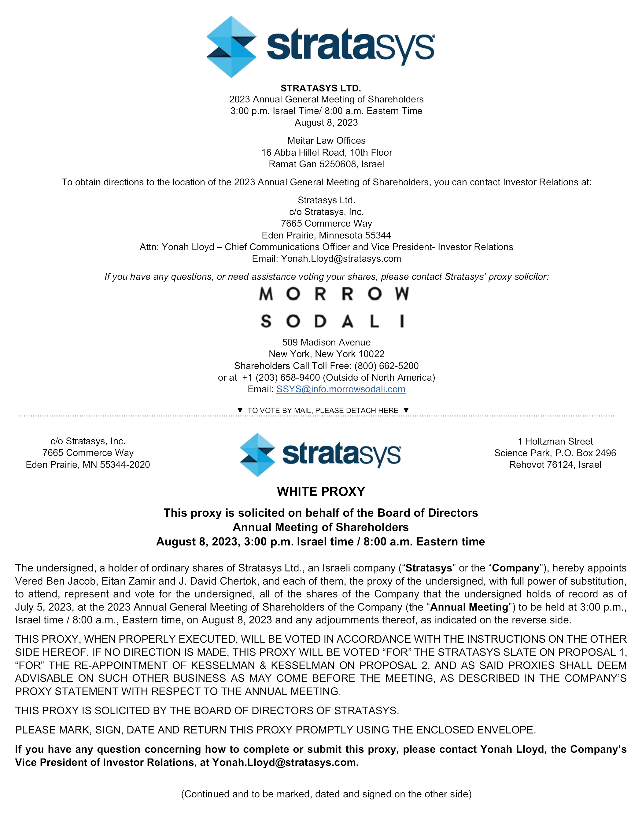 STRATASYS LTD. 2023 Annual General Meeting of Shareholders 3:00 p.m. Israel Time/ 8:00 a.m. Eastern Time August 8, 2023 Meitar Law Offices 16 Abba Hillel Road, 10th Floor Ramat Gan 5250608, Israel To obtain directions to the location of the 2023 Annual General Meeting of Shareholders, you can contact Investor Relations at: Stratasys Ltd. c/o Stratasys, Inc. 7665 Commerce Way Eden Prairie, Minnesota 55344 Attn: Yonah Lloyd – Chief Communications Officer and Vice President- Investor Relations Email: Yonah.Lloyd@stratasys.com If you have any questions, or need assistance voting your shares, please contact Stratasys’ proxy solicitor: 509 Madison Avenue New York, New York 10022 Shareholders Call Toll Free: (800) 662-5200 or at +1 (203) 658-9400 (Outside of North America) Email: SSYS@info.morrowsodali.com TO VOTE BY MAIL, PLEASE DETACH HERE c/o Stratasys, Inc. 7665 Commerce Way Eden Prairie, MN 55344-2020 1 Holtzman Street Science Park, P.O. Box 2496 Rehovot 76124, Israel WHITE PROXY This proxy is solicited on behalf of the Board of Directors Annual Meeting of Shareholders August 8, 2023, 3:00 p.m. Israel time / 8:00 a.m. Eastern time The undersigned, a holder of ordinary shares of Stratasys Ltd., an Israeli company (“Stratasys” or the “Company”), hereby appoints Vered Ben Jacob, Eitan Zamir and J. David Chertok, and each of them, the proxy of the undersigned, with full power of substitution, to attend, represent and vote for the undersigned, all of the shares of the Company that the undersigned holds of record as of July 5, 2023, at the 2023 Annual General Meeting of Shareholders of the Company (the “Annual Meeting”) to be held at 3:00 p.m., Israel time / 8:00 a.m., Eastern time, on August 8, 2023 and any adjournments thereof, as indicated on the reverse side. THIS PROXY, WHEN PROPERLY EXECUTED, WILL BE VOTED IN ACCORDANCE WITH THE INSTRUCTIONS ON THE OTHER SIDE HEREOF. IF NO DIRECTION IS MADE, THIS PROXY WILL BE VOTED “FOR” THE STRATASYS SLATE ON PROPOSAL 1, “FOR” THE RE-APPOINTMENT OF KESSELMAN & KESSELMAN ON PROPOSAL 2, AND AS SAID PROXIES SHALL DEEM ADVISABLE ON SUCH OTHER BUSINESS AS MAY COME BEFORE THE MEETING, AS DESCRIBED IN THE COMPANY’S PROXY STATEMENT WITH RESPECT TO THE ANNUAL MEETING. THIS PROXY IS SOLICITED BY THE BOARD OF DIRECTORS OF STRATASYS. PLEASE MARK, SIGN, DATE AND RETURN THIS PROXY PROMPTLY USING THE ENCLOSED ENVELOPE. If you have any question concerning how to complete or submit this proxy, please contact Yonah Lloyd, the Company’s Vice President of Investor Relations, at Yonah.Lloyd@stratasys.com. (Continued and to be marked, dated and signed on the other side)
