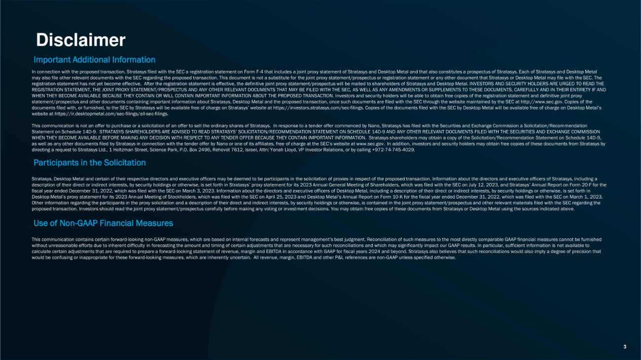 Disclaimer 2 Forward - Looking Statements This document contains forward - looking statements that involve risks, uncertainties and assumptions. If the risks or uncertainties ever materialize or the assumptions prove incorrect, the actual results of Stratasys Ltd. and its consolidated subsidiaries (“Stratasys”) may differ materially from those expressed or implied by such forward - looking statements and assumptions. All statements other than statements of historical fact are statements that could be deemed forward - looking statements. Such forward - looking statements include statements relating to the proposed transaction between Stratasys and Desktop Metal, Inc. (“Desktop Metal”), including statements regarding the benefits of the transaction and the anticipated timing of the transaction, and information regarding the businesses of Stratasys and Desktop Metal, including expectations regarding outlook and all underlying assumptions, Stratasys’ and Desktop Metal’s objectives, plans and strategies, information relating to operating trends in markets where Stratasys and Desktop Metal operate, statements that contain projections of results of operations or of financial condition and all other statements other than statements of historical fact that address activities, events or developments that Stratasys or Desktop Metal intends, expects, projects, believes or anticipates will or may occur in the future. Such statements are based on management’s beliefs and assumptions made based on information currently available to management. All statements in this communication, other than statements of historical fact, are forward - looking statements that may be identified by the use of the words “outlook,” “guidance,” “expects,” “believes,” “anticipates,” “should,” “estimates,” and similar expressions. These forward - looking statements involve known and unknown risks and uncertainties, which may cause Stratasys’ or Desktop Metal’s actual results and performance to be materially different from those expressed or implied in the forward - looking statements. Factors and risks that may impact future results and performance include, but are not limited to those factors and risks described in Item 3.D “Key Information - Risk Factors”, Item 4 “Information on the Company”, and Item 5 “Operating and Financial Review and Prospects” in Stratasys’ Annual Report on Form 20 - F for the year ended December 31, 2022 and Part 1, Item 1A, “Risk Factors” in Desktop Metal’s Annual Report on Form 10 - K for the year ended December 31, 2022, each filed with the Securities and Exchange Commission (the “SEC”), and in other filings by Stratasys and Desktop Metal with the SEC. These include, but are not limited to: factors relating to the partial tender offer commenced by Nano Dimension Ltd. (“Nano”), including actions taken by Nano in connection with the offer, actions taken by Stratasys or its shareholders in respect of the offer and the effects of the offer on Stratasys’ businesses, or other developments involving Nano, the ultimate outcome of the proposed transaction between Stratasys and Desktop Metal, including the possibility that Stratasys or Desktop Metal shareholders will reject the proposed transaction; the effect of the announcement of the proposed transaction on the ability of Stratasys and Desktop Metal to operate their respective businesses and retain and hire key personnel and to maintain favorable business relationships; the timing of the proposed transaction; the occurrence of any event, change or other circumstance that could give rise to the termination of the proposed transaction; the ability to satisfy closing conditions to the completion of the proposed transaction (including any necessary shareholder approvals); other risks related to the completion of the proposed transaction and actions related thereto; changes in demand for Stratasys’ or Desktop Metal’s products and services; global market, political and economic conditions, and in the countries in which Stratasys and Desktop Metal operate in particular; government regulations and approvals; the extent of growth of the 3D printing market generally; the global macro - economic environment, including headwinds caused by inflation, rising interest rates, unfavorable currency exchange rates and potential recessionary conditions; the impact of shifts in prices or margins of the products that Stratasys or Desktop Metal sells or services Stratasys or Desktop Metal provides, including due to a shift towards lower margin products or services; the potential adverse impact that recent global interruptions and delays involving freight carriers and other third parties may have on Stratasys’ or Desktop Metal’s supply chain and distribution network and consequently, Stratasys’ or Desktop Metal’s ability to successfully sell both existing and newly - launched 3D printing products; litigation and regulatory proceedings, including any proceedings that may be instituted against Stratasys or Desktop Metal related to the proposed transaction; impacts of rapid technological change in the additive manufacturing industry, which requires Stratasys and Desktop Metal to continue to develop new products and innovations to meet constantly evolving customer demands and which could adversely affect market adoption of Stratasys’ or Desktop Metal’s products; and disruptions of Stratasys’ or Desktop Metal’s information technology systems. These risks, as well as other risks related to the proposed transaction, are included in the registration statement on Form F - 4 and joint proxy statement/prospectus that has been filed with the Securities and Exchange Commission (“SEC”) in connection with the proposed transaction. While the list of factors presented here is, and the list of factors presented in the registration statement on Form F - 4 are, considered representative, no such lis