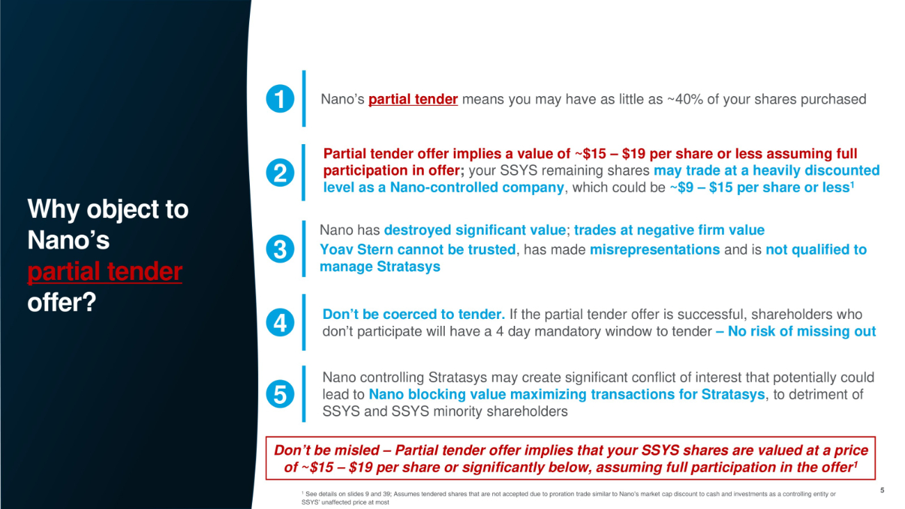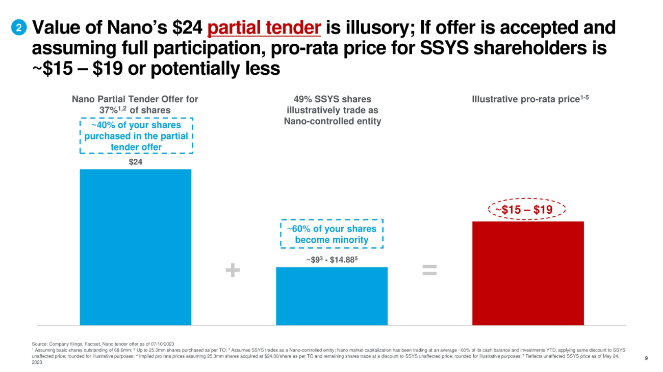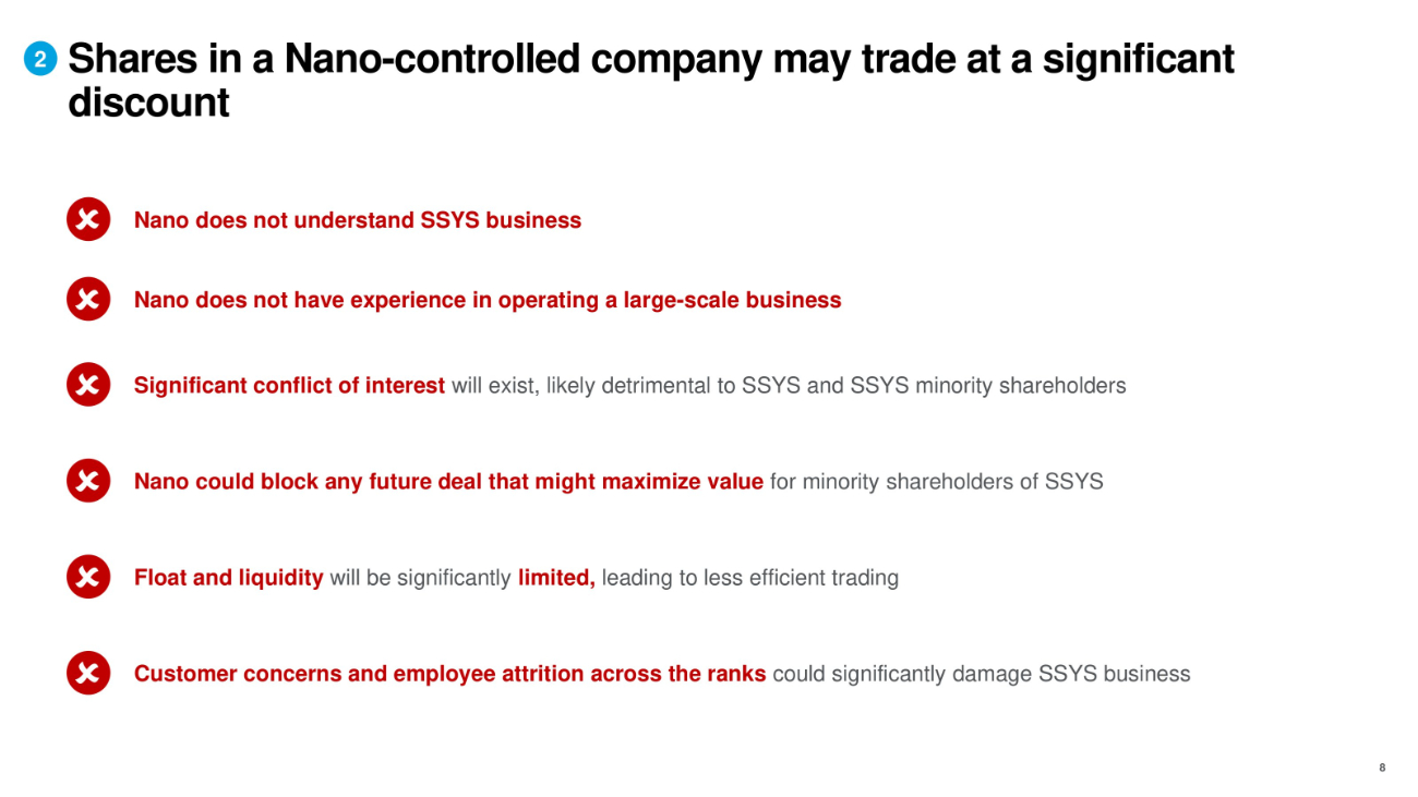 Shares in a Nano - controlled company may trade at a significant discount 2 Nano does not understand SSYS business Significant conflict of interest will exist, likely detrimental to SSYS and SSYS minority shareholders Nano could block any future deal that might maximize value for minority shareholders of SSYS Float and liquidity will be significantly limited, leading to less efficient trading Customer concerns and employee attrition across the ranks could significantly damage SSYS business Nano does not have experience in operating a large - scale business 8