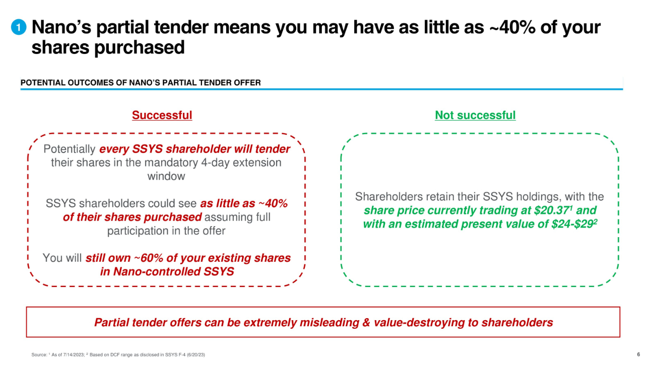 Nano’s partial tender means you may have as little as ~40% of your shares purchased 6 Source: 1 As of 7/14/2023; 2 Based on DCF range as disclosed in SSYS F - 4 (6/20/23) Not successful Shareholders retain their SSYS holdings, with the share price currently trading at $20.37 1 and with an estimated present value of $24 - $29 2 Successful Potentially every SSYS shareholder will tender their shares in the mandatory 4 - day extension window SSYS shareholders could see as little as ~40% of their shares purchased assuming full participation in the offer You will still own ~60% of your existing shares in Nano - controlled SSYS 1 POTENTIAL OUTCOMES OF NANO’S PARTIAL TENDER OFFER Partial tender offers can be extremely misleading & value - destroying to shareholders