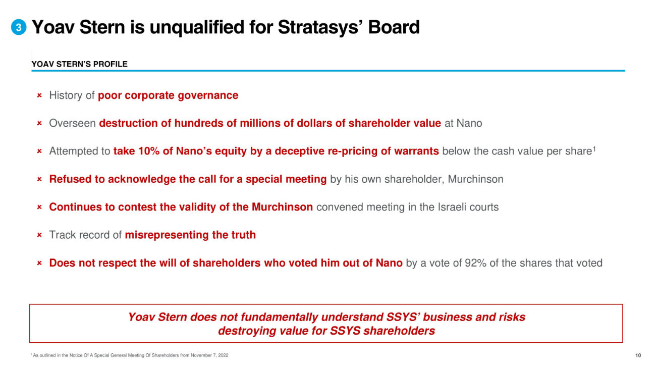 Yoav Stern is unqualified for Stratasys’ Board 10 Yoav Stern does not fundamentally understand SSYS’ business and risks destroying value for SSYS shareholders YOAV STERN’S PROFILE History of poor corporate governance Overseen destruction of hundreds of millions of dollars of shareholder value at Nano Attempted to take 10% of Nano’s equity by a deceptive re - pricing of warrants below the cash value per share 1 Refused to acknowledge the call for a special meeting by his own shareholder, Murchinson Continues to contest the validity of the Murchinson convened meeting in the Israeli courts Track record of misrepresenting the truth Does not respect the will of shareholders who voted him out of Nano by a vote of 92% of the shares that voted 3 1 As outlined in the Notice Of A Special General Meeting Of Shareholders from November 7, 2022