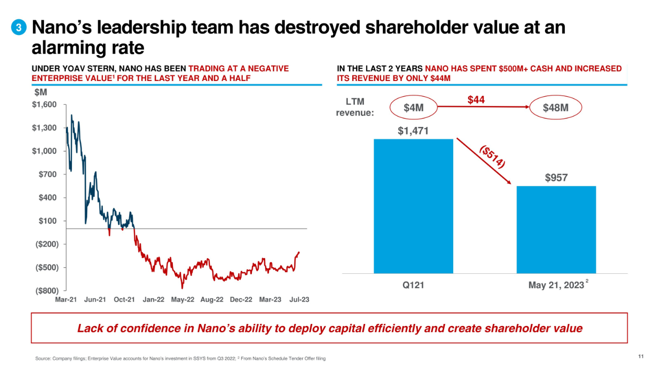 Nano’s leadership team has destroyed shareholder value at an alarming rate 11 Source: Company filings; Enterprise Value accounts for Nano’s investment in SSYS from Q3 2022; 2 From Nano’s Schedule Tender Offer filing Lack of confidence in Nano’s ability to deploy capital efficiently and create shareholder value UNDER YOAV STERN, NANO HAS BEEN TRADING AT A NEGATIVE ENTERPRISE VALUE 1 FOR THE LAST YEAR AND A HALF $1,471 $957 Q121 May 21, 2023 2 IN THE LAST 2 YEARS NANO HAS SPENT $500M+ CASH AND INCREASED ITS REVENUE BY ONLY $44M ($800) Mar - 21 Jun - 21 Oct - 21 Jan - 22 May - 22 Aug - 22 Dec - 22 Mar - 23 Jul - 23 $400 $100 ($200) ($500) $700 $1,000 $1,300 $M $1,600 3 $4M $48M LTM revenue: $44