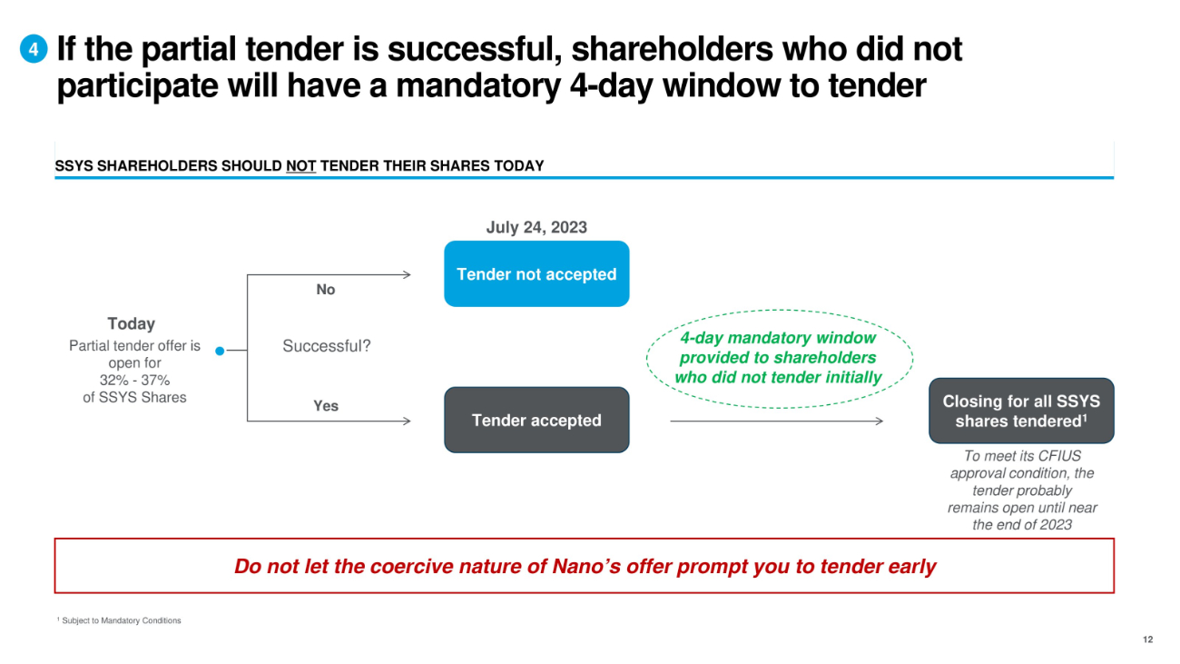 If the partial tender is successful, shareholders who did not participate will have a mandatory 4 - day window to tender Do not let the coercive nature of Nano’s offer prompt you to tender early Today Partial tender offer is open for 32% - 37% of SSYS Shares Tender not accepted Tender accepted Closing for all SSYS shares tendered 1 4 - day mandatory window provided to shareholders who did not tender initially Successful? No Yes SSYS SHAREHOLDERS SHOULD NOT TENDER THEIR SHARES TODAY July 24, 2023 1 Subject to Mandatory Conditions To meet its CFIUS approval condition, the tender probably remains open until near the end of 2023 4 12