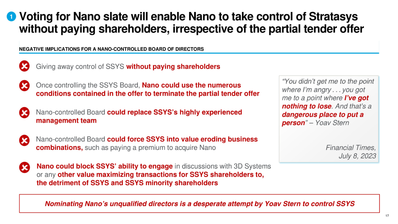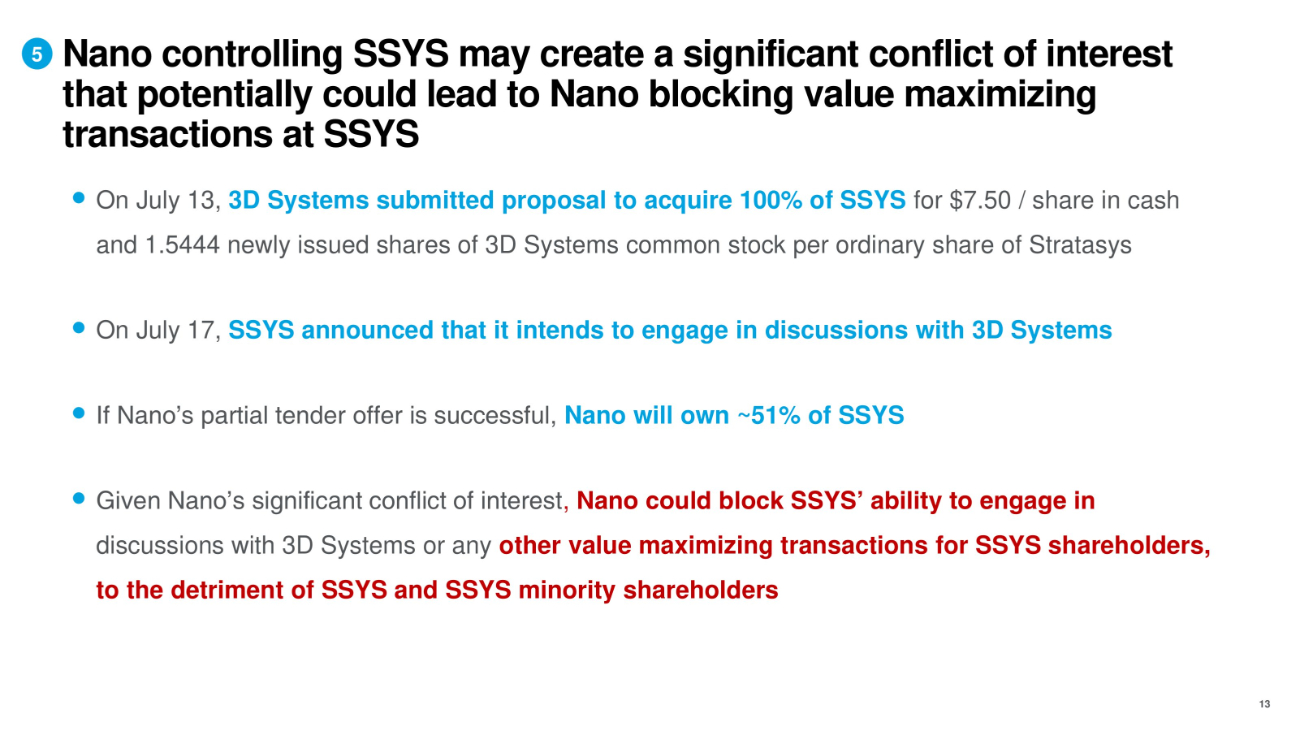 Nano controlling SSYS may create a significant conflict of interest that potentially could lead to Nano blocking value maximizing transactions at SSYS 5 13 O n J u ly 13, 3D Syst e m s submitted proposal to ac q uir e 10 0 % of SSYS for $7.50 / s hare i n c a s h an d 1. 5 444 new l y i s s u e d sh ares of 3D Sy s tems c o m m o n sto c k per or d i nary share of St rat a s y s O n Ju l y 17, SS Y S announc ed that it intend s to engag e in discu s sion s with 3D Systems If Na n o ’s par ti a l t en d er off e r is s u c c e s sf u l, Nano will own ~51% of SSYS Giv e n Na n o ’s s i gn i fi c ant c o nf l i c t of i nt ere s t , Nano could blo c k SSYS’ abi lit y to eng ag e in d is c u s s i ons wit h 3D S y stems or a ny oth e r val u e m a xi m izing tran sact ion s fo r SSYS sh a reholders, to th e detri m ent of SSYS and SSYS min o rit y sh a rehol ders