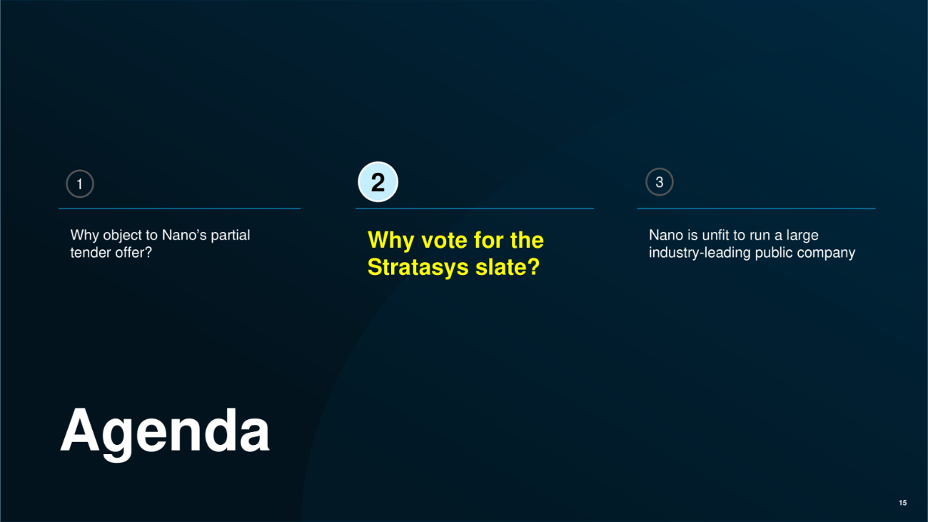 Agenda Why object to Nano’s partial tender offer? Why vote for the Stratasys slate? 1 2 3 4 Nano is unfit to run a large industry - leading public company