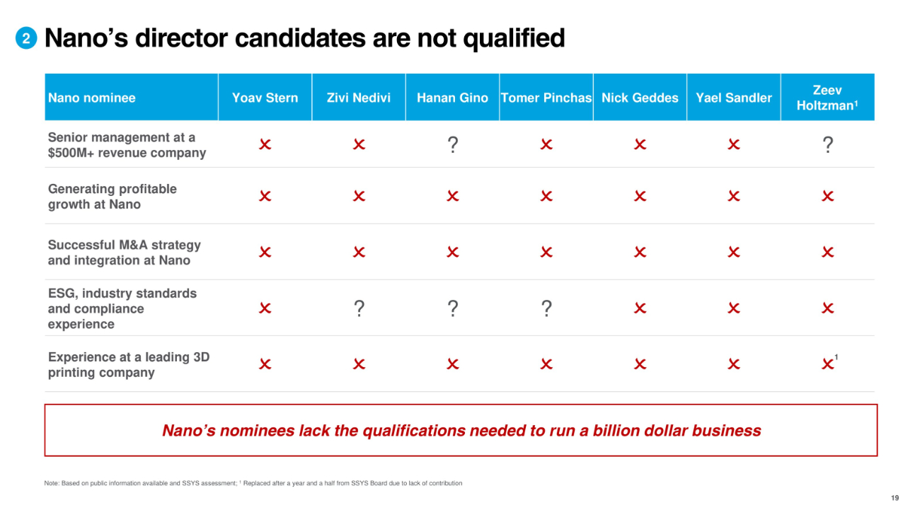 Nano’s slate is not independent and is controlled by Yoav Stern Will blindly follow Yoav Stern or else their current Nano job will be at stake Nano’s nominated directors will continue to operate as Yoav Stern’s subordinates Why was Yoav Stern unable to attract any credible independent director candidates to his slate? Replaced after ~1.5 years from SSYS Board due to lack of contribution 2 Zeev Holtzman Zivi Nedivi President of Nano Hanan Gino CPO / Strategic M&A of Nano Tomer Pinchas COO of Nano Nick Geddes CTO of Nano Yael Sandler CFO of Nano Yoav Stern CEO of Nano 18