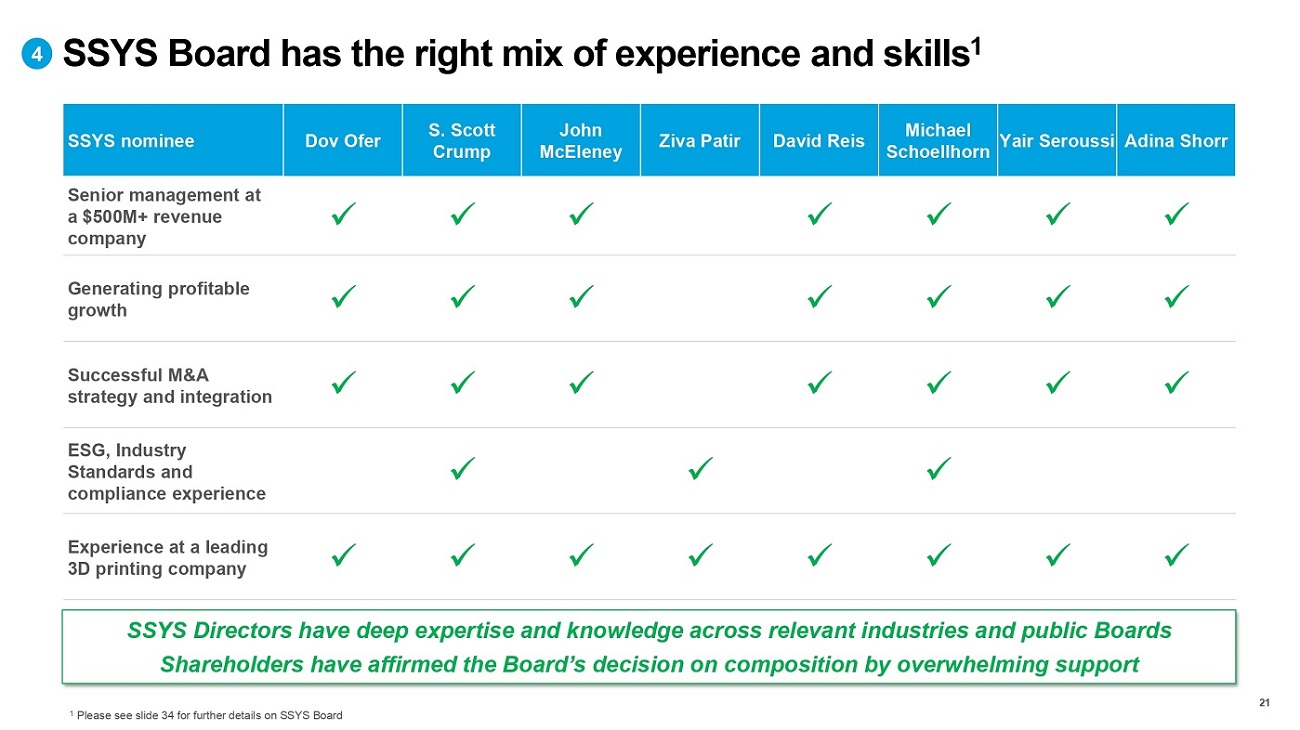 Nano has disastrous governance policies 20 5 of the 9 Nano directors have not been approved by a shareholder vote at all Source: Equity research; 1 Indicating that fewer than 25% of Nano's shares were represented at their meeting How will Nano’s nominees act on SSYS Board if elected? Nano’s classified Board with 3 - year terms limits the ability of shareholders to hold the Board accountable for performance Nano does not respect the right for its shareholders to call special meetings (despite being required by Israeli Law) Nano does not accept the overwhelming vote (92%) of its own shareholders to reform its board Each of the most recent Nano shareholder meetings have been adjourned due to lack of quorum 1 3 Nano does not disclose the voting results specifics of its shareholders votes or director elections