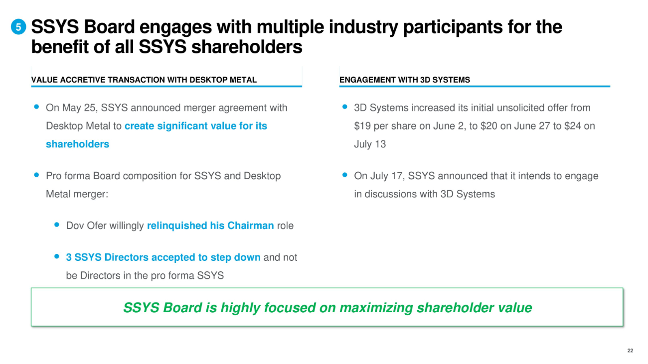 Adina Shorr Yair Seroussi Michael Schoellhorn David Reis Ziva Patir John McEleney S. Scott Crump Dov Ofer SSYS nominee x x x x x x Senior management at a $500M+ revenue company x x x x x x x Generating profitable growth x x x x x x x Successful M&A strategy and integration x x x ESG, Industry Standards and compliance experience x x x x x x x x Experience at a leading 3D printing company SSYS Board has the right mix of experience and skills 1 21 4 SSYS Directors have deep expertise and knowledge across relevant industries and public Boards Shareholders have affirmed the Board’s decision on composition by overwhelming support 1 Please see slide 34 for further details on SSYS Board