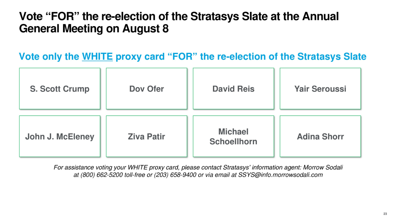 Vote “FOR” the re - election of the Stratasys Slate at the Annual General Meeting on August 8 For assistance voting your WHITE proxy card, please contact Stratasys’ information agent: Morrow Sodali at (800) 662 - 5200 toll - free or (203) 658 - 9400 or via email at SSYS@info.morrowsodali.com Vote only the WHITE proxy card “FOR” the re - election of the Stratasys Slate S. Scott Crump Dov Ofer David Reis Yair Seroussi John J. McEleney Ziva Patir Michael Schoellhorn Adina Shorr 23