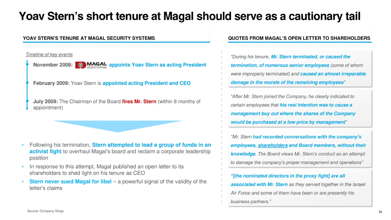 Yoav Stern’s short tenure at Magal should serve as a cautionary tail • Following his termination, Stern attempted to lead a group of funds in an activist fight to overhaul Magal’s board and reclaim a corporate leadership position • In response to this attempt, Magal published an open letter to its shareholders to shed light on his tenure as CEO • Stern never sued Magal for libel – a powerful signal of the validity of the letter’s claims YOAV STERN’S TENURE AT MAGAL SECURITY SYSTEMS 28 QUOTES FROM MAGAL’S OPEN LETTER TO SHAREHOLDERS “After Mr. Stern joined the Company, he clearly indicated to certain employees that his real intention was to cause a management buy out where the shares of the Company would be purchased at a low price by management ” “ [the nominated directors in the proxy fight] are all associated with Mr. Stern as they served together in the Israeli Air Force and some of them have been or are presently his business partners.” “During his tenure, Mr. Stern terminated, or caused the termination, of numerous senior employees (some of whom were improperly terminated) and caused an almost irreparable damage in the morale of the remaining employees ” Source: Company filings appoints Yoav Stern as acting President February 2009: Yoav Stern is appointed acting President and CEO July 2009: The Chairman of the Board fires Mr. Stern (within 8 months of appointment) Timeline of key events November 2008: “Mr. Stern had recorded conversations with the company’s employees, shareholders and Board members, without their knowledge . The Board views Mr. Stern’s conduct as an attempt to damage the company’s proper management and operations”