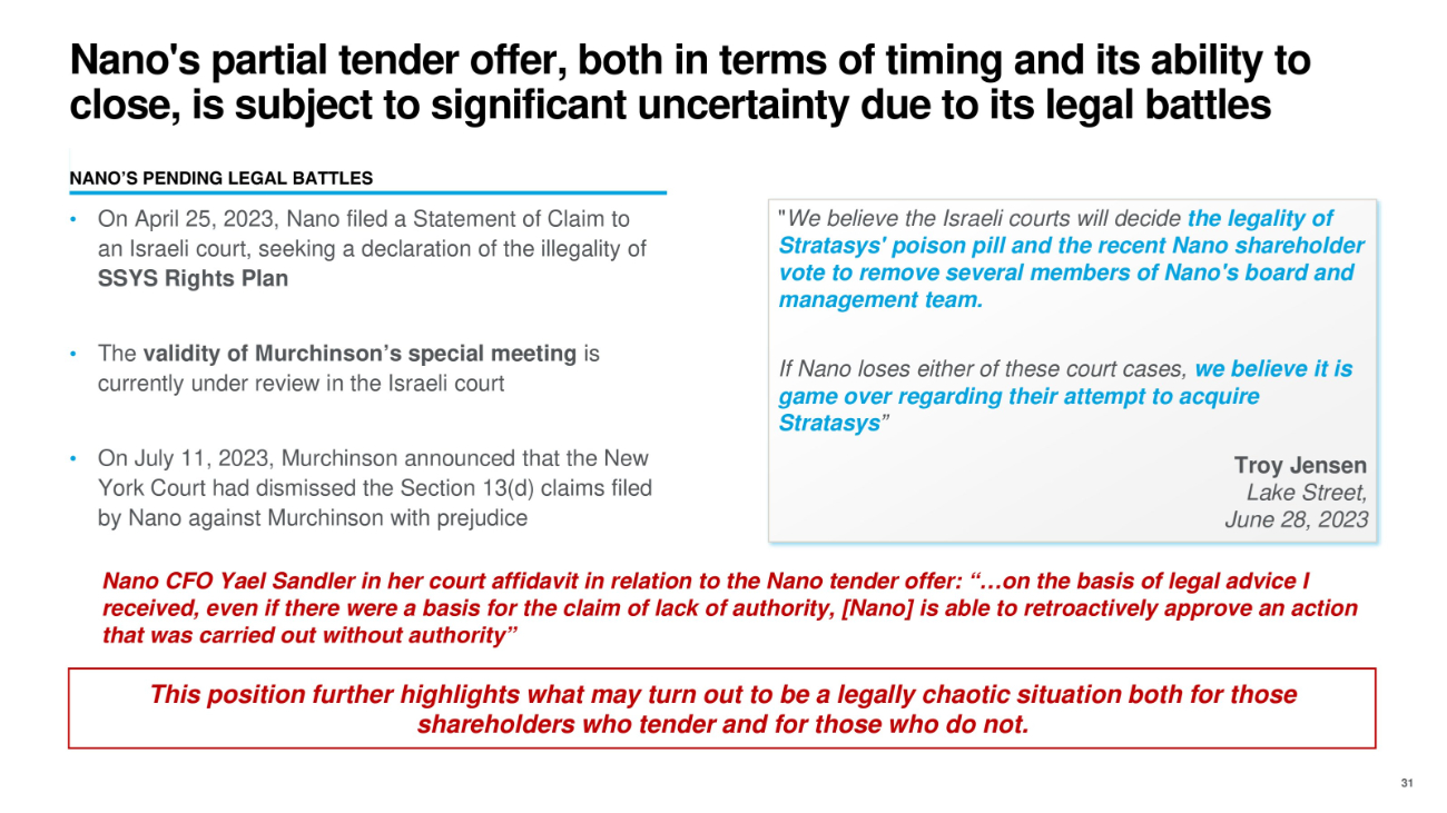 Nano's partial tender offer, both in terms of timing and its ability to close, is subject to significant uncertainty due to its legal battles This position further highlights what may turn out to be a legally chaotic situation both for those shareholders who tender and for those who do not. NANO’S PENDING LEGAL BATTLES • On April 25, 2023, Nano filed a Statement of Claim to an Israeli court, seeking a declaration of the illegality of SSYS Rights Plan • The validity of Murchinson’s special meeting is currently under review in the Israeli court • On July 11 , 2023 , Murchinson announced that the New York Court had dismissed the Section 13 (d) claims filed by Nano against Murchinson with prejudice " We believe the Israeli courts will decide the legality of Stratasys' poison pill and the recent Nano shareholder vote to remove several members of Nano's board and management team. If Nano loses either of these court cases, we believe it is game over regarding their attempt to acquire Stratasys ” Troy Jensen Lake Street, June 28, 2023 31 Nano CFO Yael Sandler in her court affidavit in relation to the Nano tender offer: “…on the basis of legal advice I received, even if there were a basis for the claim of lack of authority, [Nano] is able to retroactively approve an action that was carried out without authority”
