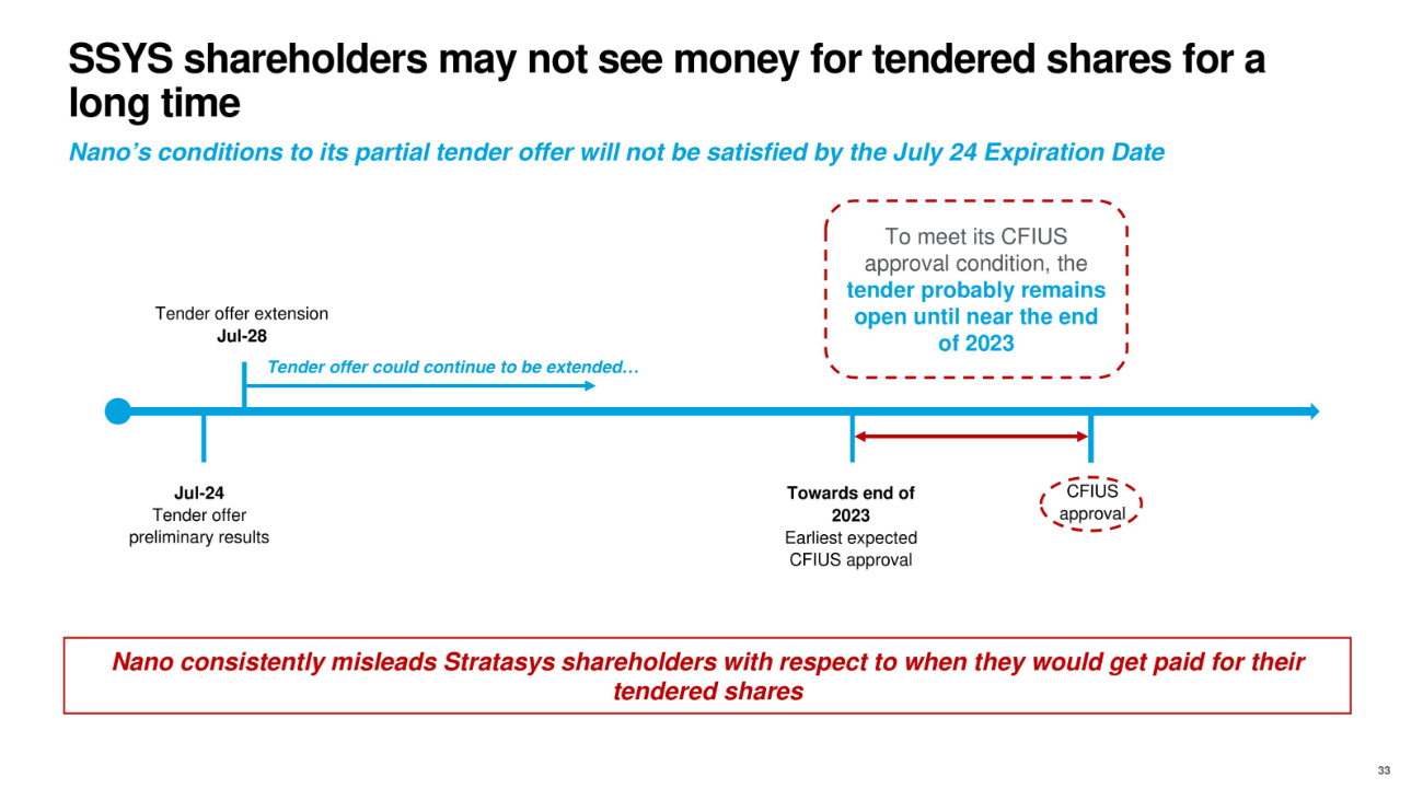 SSYS shareholders may not see money for tendered shares for a long time Nano’s conditions to its partial tender offer will not be satisfied by the July 24 Expiration Date Nano consistently misleads Stratasys shareholders with respect to when they would get paid for their tendered shares Jul - 24 Tender offer preliminary results Tender offer extension Jul - 28 Tender offer could continue to be extended… Towards end of 2023 Earliest expected CFIUS approval CFIUS approval To meet its CFIUS approval condition, the tender probably remains open until near the end of 2023 33