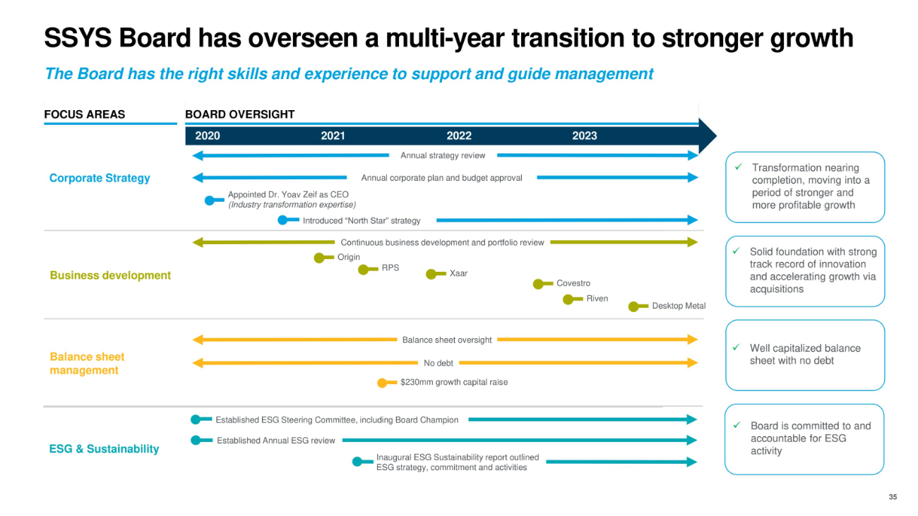 SSYS Board is highly qualified with relevant sector experience and expertise • Chairman of the Board since May 2020, director since July 2017 • Former CEO of Lumenis Computerized Systems (Nasdaq: LMNS) • Previous Corporate Vice President and General Manager at HP Scitex, and former President and CEO of Scitex Vision • Currently serves as Director of Kornit Digital • Director since November 2021, previous SSYS Board experience dating to 1988 • Inventor of FDM technology and Co - founder of Stratasys • Former Stratasys Chief External Affairs and Innovation Officer, and Chief Innovation Officer, in addition to Stratasys previous Chairman, CEO and President • Deep industry and operational experience dating to the earliest days of 3D Printing technology • Director since June 2013 • Consultant to governments on issues of strategy and compliance, risk - based regulatory enforcement activities, standardization and policy • Deep expertise in ESG - related matters • Previous experience at Better Place, Road Safety Authority (RSA) of Israel, Standard Institution of Israel, and the International Organization for Standardization • Currently serves as a Director of ABRA and ELTA Systems Ziva Patir Age: 72 | Director Dov Ofer Age: 68 | Chairman Denotes experience as public company executive • Director since 2007 • Co - founder and previous CEO of Onshape, a 3D product design software company • Former CEO of Cloud Switch, former CEO of SolidWorks (Dassault Systemes) • Pervious experience at Computervision and Raytheon • Currently serves as a Director of InNeuroco, a medical device company focused on neurological access devices John J. McEleney Age: 60 | Director • Director since June 2013, former CEO of Stratasys and Objet • Previous CEO of NUR Macroprinters (acquired by HP) • Former CEO and president of ImageID, and of Scitex Vision • Currently serves as Chairman of Enercon Technologies, Director of Tuttnauer, Director of Seed - X and as a Director of Scodix David Reis Age: 62 | Director • Director since 2017 • Former Chairman and Board member of Bank Hapolim • Founder of the Israeli office and former head of Morgan Stanley Israel • Served in the Israeli Ministry of Finance, where he held several senior positions • Currently a Director at DSP Group, Advisory Team Member at SkyFund and Chairman of ZIM Integrated Shipping Services Yair Seroussi Age: 67 | Director S. Scott Crump Age: 69 | Director • Director since July 2018 • Former CEO of Scodix • Board member of Vision Technology and Highcon Systems • Former CEO and Chairman of Lucidlogix Technologies, CEO of CellGuide and CEO of Objet • Prior experience as executive in Creo, Scitex and IBM • Served as a Board member at Objet Geometries and Advanced Vision Technology Adina Shorr Age: 62 | Director • Director since November 2020 • Current CEO, Aribus Defence and Space and former COO of Airbus • Previous experience as Chief Operating Officer of BSH Home Appliances and various positions at Bosch • Currently serves as member of the Supervisory Board, Premium Aerospace Group, and President of BDLI, the German aerospace industries association Michael Schoellhorn Age: 57 | Director SSYS keeps a balanced Board tenure with 3 directors < 6 years, 4 directors 6 – 10 years and 1 director > 11 years 34