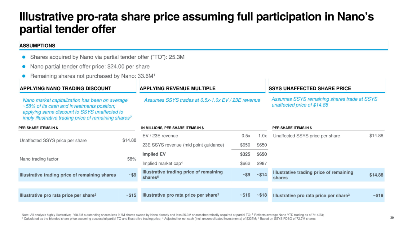 Illustrative pro - rata share price assuming full participation in Nano’s partial tender offer 39 Nano market capitalization has been on average ~58% of its cash and investments position; applying same discount to SSYS unaffected to imply illustrative trading price of remaining shares 2 $14.88 Unaffected SSYS price per share 58% Nano trading factor ~$9 Illustrative trading price of remaining shares ~$15 Illustrative pro rata price per share 3 Note: All analysis highly illustrative; 1 68.6M outstanding shares less 9.7M shares owned by Nano already and less 25.3M shares theoretically acquired at partial TO; 2 Reflects average Nano YTD trading as of 7/14/23; 3 Calculated as the blended share price assuming successful partial TO and illustrative trading price; 4 Adjusted for net cash (incl. unconsolidated investments) of $337M; 5 Based on SSYS FDSO of 72.7M shares Assumes SSYS trades at 0.5x - 1.0x EV / 23E revenue 1.0x 0.5x EV / 23E revenue $650 $650 23E SSYS revenue (mid point guidance) $650 $325 Implied EV $987 $662 Implied market cap 4 ~$14 ~$9 Illustrative trading price of remaining shares 5 ~$18 ~$16 Illustrative pro rata price per share 3 Shares acquired by Nano via partial tender offer (“TO”): 25.3M Nano partial tender offer price: $24.00 per share Remaining shares not purchased by Nano: 33.6M 1 APPLYING NANO TRADING DISCOUNT APPLYING REVENUE MULTIPLE PER SHARE ITEMS IN $ IN MILLIONS, PER SHARE ITEMS IN $ ASSUMPTIONS Assumes SSYS remaining shares trade at SSYS unaffected price of $14.88 SSYS UNAFFECTED SHARE PRICE PER SHARE ITEMS IN $ $14.88 Unaffected SSYS price per share $14.88 Illustrative trading price of remaining shares ~$19 Illustrative pro rata price per share 3