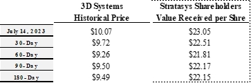 Notes: 3D Systems Historical Price represents 30-, 60-, 90- and 180-day VWAPs; Calculation assumes 3D Systems offer on July 13, 2023, for $7.50 cash and 1.5444 3D Systems shares for one Stratasys share