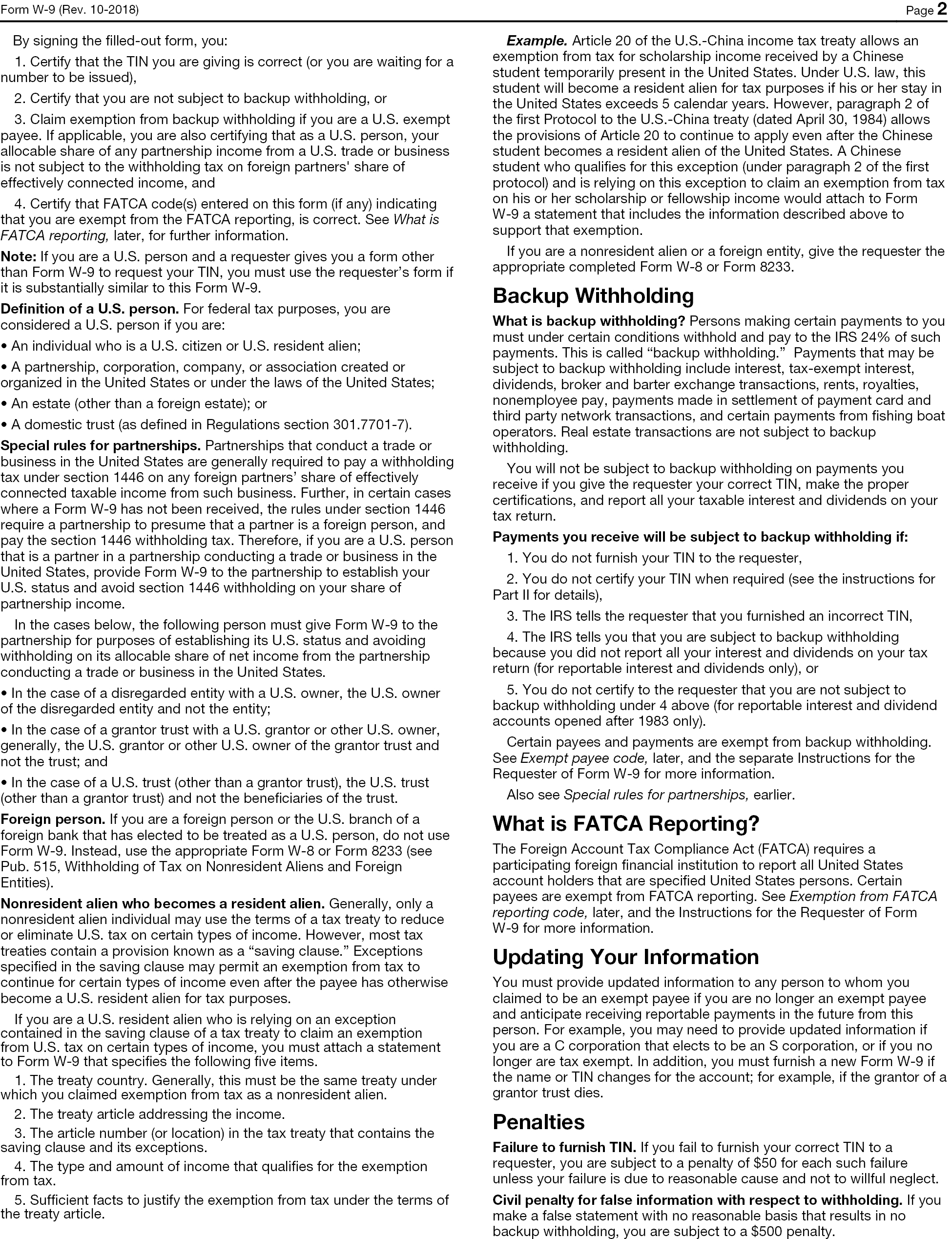 Form W-9 (Rev. 10-2018) Page 2 By signing the filled-out form, you: 1. Certify that the TIN you are giving is correct (or you are waiting for a number to be issued), 2. Certify that you are not subject to backup withholding, or 3. Claim exemption from backup withholding if you are a U.S. exempt payee. If applicable, you are also certifying that as a U.S. person, your allocable share of any partnership income from a U.S. trade or business is not subject to the withholding tax on foreign partners’ share of effectively connected income, and 4. Certify that FATCA code(s) entered on this form (if any) indicating that you are exempt from the FATCA reporting, is correct. See What is FATCA reporting, later, for further information. Note: If you are a U.S. person and a requester gives you a form other than Form W-9 to request your TIN, you must use the requester’s form if it is substantially similar to this Form W-9. Definition of a U.S. person. For federal tax purposes, you are considered a U.S. person if you are: An individual who is a U.S. citizen or U.S. resident alien; A partnership, corporation, company, or association created or organized in the United States or under the laws of the United States; An estate (other than a foreign estate); or A domestic trust (as defined in Regulations section 301.7701-7). Special rules for partnerships. Partnerships that conduct a trade or business in the United States are generally required to pay a withholding tax under section 1446 on any foreign partners’ share of effectively connected taxable income from such business. Further, in certain cases where a Form W-9 has not been received, the rules under section 1446 require a partnership to presume that a partner is a foreign person, and pay the section 1446 withholding tax. Therefore, if you are a U.S. person that is a partner in a partnership conducting a trade or business in the United States, provide Form W-9 to the partnership to establish your U.S. status and avoid section 1446 withholding on your share of partnership income. In the cases below, the following person must give Form W-9 to the partnership for purposes of establishing its U.S. status and avoiding withholding on its allocable share of net income from the partnership conducting a trade or business in the United States. In the case of a disregarded entity with a U.S. owner, the U.S. owner of the disregarded entity and not the entity; In the case of a grantor trust with a U.S. grantor or other U.S. owner, generally, the U.S. grantor or other U.S. owner of the grantor trust and not the trust; and In the case of a U.S. trust (other than a grantor trust), the U.S. trust (other than a grantor trust) and not the beneficiaries of the trust. Foreign person. If you are a foreign person or the U.S. branch of a foreign bank that has elected to be treated as a U.S. person, do not use Form W-9. Instead, use the appropriate Form W-8 or Form 8233 (see Pub. 515, Withholding of Tax on Nonresident Aliens and Foreign Entities). Nonresident alien who becomes a resident alien. Generally, only a nonresident alien individual may use the terms of a tax treaty to reduce or eliminate U.S. tax on certain types of income. However, most tax treaties contain a provision known as a “saving clause.” Exceptions specified in the saving clause may permit an exemption from tax to continue for certain types of income even after the payee has otherwise become a U.S. resident alien for tax purposes. If you are a U.S. resident alien who is relying on an exception contained in the saving clause of a tax treaty to claim an exemption from U.S. tax on certain types of income, you must attach a statement to Form W-9 that specifies the following five items. 1. The treaty country. Generally, this must be the same treaty under which you claimed exemption from tax as a nonresident alien. 2. The treaty article addressing the income. 3. The article number (or location) in the tax treaty that contains the saving clause and its exceptions. 4. The type and amount of income that qualifies for the exemption from tax. 5. Sufficient facts to justify the exemption from tax under the terms of the treaty article. Example. Article 20 of the U.S.-China income tax treaty allows an exemption from tax for scholarship income received by a Chinese student temporarily present in the United States. Under U.S. law, this student will become a resident alien for tax purposes if his or her stay in the United States exceeds 5 calendar years. However, paragraph 2 of the first Protocol to the U.S.-China treaty (dated April 30, 1984) allows the provisions of Article 20 to continue to apply even after the Chinese student becomes a resident alien of the United States. A Chinese student who qualifies for this exception (under paragraph 2 of the first protocol) and is relying on this exception to claim an exemption from tax on his or her scholarship or fellowship income would attach to Form W-9 a statement that includes the information described above to support that exemption. If you are a nonresident alien or a foreign entity, give the requester the appropriate completed Form W-8 or Form 8233. Backup Withholding What is backup withholding? Persons making certain payments to you must under certain conditions withhold and pay to the IRS 24% of such payments. This is called “backup withholding.” Payments that may be subject to backup withholding include interest, tax-exempt interest, dividends, broker and barter exchange transactions, rents, royalties, nonemployee pay, payments made in settlement of payment card and third party network transactions, and certain payments from fishing boat operators. Real estate transactions are not subject to backup withholding. You will not be subject to backup withholding on payments you receive if you give the requester your correct TIN, make the proper certifications, and report all your taxable interest and dividends on your tax return. Payments you receive will be sub