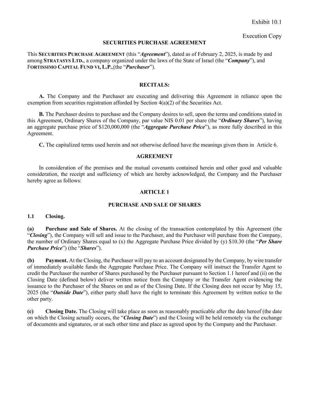 Exhibit 10.1 Execution Copy SECURITIES PURCHASE AGREEMENT This SECURITIES PURCHASE AGREEMENT (this “Agreement”), dated as of February 2, 2025, is made by and among STRATASYS LTD., a company organized under the laws of the State of Israel (the “Company”), and FORTISSIMO CAPITAL FUND VI, L.P.,(the “Purchaser”). RECITALS: A. The Company and the Purchaser are executing and delivering this Agreement in reliance upon the exemption from securities registration afforded by Section 4(a)(2) of the Securities Act. B. The Purchaser desires to purchase and the Company desires to sell, upon the terms and conditions stated in this Agreement, Ordinary Shares of the Company, par value NIS 0.01 per share (the “Ordinary Shares”), having an aggregate purchase price of $120,000,000 (the “Aggregate Purchase Price”), as more fully described in this Agreement. C. The capitalized terms used herein and not otherwise defined have the meanings given them in Article 6. AGREEMENT In consideration of the premises and the mutual covenants contained herein and other good and valuable consideration, the receipt and sufficiency of which are hereby acknowledged, the Company and the Purchaser hereby agree as follows: ARTICLE 1 PURCHASE AND SALE OF SHARES 1.1 Closing. (a) Purchase and Sale of Shares. At the closing of the transaction contemplated by this Agreement (the “Closing”), the Company will sell and issue to the Purchaser, and the Purchaser will purchase from the Company, the number of Ordinary Shares equal to (x) the Aggregate Purchase Price divided by (y) $10.30 (the “Per Share Purchase Price”) (the “Shares”). (b) Payment. At the Closing, the Purchaser will pay to an account designated by the Company, by wire transfer of immediately available funds the Aggregate Purchase Price. The Company will instruct the Transfer Agent to credit the Purchaser the number of Shares purchased by the Purchaser pursuant to Section 1.1 hereof and (ii) on the Closing Date (defined below) deliver written notice from the Company or the Transfer Agent evidencing the issuance to the Purchaser of the Shares on and as of the Closing Date. If the Closing does not occur by May 15, 2025 (the “Outside Date”), either party shall have the right to terminate this Agreement by written notice to the other party. (c) Closing Date. The Closing will take place as soon as reasonably practicable after the date hereof (the date on which the Closing actually occurs, the “Closing Date”) and the Closing will be held remotely via the exchange of documents and signatures, or at such other time and place as agreed upon by the Company and the Purchaser.