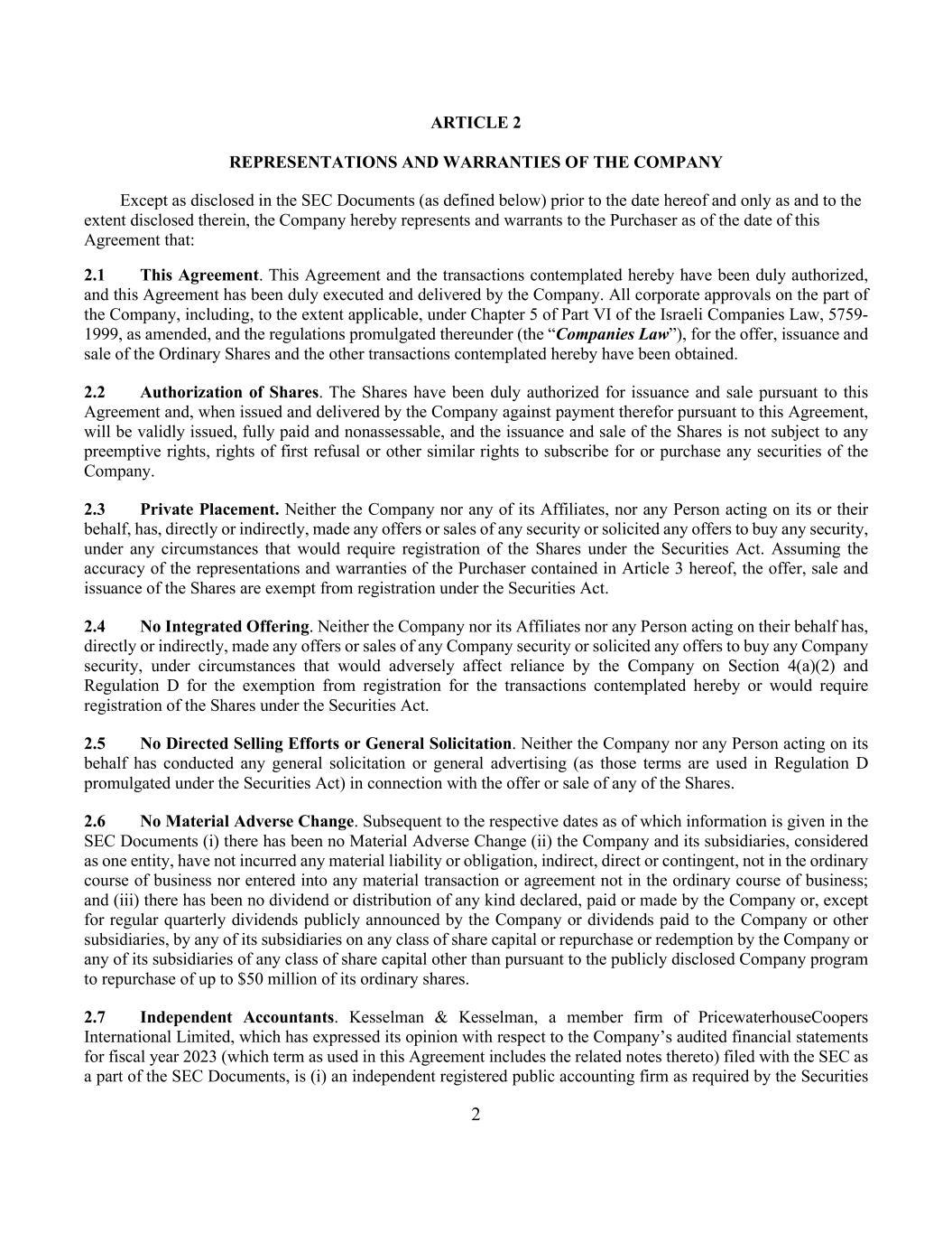 2 ARTICLE 2 REPRESENTATIONS AND WARRANTIES OF THE COMPANY Except as disclosed in the SEC Documents (as defined below) prior to the date hereof and only as and to the extent disclosed therein, the Company hereby represents and warrants to the Purchaser as of the date of this Agreement that: 2.1 This Agreement. This Agreement and the transactions contemplated hereby have been duly authorized, and this Agreement has been duly executed and delivered by the Company. All corporate approvals on the part of the Company, including, to the extent applicable, under Chapter 5 of Part VI of the Israeli Companies Law, 5759- 1999, as amended, and the regulations promulgated thereunder (the “Companies Law”), for the offer, issuance and sale of the Ordinary Shares and the other transactions contemplated hereby have been obtained. 2.2 Authorization of Shares. The Shares have been duly authorized for issuance and sale pursuant to this Agreement and, when issued and delivered by the Company against payment therefor pursuant to this Agreement, will be validly issued, fully paid and nonassessable, and the issuance and sale of the Shares is not subject to any preemptive rights, rights of first refusal or other similar rights to subscribe for or purchase any securities of the Company. 2.3 Private Placement. Neither the Company nor any of its Affiliates, nor any Person acting on its or their behalf, has, directly or indirectly, made any offers or sales of any security or solicited any offers to buy any security, under any circumstances that would require registration of the Shares under the Securities Act. Assuming the accuracy of the representations and warranties of the Purchaser contained in Article 3 hereof, the offer, sale and issuance of the Shares are exempt from registration under the Securities Act. 2.4 No Integrated Offering. Neither the Company nor its Affiliates nor any Person acting on their behalf has, directly or indirectly, made any offers or sales of any Company security or solicited any offers to buy any Company security, under circumstances that would adversely affect reliance by the Company on Section 4(a)(2) and Regulation D for the exemption from registration for the transactions contemplated hereby or would require registration of the Shares under the Securities Act. 2.5 No Directed Selling Efforts or General Solicitation. Neither the Company nor any Person acting on its behalf has conducted any general solicitation or general advertising (as those terms are used in Regulation D promulgated under the Securities Act) in connection with the offer or sale of any of the Shares. 2.6 No Material Adverse Change. Subsequent to the respective dates as of which information is given in the SEC Documents (i) there has been no Material Adverse Change (ii) the Company and its subsidiaries, considered as one entity, have not incurred any material liability or obligation, indirect, direct or contingent, not in the ordinary course of business nor entered into any material transaction or agreement not in the ordinary course of business; and (iii) there has been no dividend or distribution of any kind declared, paid or made by the Company or, except for regular quarterly dividends publicly announced by the Company or dividends paid to the Company or other subsidiaries, by any of its subsidiaries on any class of share capital or repurchase or redemption by the Company or any of its subsidiaries of any class of share capital other than pursuant to the publicly disclosed Company program to repurchase of up to $50 million of its ordinary shares. 2.7 Independent Accountants. Kesselman & Kesselman, a member firm of PricewaterhouseCoopers International Limited, which has expressed its opinion with respect to the Company’s audited financial statements for fiscal year 2023 (which term as used in this Agreement includes the related notes thereto) filed with the SEC as a part of the SEC Documents, is (i) an independent registered public accounting firm as required by the Securities