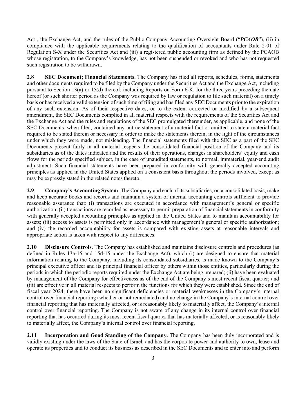 3 Act , the Exchange Act, and the rules of the Public Company Accounting Oversight Board (“PCAOB”), (ii) in compliance with the applicable requirements relating to the qualification of accountants under Rule 2-01 of Regulation S-X under the Securities Act and (iii) a registered public accounting firm as defined by the PCAOB whose registration, to the Company’s knowledge, has not been suspended or revoked and who has not requested such registration to be withdrawn. 2.8 SEC Document; Financial Statements. The Company has filed all reports, schedules, forms, statements and other documents required to be filed by the Company under the Securities Act and the Exchange Act, including pursuant to Section 13(a) or 15(d) thereof, including Reports on Form 6-K, for the three years preceding the date hereof (or such shorter period as the Company was required by law or regulation to file such material) on a timely basis or has received a valid extension of such time of filing and has filed any SEC Documents prior to the expiration of any such extension. As of their respective dates, or to the extent corrected or modified by a subsequent amendment, the SEC Documents complied in all material respects with the requirements of the Securities Act and the Exchange Act and the rules and regulations of the SEC promulgated thereunder, as applicable, and none of the SEC Documents, when filed, contained any untrue statement of a material fact or omitted to state a material fact required to be stated therein or necessary in order to make the statements therein, in the light of the circumstances under which they were made, not misleading. The financial statements filed with the SEC as a part of the SEC Documents present fairly in all material respects the consolidated financial position of the Company and its subsidiaries as of the dates indicated and the results of their operations, changes in shareholders’ equity and cash flows for the periods specified subject, in the case of unaudited statements, to normal, immaterial, year-end audit adjustment. Such financial statements have been prepared in conformity with generally accepted accounting principles as applied in the United States applied on a consistent basis throughout the periods involved, except as may be expressly stated in the related notes thereto. 2.9 Company’s Accounting System. The Company and each of its subsidiaries, on a consolidated basis, make and keep accurate books and records and maintain a system of internal accounting controls sufficient to provide reasonable assurance that: (i) transactions are executed in accordance with management’s general or specific authorization; (ii) transactions are recorded as necessary to permit preparation of financial statements in conformity with generally accepted accounting principles as applied in the United States and to maintain accountability for assets; (iii) access to assets is permitted only in accordance with management’s general or specific authorization; and (iv) the recorded accountability for assets is compared with existing assets at reasonable intervals and appropriate action is taken with respect to any differences. 2.10 Disclosure Controls. The Company has established and maintains disclosure controls and procedures (as defined in Rules 13a-15 and 15d-15 under the Exchange Act), which (i) are designed to ensure that material information relating to the Company, including its consolidated subsidiaries, is made known to the Company’s principal executive officer and its principal financial officer by others within those entities, particularly during the periods in which the periodic reports required under the Exchange Act are being prepared; (ii) have been evaluated by management of the Company for effectiveness as of the end of the Company’s most recent fiscal quarter; and (iii) are effective in all material respects to perform the functions for which they were established. Since the end of fiscal year 2024, there have been no significant deficiencies or material weaknesses in the Company’s internal control over financial reporting (whether or not remediated) and no change in the Company’s internal control over financial reporting that has materially affected, or is reasonably likely to materially affect, the Company’s internal control over financial reporting. The Company is not aware of any change in its internal control over financial reporting that has occurred during its most recent fiscal quarter that has materially affected, or is reasonably likely to materially affect, the Company’s internal control over financial reporting. 2.11 Incorporation and Good Standing of the Company. The Company has been duly incorporated and is validly existing under the laws of the State of Israel, and has the corporate power and authority to own, lease and operate its properties and to conduct its business as described in the SEC Documents and to enter into and perform