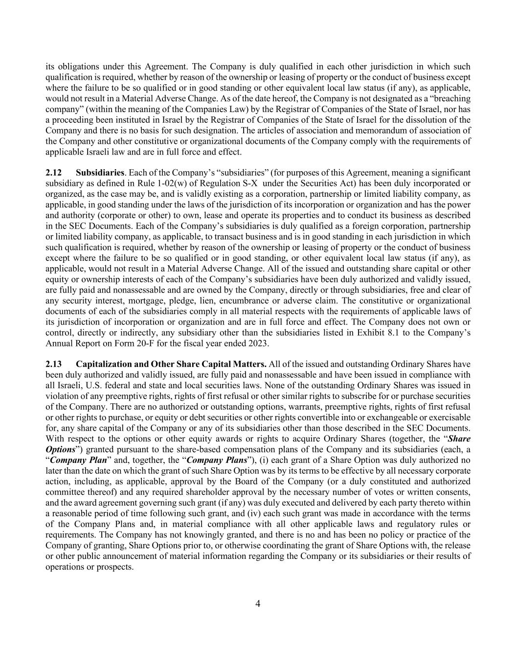 4 its obligations under this Agreement. The Company is duly qualified in each other jurisdiction in which such qualification is required, whether by reason of the ownership or leasing of property or the conduct of business except where the failure to be so qualified or in good standing or other equivalent local law status (if any), as applicable, would not result in a Material Adverse Change. As of the date hereof, the Company is not designated as a “breaching company” (within the meaning of the Companies Law) by the Registrar of Companies of the State of Israel, nor has a proceeding been instituted in Israel by the Registrar of Companies of the State of Israel for the dissolution of the Company and there is no basis for such designation. The articles of association and memorandum of association of the Company and other constitutive or organizational documents of the Company comply with the requirements of applicable Israeli law and are in full force and effect. 2.12 Subsidiaries. Each of the Company’s “subsidiaries” (for purposes of this Agreement, meaning a significant subsidiary as defined in Rule 1-02(w) of Regulation S-X under the Securities Act) has been duly incorporated or organized, as the case may be, and is validly existing as a corporation, partnership or limited liability company, as applicable, in good standing under the laws of the jurisdiction of its incorporation or organization and has the power and authority (corporate or other) to own, lease and operate its properties and to conduct its business as described in the SEC Documents. Each of the Company’s subsidiaries is duly qualified as a foreign corporation, partnership or limited liability company, as applicable, to transact business and is in good standing in each jurisdiction in which such qualification is required, whether by reason of the ownership or leasing of property or the conduct of business except where the failure to be so qualified or in good standing, or other equivalent local law status (if any), as applicable, would not result in a Material Adverse Change. All of the issued and outstanding share capital or other equity or ownership interests of each of the Company’s subsidiaries have been duly authorized and validly issued, are fully paid and nonassessable and are owned by the Company, directly or through subsidiaries, free and clear of any security interest, mortgage, pledge, lien, encumbrance or adverse claim. The constitutive or organizational documents of each of the subsidiaries comply in all material respects with the requirements of applicable laws of its jurisdiction of incorporation or organization and are in full force and effect. The Company does not own or control, directly or indirectly, any subsidiary other than the subsidiaries listed in Exhibit 8.1 to the Company’s Annual Report on Form 20-F for the fiscal year ended 2023. 2.13 Capitalization and Other Share Capital Matters. All of the issued and outstanding Ordinary Shares have been duly authorized and validly issued, are fully paid and nonassessable and have been issued in compliance with all Israeli, U.S. federal and state and local securities laws. None of the outstanding Ordinary Shares was issued in violation of any preemptive rights, rights of first refusal or other similar rights to subscribe for or purchase securities of the Company. There are no authorized or outstanding options, warrants, preemptive rights, rights of first refusal or other rights to purchase, or equity or debt securities or other rights convertible into or exchangeable or exercisable for, any share capital of the Company or any of its subsidiaries other than those described in the SEC Documents. With respect to the options or other equity awards or rights to acquire Ordinary Shares (together, the “Share Options”) granted pursuant to the share-based compensation plans of the Company and its subsidiaries (each, a “Company Plan” and, together, the “Company Plans”), (i) each grant of a Share Option was duly authorized no later than the date on which the grant of such Share Option was by its terms to be effective by all necessary corporate action, including, as applicable, approval by the Board of the Company (or a duly constituted and authorized committee thereof) and any required shareholder approval by the necessary number of votes or written consents, and the award agreement governing such grant (if any) was duly executed and delivered by each party thereto within a reasonable period of time following such grant, and (iv) each such grant was made in accordance with the terms of the Company Plans and, in material compliance with all other applicable laws and regulatory rules or requirements. The Company has not knowingly granted, and there is no and has been no policy or practice of the Company of granting, Share Options prior to, or otherwise coordinating the grant of Share Options with, the release or other public announcement of material information regarding the Company or its subsidiaries or their results of operations or prospects.