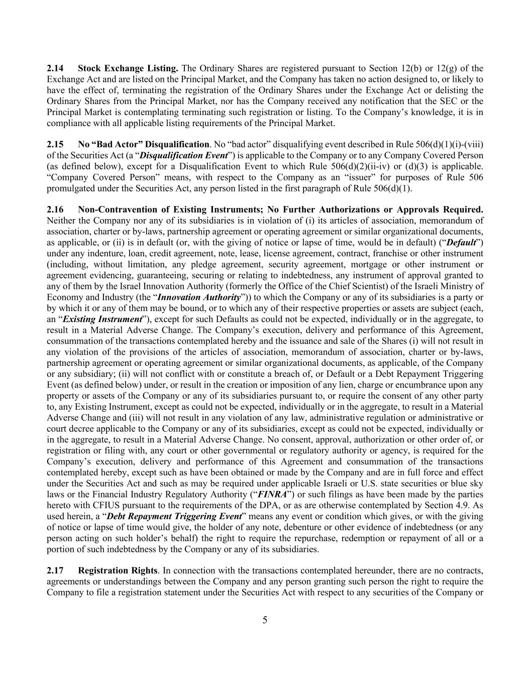 5 2.14 Stock Exchange Listing. The Ordinary Shares are registered pursuant to Section 12(b) or 12(g) of the Exchange Act and are listed on the Principal Market, and the Company has taken no action designed to, or likely to have the effect of, terminating the registration of the Ordinary Shares under the Exchange Act or delisting the Ordinary Shares from the Principal Market, nor has the Company received any notification that the SEC or the Principal Market is contemplating terminating such registration or listing. To the Company’s knowledge, it is in compliance with all applicable listing requirements of the Principal Market. 2.15 No “Bad Actor” Disqualification. No “bad actor” disqualifying event described in Rule 506(d)(1)(i)-(viii) of the Securities Act (a “Disqualification Event”) is applicable to the Company or to any Company Covered Person (as defined below), except for a Disqualification Event to which Rule 506(d)(2)(ii-iv) or (d)(3) is applicable. “Company Covered Person” means, with respect to the Company as an “issuer” for purposes of Rule 506 promulgated under the Securities Act, any person listed in the first paragraph of Rule 506(d)(1). 2.16 Non-Contravention of Existing Instruments; No Further Authorizations or Approvals Required. Neither the Company nor any of its subsidiaries is in violation of (i) its articles of association, memorandum of association, charter or by-laws, partnership agreement or operating agreement or similar organizational documents, as applicable, or (ii) is in default (or, with the giving of notice or lapse of time, would be in default) (“Default”) under any indenture, loan, credit agreement, note, lease, license agreement, contract, franchise or other instrument (including, without limitation, any pledge agreement, security agreement, mortgage or other instrument or agreement evidencing, guaranteeing, securing or relating to indebtedness, any instrument of approval granted to any of them by the Israel Innovation Authority (formerly the Office of the Chief Scientist) of the Israeli Ministry of Economy and Industry (the “Innovation Authority”)) to which the Company or any of its subsidiaries is a party or by which it or any of them may be bound, or to which any of their respective properties or assets are subject (each, an “Existing Instrument”), except for such Defaults as could not be expected, individually or in the aggregate, to result in a Material Adverse Change. The Company’s execution, delivery and performance of this Agreement, consummation of the transactions contemplated hereby and the issuance and sale of the Shares (i) will not result in any violation of the provisions of the articles of association, memorandum of association, charter or by-laws, partnership agreement or operating agreement or similar organizational documents, as applicable, of the Company or any subsidiary; (ii) will not conflict with or constitute a breach of, or Default or a Debt Repayment Triggering Event (as defined below) under, or result in the creation or imposition of any lien, charge or encumbrance upon any property or assets of the Company or any of its subsidiaries pursuant to, or require the consent of any other party to, any Existing Instrument, except as could not be expected, individually or in the aggregate, to result in a Material Adverse Change and (iii) will not result in any violation of any law, administrative regulation or administrative or court decree applicable to the Company or any of its subsidiaries, except as could not be expected, individually or in the aggregate, to result in a Material Adverse Change. No consent, approval, authorization or other order of, or registration or filing with, any court or other governmental or regulatory authority or agency, is required for the Company’s execution, delivery and performance of this Agreement and consummation of the transactions contemplated hereby, except such as have been obtained or made by the Company and are in full force and effect under the Securities Act and such as may be required under applicable Israeli or U.S. state securities or blue sky laws or the Financial Industry Regulatory Authority (“FINRA”) or such filings as have been made by the parties hereto with CFIUS pursuant to the requirements of the DPA, or as are otherwise contemplated by Section 4.9. As used herein, a “Debt Repayment Triggering Event” means any event or condition which gives, or with the giving of notice or lapse of time would give, the holder of any note, debenture or other evidence of indebtedness (or any person acting on such holder’s behalf) the right to require the repurchase, redemption or repayment of all or a portion of such indebtedness by the Company or any of its subsidiaries. 2.17 Registration Rights. In connection with the transactions contemplated hereunder, there are no contracts, agreements or understandings between the Company and any person granting such person the right to require the Company to file a registration statement under the Securities Act with respect to any securities of the Company or