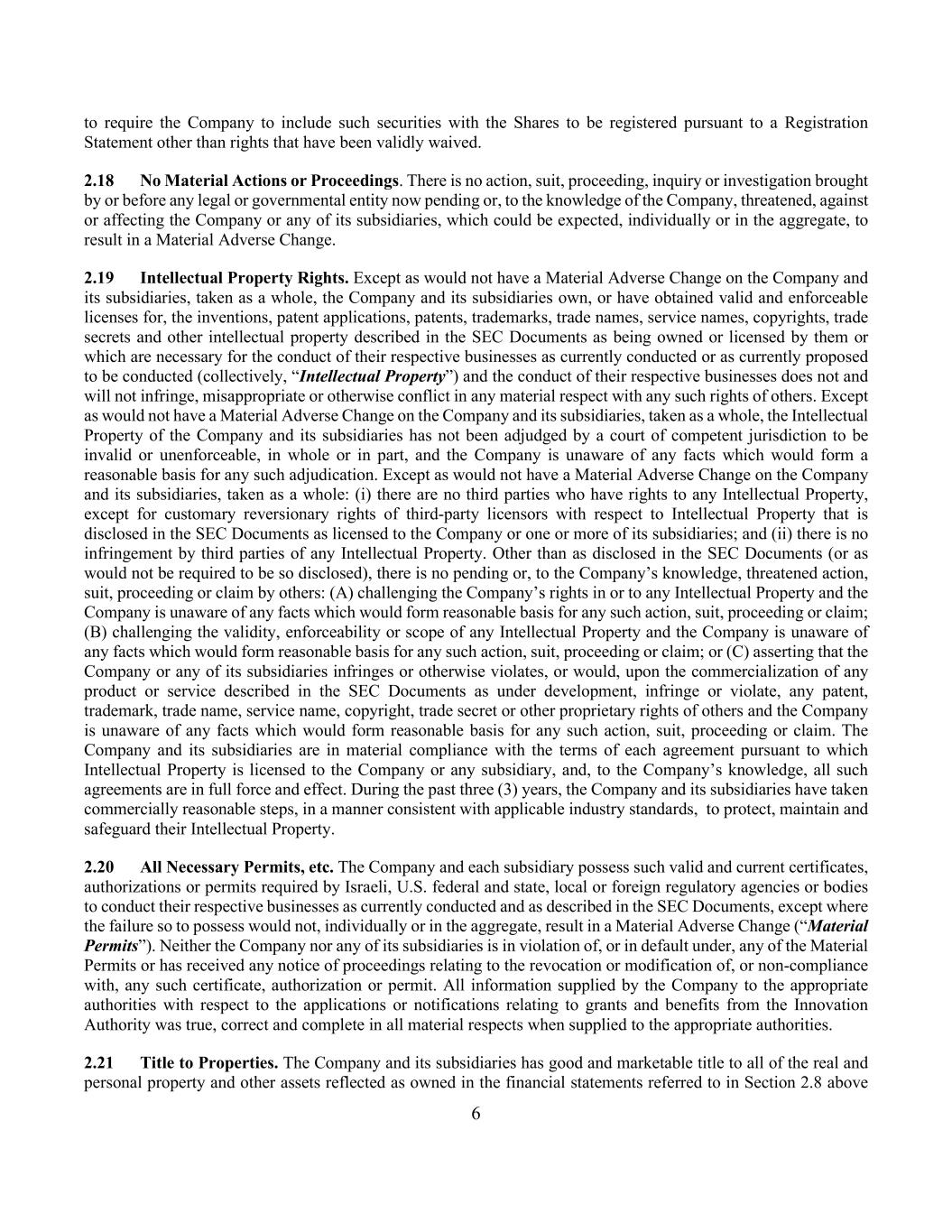 6 to require the Company to include such securities with the Shares to be registered pursuant to a Registration Statement other than rights that have been validly waived. 2.18 No Material Actions or Proceedings. There is no action, suit, proceeding, inquiry or investigation brought by or before any legal or governmental entity now pending or, to the knowledge of the Company, threatened, against or affecting the Company or any of its subsidiaries, which could be expected, individually or in the aggregate, to result in a Material Adverse Change. 2.19 Intellectual Property Rights. Except as would not have a Material Adverse Change on the Company and its subsidiaries, taken as a whole, the Company and its subsidiaries own, or have obtained valid and enforceable licenses for, the inventions, patent applications, patents, trademarks, trade names, service names, copyrights, trade secrets and other intellectual property described in the SEC Documents as being owned or licensed by them or which are necessary for the conduct of their respective businesses as currently conducted or as currently proposed to be conducted (collectively, “Intellectual Property”) and the conduct of their respective businesses does not and will not infringe, misappropriate or otherwise conflict in any material respect with any such rights of others. Except as would not have a Material Adverse Change on the Company and its subsidiaries, taken as a whole, the Intellectual Property of the Company and its subsidiaries has not been adjudged by a court of competent jurisdiction to be invalid or unenforceable, in whole or in part, and the Company is unaware of any facts which would form a reasonable basis for any such adjudication. Except as would not have a Material Adverse Change on the Company and its subsidiaries, taken as a whole: (i) there are no third parties who have rights to any Intellectual Property, except for customary reversionary rights of third-party licensors with respect to Intellectual Property that is disclosed in the SEC Documents as licensed to the Company or one or more of its subsidiaries; and (ii) there is no infringement by third parties of any Intellectual Property. Other than as disclosed in the SEC Documents (or as would not be required to be so disclosed), there is no pending or, to the Company’s knowledge, threatened action, suit, proceeding or claim by others: (A) challenging the Company’s rights in or to any Intellectual Property and the Company is unaware of any facts which would form reasonable basis for any such action, suit, proceeding or claim; (B) challenging the validity, enforceability or scope of any Intellectual Property and the Company is unaware of any facts which would form reasonable basis for any such action, suit, proceeding or claim; or (C) asserting that the Company or any of its subsidiaries infringes or otherwise violates, or would, upon the commercialization of any product or service described in the SEC Documents as under development, infringe or violate, any patent, trademark, trade name, service name, copyright, trade secret or other proprietary rights of others and the Company is unaware of any facts which would form reasonable basis for any such action, suit, proceeding or claim. The Company and its subsidiaries are in material compliance with the terms of each agreement pursuant to which Intellectual Property is licensed to the Company or any subsidiary, and, to the Company’s knowledge, all such agreements are in full force and effect. During the past three (3) years, the Company and its subsidiaries have taken commercially reasonable steps, in a manner consistent with applicable industry standards, to protect, maintain and safeguard their Intellectual Property. 2.20 All Necessary Permits, etc. The Company and each subsidiary possess such valid and current certificates, authorizations or permits required by Israeli, U.S. federal and state, local or foreign regulatory agencies or bodies to conduct their respective businesses as currently conducted and as described in the SEC Documents, except where the failure so to possess would not, individually or in the aggregate, result in a Material Adverse Change (“Material Permits”). Neither the Company nor any of its subsidiaries is in violation of, or in default under, any of the Material Permits or has received any notice of proceedings relating to the revocation or modification of, or non-compliance with, any such certificate, authorization or permit. All information supplied by the Company to the appropriate authorities with respect to the applications or notifications relating to grants and benefits from the Innovation Authority was true, correct and complete in all material respects when supplied to the appropriate authorities. 2.21 Title to Properties. The Company and its subsidiaries has good and marketable title to all of the real and personal property and other assets reflected as owned in the financial statements referred to in Section 2.8 above