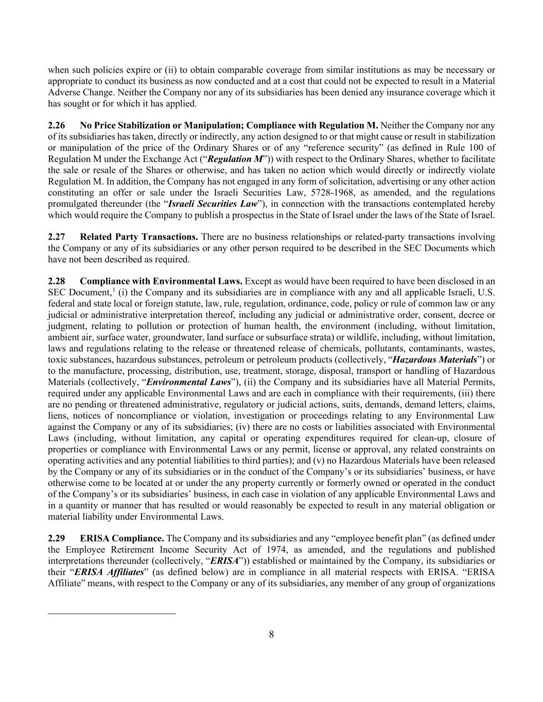 8 when such policies expire or (ii) to obtain comparable coverage from similar institutions as may be necessary or appropriate to conduct its business as now conducted and at a cost that could not be expected to result in a Material Adverse Change. Neither the Company nor any of its subsidiaries has been denied any insurance coverage which it has sought or for which it has applied. 2.26 No Price Stabilization or Manipulation; Compliance with Regulation M. Neither the Company nor any of its subsidiaries has taken, directly or indirectly, any action designed to or that might cause or result in stabilization or manipulation of the price of the Ordinary Shares or of any “reference security” (as defined in Rule 100 of Regulation M under the Exchange Act (“Regulation M”)) with respect to the Ordinary Shares, whether to facilitate the sale or resale of the Shares or otherwise, and has taken no action which would directly or indirectly violate Regulation M. In addition, the Company has not engaged in any form of solicitation, advertising or any other action constituting an offer or sale under the Israeli Securities Law, 5728-1968, as amended, and the regulations promulgated thereunder (the “Israeli Securities Law”), in connection with the transactions contemplated hereby which would require the Company to publish a prospectus in the State of Israel under the laws of the State of Israel. 2.27 Related Party Transactions. There are no business relationships or related-party transactions involving the Company or any of its subsidiaries or any other person required to be described in the SEC Documents which have not been described as required. 2.28 Compliance with Environmental Laws. Except as would have been required to have been disclosed in an SEC Document,1 (i) the Company and its subsidiaries are in compliance with any and all applicable Israeli, U.S. federal and state local or foreign statute, law, rule, regulation, ordinance, code, policy or rule of common law or any judicial or administrative interpretation thereof, including any judicial or administrative order, consent, decree or judgment, relating to pollution or protection of human health, the environment (including, without limitation, ambient air, surface water, groundwater, land surface or subsurface strata) or wildlife, including, without limitation, laws and regulations relating to the release or threatened release of chemicals, pollutants, contaminants, wastes, toxic substances, hazardous substances, petroleum or petroleum products (collectively, “Hazardous Materials”) or to the manufacture, processing, distribution, use, treatment, storage, disposal, transport or handling of Hazardous Materials (collectively, “Environmental Laws”), (ii) the Company and its subsidiaries have all Material Permits, required under any applicable Environmental Laws and are each in compliance with their requirements, (iii) there are no pending or threatened administrative, regulatory or judicial actions, suits, demands, demand letters, claims, liens, notices of noncompliance or violation, investigation or proceedings relating to any Environmental Law against the Company or any of its subsidiaries; (iv) there are no costs or liabilities associated with Environmental Laws (including, without limitation, any capital or operating expenditures required for clean-up, closure of properties or compliance with Environmental Laws or any permit, license or approval, any related constraints on operating activities and any potential liabilities to third parties); and (v) no Hazardous Materials have been released by the Company or any of its subsidiaries or in the conduct of the Company’s or its subsidiaries’ business, or have otherwise come to be located at or under the any property currently or formerly owned or operated in the conduct of the Company’s or its subsidiaries’ business, in each case in violation of any applicable Environmental Laws and in a quantity or manner that has resulted or would reasonably be expected to result in any material obligation or material liability under Environmental Laws. 2.29 ERISA Compliance. The Company and its subsidiaries and any “employee benefit plan” (as defined under the Employee Retirement Income Security Act of 1974, as amended, and the regulations and published interpretations thereunder (collectively, “ERISA”)) established or maintained by the Company, its subsidiaries or their “ERISA Affiliates” (as defined below) are in compliance in all material respects with ERISA. “ERISA Affiliate” means, with respect to the Company or any of its subsidiaries, any member of any group of organizations