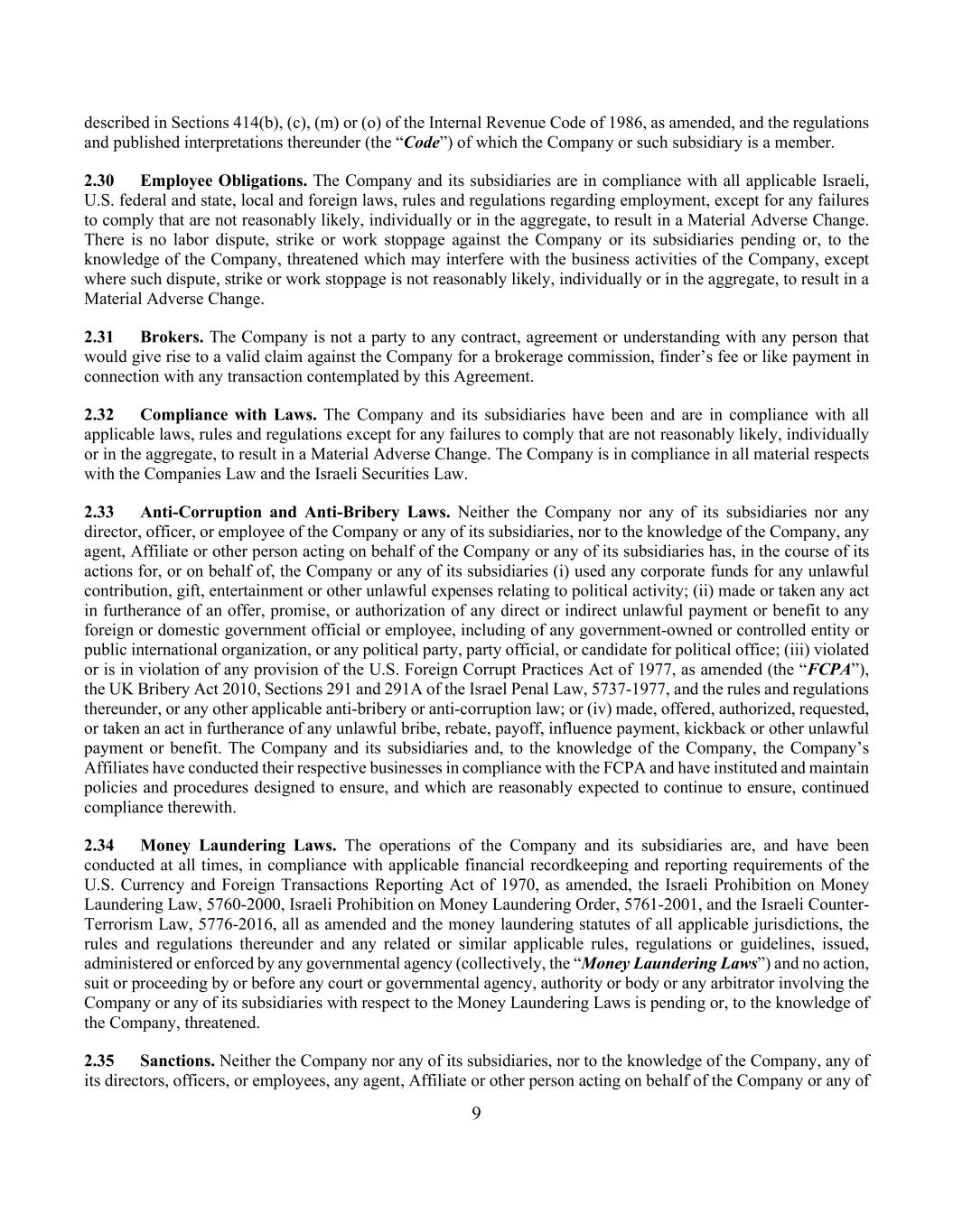 9 described in Sections 414(b), (c), (m) or (o) of the Internal Revenue Code of 1986, as amended, and the regulations and published interpretations thereunder (the “Code”) of which the Company or such subsidiary is a member. 2.30 Employee Obligations. The Company and its subsidiaries are in compliance with all applicable Israeli, U.S. federal and state, local and foreign laws, rules and regulations regarding employment, except for any failures to comply that are not reasonably likely, individually or in the aggregate, to result in a Material Adverse Change. There is no labor dispute, strike or work stoppage against the Company or its subsidiaries pending or, to the knowledge of the Company, threatened which may interfere with the business activities of the Company, except where such dispute, strike or work stoppage is not reasonably likely, individually or in the aggregate, to result in a Material Adverse Change. 2.31 Brokers. The Company is not a party to any contract, agreement or understanding with any person that would give rise to a valid claim against the Company for a brokerage commission, finder’s fee or like payment in connection with any transaction contemplated by this Agreement. 2.32 Compliance with Laws. The Company and its subsidiaries have been and are in compliance with all applicable laws, rules and regulations except for any failures to comply that are not reasonably likely, individually or in the aggregate, to result in a Material Adverse Change. The Company is in compliance in all material respects with the Companies Law and the Israeli Securities Law. 2.33 Anti-Corruption and Anti-Bribery Laws. Neither the Company nor any of its subsidiaries nor any director, officer, or employee of the Company or any of its subsidiaries, nor to the knowledge of the Company, any agent, Affiliate or other person acting on behalf of the Company or any of its subsidiaries has, in the course of its actions for, or on behalf of, the Company or any of its subsidiaries (i) used any corporate funds for any unlawful contribution, gift, entertainment or other unlawful expenses relating to political activity; (ii) made or taken any act in furtherance of an offer, promise, or authorization of any direct or indirect unlawful payment or benefit to any foreign or domestic government official or employee, including of any government-owned or controlled entity or public international organization, or any political party, party official, or candidate for political office; (iii) violated or is in violation of any provision of the U.S. Foreign Corrupt Practices Act of 1977, as amended (the “FCPA”), the UK Bribery Act 2010, Sections 291 and 291A of the Israel Penal Law, 5737-1977, and the rules and regulations thereunder, or any other applicable anti-bribery or anti-corruption law; or (iv) made, offered, authorized, requested, or taken an act in furtherance of any unlawful bribe, rebate, payoff, influence payment, kickback or other unlawful payment or benefit. The Company and its subsidiaries and, to the knowledge of the Company, the Company’s Affiliates have conducted their respective businesses in compliance with the FCPA and have instituted and maintain policies and procedures designed to ensure, and which are reasonably expected to continue to ensure, continued compliance therewith. 2.34 Money Laundering Laws. The operations of the Company and its subsidiaries are, and have been conducted at all times, in compliance with applicable financial recordkeeping and reporting requirements of the U.S. Currency and Foreign Transactions Reporting Act of 1970, as amended, the Israeli Prohibition on Money Laundering Law, 5760-2000, Israeli Prohibition on Money Laundering Order, 5761-2001, and the Israeli Counter- Terrorism Law, 5776-2016, all as amended and the money laundering statutes of all applicable jurisdictions, the rules and regulations thereunder and any related or similar applicable rules, regulations or guidelines, issued, administered or enforced by any governmental agency (collectively, the “Money Laundering Laws”) and no action, suit or proceeding by or before any court or governmental agency, authority or body or any arbitrator involving the Company or any of its subsidiaries with respect to the Money Laundering Laws is pending or, to the knowledge of the Company, threatened. 2.35 Sanctions. Neither the Company nor any of its subsidiaries, nor to the knowledge of the Company, any of its directors, officers, or employees, any agent, Affiliate or other person acting on behalf of the Company or any of