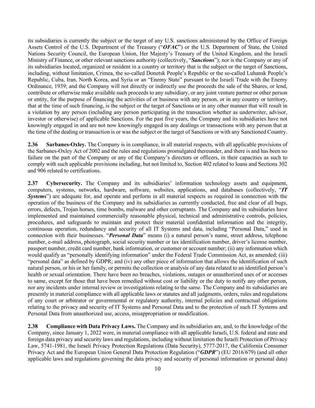 10 its subsidiaries is currently the subject or the target of any U.S. sanctions administered by the Office of Foreign Assets Control of the U.S. Department of the Treasury (“OFAC”) or the U.S. Department of State, the United Nations Security Council, the European Union, Her Majesty’s Treasury of the United Kingdom, and the Israeli Ministry of Finance, or other relevant sanctions authority (collectively, “Sanctions”); nor is the Company or any of its subsidiaries located, organized or resident in a country or territory that is the subject or the target of Sanctions, including, without limitation, Crimea, the so-called Donetsk People’s Republic or the so-called Luhansk People’s Republic, Cuba, Iran, North Korea, and Syria or an “Enemy State” pursuant to the Israeli Trade with the Enemy Ordinance, 1939; and the Company will not directly or indirectly use the proceeds the sale of the Shares, or lend, contribute or otherwise make available such proceeds to any subsidiary, or any joint venture partner or other person or entity, for the purpose of financing the activities of or business with any person, or in any country or territory, that at the time of such financing, is the subject or the target of Sanctions or in any other manner that will result in a violation by any person (including any person participating in the transaction whether as underwriter, advisor, investor or otherwise) of applicable Sanctions. For the past five years, the Company and its subsidiaries have not knowingly engaged in and are not now knowingly engaged in any dealings or transactions with any person that at the time of the dealing or transaction is or was the subject or the target of Sanctions or with any Sanctioned Country. 2.36 Sarbanes-Oxley. The Company is in compliance, in all material respects, with all applicable provisions of the Sarbanes-Oxley Act of 2002 and the rules and regulations promulgated thereunder, and there is and has been no failure on the part of the Company or any of the Company’s directors or officers, in their capacities as such to comply with such applicable provisions including, but not limited to, Section 402 related to loans and Sections 302 and 906 related to certifications. 2.37 Cybersecurity. The Company and its subsidiaries’ information technology assets and equipment, computers, systems, networks, hardware, software, websites, applications, and databases (collectively, “IT Systems”) are adequate for, and operate and perform in all material respects as required in connection with the operation of the business of the Company and its subsidiaries as currently conducted, free and clear of all bugs, errors, defects, Trojan horses, time bombs, malware and other corruptants. The Company and its subsidiaries have implemented and maintained commercially reasonable physical, technical and administrative controls, policies, procedures, and safeguards to maintain and protect their material confidential information and the integrity, continuous operation, redundancy and security of all IT Systems and data, including “Personal Data,” used in connection with their businesses. “Personal Data” means (i) a natural person’s name, street address, telephone number, e-mail address, photograph, social security number or tax identification number, driver’s license number, passport number, credit card number, bank information, or customer or account number; (ii) any information which would qualify as “personally identifying information” under the Federal Trade Commission Act, as amended; (iii) “personal data” as defined by GDPR; and (iv) any other piece of information that allows the identification of such natural person, or his or her family, or permits the collection or analysis of any data related to an identified person’s health or sexual orientation. There have been no breaches, violations, outages or unauthorized uses of or accesses to same, except for those that have been remedied without cost or liability or the duty to notify any other person, nor any incidents under internal review or investigations relating to the same. The Company and its subsidiaries are presently in material compliance with all applicable laws or statutes and all judgments, orders, rules and regulations of any court or arbitrator or governmental or regulatory authority, internal policies and contractual obligations relating to the privacy and security of IT Systems and Personal Data and to the protection of such IT Systems and Personal Data from unauthorized use, access, misappropriation or modification. 2.38 Compliance with Data Privacy Laws. The Company and its subsidiaries are, and, to the knowledge of the Company, since January 1, 2022 were, in material compliance with all applicable Israeli, U.S. federal and state and foreign data privacy and security laws and regulations, including without limitation the Israeli Protection of Privacy Law, 5741-1981, the Israeli Privacy Protection Regulations (Data Security), 5777-2017, the California Consumer Privacy Act and the European Union General Data Protection Regulation (“GDPR”) (EU 2016/679) (and all other applicable laws and regulations governing the data privacy and security of personal information or personal data)